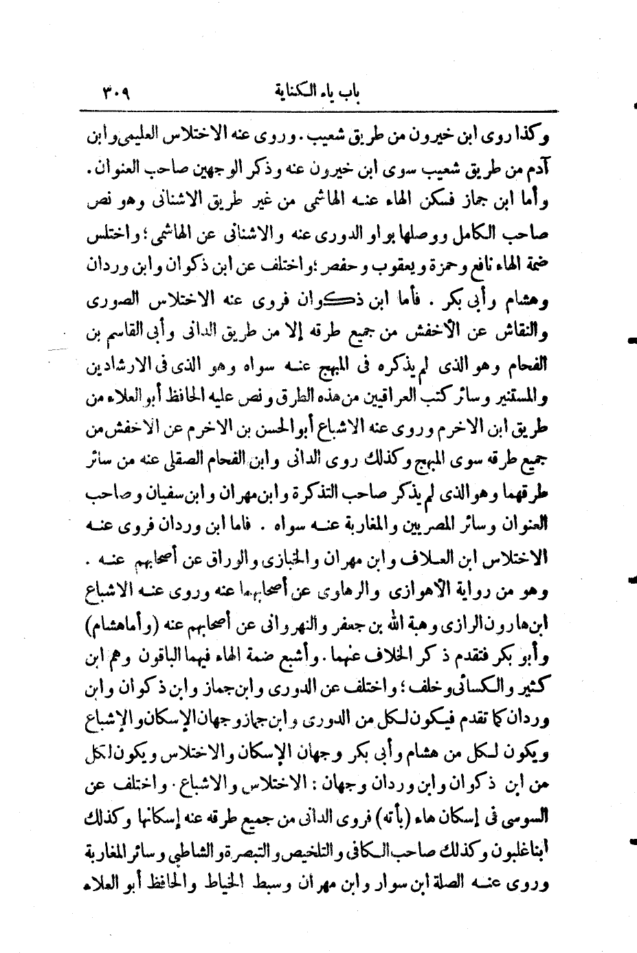 وَكَذَا رَوَى ابْنُ خَيْرُونَ مِنْ طَرِيقِ شُعَيْبٍ. وَرَوَى عَنْهُ الِاخْتِلَاسَ الْعَلِيمِيُّ، وَابْنُ آدَمَ مِنْ طَرِيقِ شُعَيْبٍ سِوَى ابْنِ خَيْرُونَ، عَنْهُ، وَذَكَرَ الْوَجْهَيْنِ صَاحِبُ " الْعُنْوَانِ ". وَأَمَّا ابْنُ جَمَّازٍ فَسَكَّنَ الْهَاءَ عَنْهُ الْهَاشِمِيُّ مِنْ غَيْرِ طَرِيقِ الْأُشْنَانِيِّ، وَهُوَ نَصُّ صَاحِبِ " الْكَامِلِ "، وَوَصَلَهَا بِوَاوٍ الدُّورِيُّ عَنْهُ، وَالْأُشْنَانِيُّ عَنِ الْهَاشِمِيِّ، وَاخْتَلَسَ ضَمَّةَ الْهَاءِ نَافِعٌ وَحَمْزَةُ، وَيَعْقُوبُ، وَحَفْصٌ، وَاخْتُلِفَ عَنِ ابْنِ ذَكْوَانَ وَابْنِ وَرْدَانَ، وَهِشَامٍ وَأَبِي بَكْرٍ، فَأَمَّا ابْنُ ذَكْوَانَ فَرَوَى عَنْهُ الِاخْتِلَاسَ الصُّورِيُّ وَالنَّقَّاشُ، عَنِ الْأَخْفَشِ مِنْ جَمِيعِ طُرُقِهِ إِلَّا مِنْ طَرِيقِ الدَّانِيِّ وَأَبِي الْقَاسِمِ بْنِ الْفَحَّامِ، وَهُوَ الَّذِي لَمْ يَذْكُرْهُ فِي " الْمُبْهِجِ " عَنْهُ سِوَاهُ، وَهُوَ الَّذِي فِي الْإِرْشَادَيْنِ وَ " الْمُسْتَنِيرِ "، وَسَائِرِ كُتُبِ الْعِرَاقِيِّينَ مِنْ هَذِهِ الطُّرُقِ، وَنَصَّ عَلَيْهِ الْحَافِظُ أَبُو الْعَلَاءِ، مِنْ طَرِيقِ ابْنِ الْأَخْرَمِ، وَرَوَى عَنْهُ الْإِشْبَاعَ أَبُو الْحَسَنِ بْنُ الْأَخْرَمِ، عَنِ الْأَخْفَشِ مِنْ جَمِيعِ طُرُقِهِ سِوَى " الْمُبْهِجِ "، وَكَذَلِكَ رَوَى الدَّانِيُّ وَابْنُ الْفَحَّامِ الصَّقَلِّيُّ عَنْهُ مِنْ سَائِرِ طُرُقِهِمَا، وَهُوَ الَّذِي لَمْ يَذْكُرْ صَاحِبُ " التَّذْكِرَةِ "، وَابْنُ مِهْرَانَ وَابْنُ سُفْيَانَ، وَصَاحِبُ " الْعُنْوَانِ "، وَسَائِرُ الْمِصْرِيِّينَ وَالْمَغَارِبَةِ عَنْهُ سِوَاهُ، فَأَمَّا ابْنُ وَرْدَانَ فَرَوَى عَنْهُ الِاخْتِلَاسَ ابْنُ الْعَلَّافِ وَابْنُ مِهْرَانَ وَالْخَبَّازِيُّ، وَالْوَرَّاقُ، عَنْ أَصْحَابِهِمْ، عَنْهُ، وَهُوَ مِنْ رِوَايَةِ الْأَهْوَازِيِّ، وَالرَّهَاوِيِّ، عَنْ أَصْحَابِهِمَا، عَنْهُ، وَرَوَى عَنْهُ الْإِشْبَاعَ ابْنُ هَارُونَ الرَّازِيُّ وَهِبَةُ اللَّهِ بْنُ جَعْفَرٍ، وَالنَّهْرَوَانِيُّ، عَنْ أَصْحَابِهِمْ، عَنْهُ، (وَأَمَّا هِشَامٌ) ، وَأَبُو بَكْرٍ فَتَقَدَّمَ ذِكْرُ الْخِلَافِ عَنْهُمَا، وَأَشْبَعَ ضَمَّةَ الْهَاءِ فِيهِمَا الْبَاقُونَ، وَهُمُ ابْنُ كَثِيرٍ، وَالْكِسَائِيُّ، وَخَلَفٌ، وَاخْتُلِفَ عَنِ الدُّورِيِّ، وَابْنِ جَمَّازٍ، وَابْنِ ذَكْوَانَ، وَابْنِ وَرْدَانَ كَمَا تَقَدَّمَ، فَيَكُونُ لِكُلٍّ مَنَ الدُّورِيِّ، وَابْنِ جَمَّازٍ وَجْهَانِ: الْإِسْكَانُ وَالْإِشْبَاعُ، وَيَكُونُ لِكُلٍّ مِنْ هِشَامٍ وَأَبِي بَكْرٍ وَجْهَانِ: الْإِسْكَانُ وَالِاخْتِلَاسُ، وَيَكُونُ لِكُلٍّ مِنِ ابْنِ ذَكْوَانَ، وَابْنِ وَرْدَانَ وَجْهَانِ: الِاخْتِلَاسُ وَالْإِشْبَاعُ.