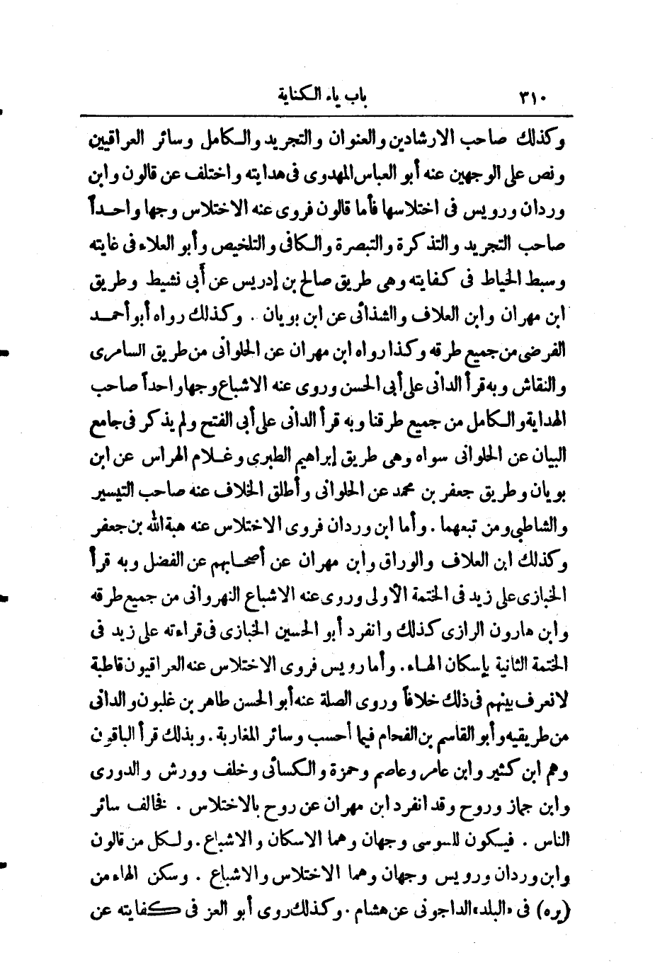 وَكَذَلِكَ صَاحِبُ الْإِرْشَادَيْنِ وَ " الْعُنْوَانِ "، وَ " التَّجْرِيدِ "، وَ " الْكَامِلِ "، سَائِرُ الْعِرَاقِيِّينَ، وَنَصَّ عَلَى الْوَجْهَيْنِ عَنْهُ أَبُو الْعَبَّاسِ الْمَهْدَوِيُّ فِي هِدَايَتِهِ، وَاخْتُلِفَ عَنْ قَالُونَ وَابْنِ وَرْدَانَ، وَرُوَيْسٍ فِي اخْتِلَاسِهَا، فَأَمَّا قَالُونُ فَرَوَى عَنْهُ الِاخْتِلَاسَ وَجْهًا وَاحِدًا صَاحِبُ " التَّجْرِيدِ "، وَ " التَّذْكِرَةِ "، وَ " التَّبْصِرَةِ "، وَ " الْكَافِي "، وَ " التَّلْخِيصِ "، وَأَبُو الْعَلَاءِ فِي غَايَتِهِ، وَسِبْطُ الْخَيَّاطِ فِي كِفَايَتِهِ، وَهِيَ طَرِيقُ صَالِحِ بْنِ إِدْرِيسَ، عَنْ أَبِي نَشِيطٍ، وَطَرِيقُ ابْنِ مِهْرَانَ، وَابْنِ الْعَلَّافِ وَالشَّذَائِيِّ، عَنِ ابْنِ بُويَانَ. وَكَذَلِكَ رَوَاهُ ابْنُ مِهْرَانَ عَنِ الْحُلْوَانِيِّ مِنْ طَرِيقِ السَّامَرِّيِّ وَالنَّقَّاشِ، وَبِهِ قَرَأَ الدَّانِيُّ عَلَى أَبِي الْحَسَنِ، وَرَوَى عَنْهُ الْإِشْبَاعَ وَجْهًا وَاحِدًا صَاحِبُ " الْهِدَايَةِ "، وَ " الْكَامِلِ " مِنْ جَمِيعِ طُرُقِنَا، وَبِهِ قَرَأَ الدَّانِيُّ عَلَى أَبِي الْفَتْحِ، وَلَمْ يُذْكَرْ فِي " جَامِعِ الْبَيَانِ " عَنِ الْحُلْوَانِيِّ سِوَاهُ، وَهِيَ طَرِيقُ إِبْرَاهِيمَ الطَّبَرِيِّ، وَغُلَامِ الْهَرَّاسِ، عَنْ أَبِي بُويَانَ، وَطَرِيقُ جَعْفَرِ بْنِ مُحَمَّدٍ، عَنِ الْحُلْوَانِيِّ، وَأَطْلَقَ الْخِلَافَ عَنْهُ صَاحِبُ " التَّيْسِيرِ "، وَالشَّاطِبِيُّ، وَمَنْ تَبِعَهُمَا، وَأَمَّا ابْنُ وَرْدَانَ فَرَوَى الِاخْتِلَاسَ عَنْهُ هِبَةُ اللَّهِ بْنُ جَعْفَرٍ، وَكَذَلِكَ ابْنُ الْعَلَّافِ، وَالْوَرَّاقُ، وَابْنُ مِهْرَانَ، عَنْ أَصْحَابِهِمْ، عَنِ الْفَضْلِ، وَبِهِ قَرَأَ الْخَبَّازِيُّ عَلَى زَيْدٍ فِي الْخَتْمَةِ الْأُولَى، وَرَوَى عَنْهُ الْإِشْبَاعَ النَّهْرَوَانِيُّ مِنْ جَمِيعِ طُرُقِهِ، وَابْنُ هَارُونَ الرَّازِيُّ كَذَلِكَ، وَانْفَرَدَ أَبُو الْحُسَيْنِ الْخَبَّازِيُّ فِي قِرَاءَتِهِ عَلَى زَيْدٍ فِي الْخَتْمَةِ الثَّانِيَةِ بِإِسْكَانِ الْهَاءِ، وَأَمَّا رُوَيْسٌ، فَرَوَى الِاخْتِلَاسَ عَنْهُ الْعِرَاقِيُّونَ قَاطِبَةً، لَا نَعْرِفُ بَيْنَهُمْ فِي ذَلِكَ خِلَافًا، وَرَوَى الصِّلَةَ عَنْهُ أَبُو الْحَسَنِ طَاهِرُ بْنُ غَلْبُونَ، وَالدَّانِيُّ مِنْ طَرِيقَيْهِ، وَأَبُو الْقَاسِمِ بْنُ الْفَحَّامِ فِيمَا أَحْسَبُ، وَسَائِرُ الْمَغَارِبَةِ، وَبِذَلِكَ، قَرَأَ الْبَاقُونَ، وَهُوَ ابْنُ كَثِيرٍ، وَابْنُ عَامِرٍ، وَعَاصِمٌ، وَحَمْزَةُ وَالْكِسَائِيُّ وَخَلَفٌ وَوَرْشٌ وَالدُّورِيُّ وَابْنُ جَمَّازٍ وَرَوْحٌ، وَقَدِ انْفَرَدَ مِهْرَانُ، عَنْ رَوْحٍ بِالِاخْتِلَاسِ، فَخَالَفَ سَائِرَ النَّاسِ، فَيَكُونُ لِلسُّوسِيِّ وَجْهَانِ، وَهُمَا الْإِسْكَانُ وَالْإِشْبَاعُ، وَلِكُلٍّ مِنْ قَالُونَ، وَابْنِ وَرْدَانَ، وَرُوَيْسٍ وَجْهَانِ، وَهُمَا الِاخْتِلَاسُ وَالْإِشْبَاعُ.