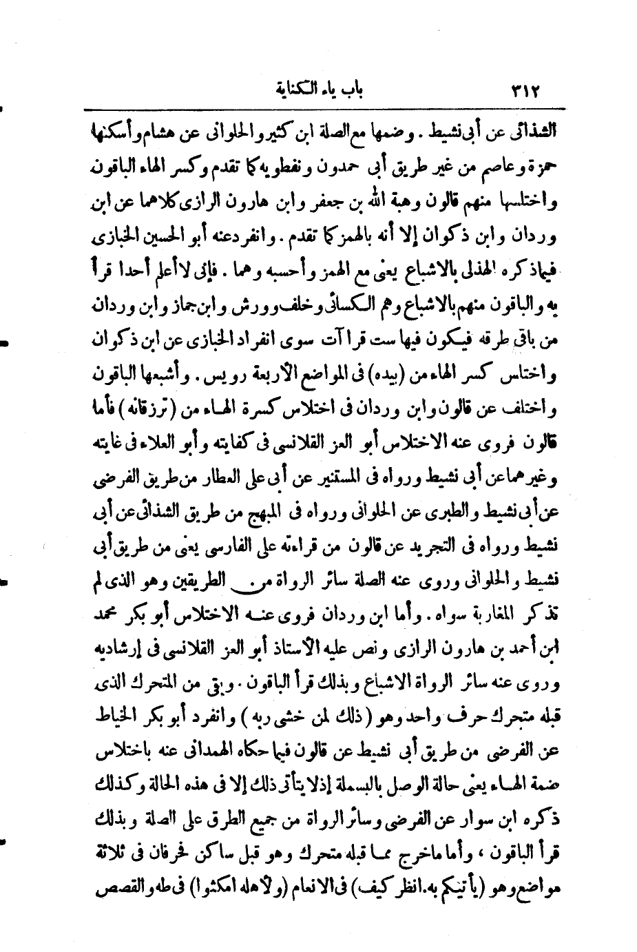 الشَّذَائِيُّ، عَنْ أَبِي نَشِيطٍ، وَضَمَّهَا مَعَ الصِّلَةِ ابْنُ كَثِيرٍ وَالْحُلْوَانِيُّ، عَنْ هِشَامٍ، وَأَسْكَنَهَا حَمْزَةُ مِنْ غَيْرِ طَرِيقِ أَبِي حَمْدُونَ وَنِفْطَوَيْهِ كَمَا تَقَدَّمَ، وَكَسَرَ الْهَاءَ الْبَاقُونَ، وَاخْتَلَسَهَا مِنْهُمْ قَالُونُ، وَهِبَةُ اللَّهِ بْنُ جَعْفَرٍ وَابْنُ هَارُونَ الرَّازِيُّ، كِلَاهُمَا عَنِ ابْنِ وَرْدَانَ وَابْنِ ذَكْوَانَ، إِلَّا أَنَّهُ بِالْهَمْزَةِ كَمَا تَقَدَّمَ، وَانْفَرَدَ عَنْهُ أَبُو الْحُسَيْنِ الْخَبَّازِيُّ فِيمَا ذَكَرَهُ الْهُذَلِيُّ بِالْإِشْبَاعِ - يَعْنِي مَعَ الْهَمْزِ - وَأَحْسَبُهُ وَهْمًا؛ فَإِنِّي لَا أَعْلَمُ أَحَدًا قَرَأَ بِهِ، وَالْبَاقُونَ مِنْهُمْ بِالْإِشْبَاعِ، وَهُمُ الْكِسَائِيُّ، وَخَلَفٌ، وَوَرْشٌ وَابْنُ جَمَّازٍ وَابْنُ وَرْدَانَ مِنْ بَاقِي طُرُقِهِ، فَيَكُونُ فِيهِ سِتُّ قِرَاءَاتٍ سِوَى انْفِرَادِ الْخَبَّازِيِّ عَنِ ابْنِ ذَكْوَانَ وَاخْتَلَسَ كَسْرَ الْهَاءِ مِنْ (بِيَدِهِ) فِي الْمَوَاضِعِ الْأَرْبَعَةِ رُوَيْسٌ، وَأَشْبَعَهَا الْبَاقُونَ. وَاخْتُلِفَ، عَنْ قَالُونَ وَابْنِ وَرْدَانَ فِي اخْتِلَاسِ كَسْرَةِ الْهَاءِ مِنْ (تُرْزَقَانِهِ) فَأَمَّا قَالُونُ فَرَوَى عَنْهُ الِاخْتِلَاسَ أَبُو الْعِزِّ الْقَلَانِسِيُّ فِي كِفَايَتِهِ، وَأَبُو الْعَلَاءِ فِي غَايَتِهِ، وَغَيْرُهُمَا، عَنْ أَبِي نَشِيطٍ، وَرَوَاهُ فِي " الْمُسْتَنِيرِ "، عَنْ أَبِي عَلِيٍّ الْعَطَّارِ مِنْ طَرِيقِ الْفَرْضِيِّ عَنْ أَبِي نَشِيطٍ، وَالطَّبَرِيِّ عَنِ الْحُلْوَانِيِّ، وَرَوَاهُ فِي " الْمُبْهِجِ " مِنْ طَرِيقِ الشَّذَائِيِّ، عَنْ أَبِي نَشِيطٍ، وَرَوَاهُ فِي التَّجْرِيدِ، عَنْ قَالُونَ مِنْ قِرَاءَتِهِ عَلَى الْفَارِسِيِّ، يَعْنِي مِنْ طَرِيقِ أَبِي نَشِيطٍ وَالْحُلْوَانِيِّ، وَرَوَى عَنْهُ الصِّلَةَ سَائِرُ الرُّوَاةِ مِنَ الطَّرِيقَيْنِ، وَهُوَ الَّذِي لَمْ تَذْكُرِ الْمَغَارِبَةُ سِوَاهُ. وَأَمَّا ابْنُ وَرْدَانَ فَرَوَى عَنْهُ الِاخْتِلَاسَ أَبُو بَكْرٍ مُحَمَّدُ بْنُ أَحْمَدَ بْنِ هَارُونَ الرَّازِيُّ، وَنَصَّ عَلَيْهِ الْأُسْتَاذُ أَبُو الْعِزِّ الْقَلَانِسِيُّ فِي إِرْشَادَيْهِ، وَرَوَى عَنْهُ سَائِرُ الرُّوَاةِ الْإِشْبَاعَ، وَبِذَلِكَ قَرَأَ الْبَاقُونَ، وَبَقِيَ مِنَ الْمُتَحَرِّكِ الَّذِي قَبْلَهُ مُتَحَرِّكٌ حَرْفٌ وَاحِدٌ، وَهُوَ " ذَلِكَ لِمَنْ خَشِيَ رَبَّهُ " وَانْفَرَدَ أَبُو بَكْرٍ الْخَيَّاطُ عَنِ الْفَرْضِيِّ، مِنْ طَرِيقِ أَبِي نَشِيطٍ، عَنْ قَالُونَ فِيمَا حَكَاهُ الْهَمْدَانِيُّ عَنْهُ بِاخْتِلَاسِ ضَمَّةِ الْهَاءِ - يَعْنِي حَالَةَ الْوَصْلِ بِالْبَسْمَلَةِ - إِذْ لَا يَتَأَتَّى ذَلِكَ إِلَّا فِي هَذِهِ الْحَالَةِ، وَكَذَلِكَ ذَكَرَهُ ابْنُ سَوَّارٍ عَنِ الْفَرْضِيِّ، وَسَائِرُ الرُّوَاةِ مِنْ جَمِيعِ الطُّرُقِ عَلَى الصِّلَةِ، وَبِذَلِكَ قَرَأَ الْبَاقُونَ.