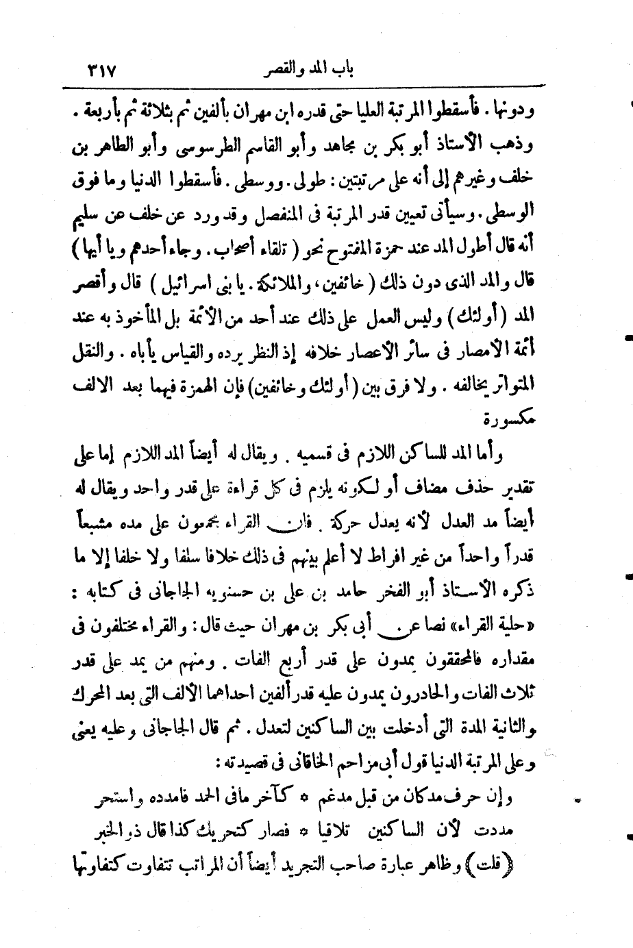 وَدُونَهَا. فَأَسْقَطُوا الْمَرْتَبَةَ الْعُلْيَا حَتَّى قَدَّرَهُ ابْنُ مِهْرَانَ بِأَلِفَيْنِ، ثُمَّ بِثَلَاثَةٍ، ثُمَّ بِأَرْبَعَةٍ. وَذَهَبَ الْأُسْتَاذُ أَبُو بَكْرِ بْنُ مُجَاهِدٍ وَأَبُو الْقَاسِمِ الطَّرَسُّوسِيُّ وَأَبُو الطَّاهِرِ بْنُ خَلَفٍ إِلَى أَنَّهُ عَلَى مَرْتَبَتَيْنِ: طُولَى، وَوُسْطَى، فَأَسْقَطُوا الدُّنْيَا وَمَا فَوْقَ الْوُسْطَى، وَسَيَأْتِي تَعْيِينُ قَدْرِ الْمَرْتَبَةِ فِي الْمُنْفَصِلِ، وَقَدْ وَرَدَ عَنْ خَلَفٍ، عَنْ سُلَيْمٍ قَالَ: أَطْوَلُ الْمَدِّ عِنْدَ حَمْزَةَ الْمَفْتُوحُ نَحْوُ (تِلْقَاءَ أَصْحَابِ) ، وَ (جَاءَ أَحَدَهُمْ) ، وَ (يَا أَيُّهَا) قَالَ: وَالْمَدُّ الَّذِي دُونَ ذَلِكَ (خَائِفِينَ) ، وَ (الْمَلَائِكَةُ) . (يَا بَنِي إِسْرَائِيلَ) قَالَ: وَأَقْصَرُ الْمَدِّ (أُولَئِكَ) وَلَيْسَ الْعَمَلُ عَلَى ذَلِكَ عِنْدَ أَحَدٍ مِنَ الْأَئِمَّةِ، بَلِ الْمَأْخُوذُ بِهِ عِنْدَ أَئِمَّةِ الْأَمْصَارِ فِي سَائِرِ الْأَعْصَارِ خِلَافُهُ؛ إِذِ النَّظَرُ يَرُدُّهُ، وَالْقِيَاسُ يَأْبَاهُ، وَالنَّقْلُ الْمُتَوَاتِرُ يُخَالِفُهُ، وَلَا فَرْقَ بَيْنَ (أُولَئِكَ) وَ (خَائِفِينَ) فَإِنَّ الْهَمْزَةَ فِيهَا بَعْدَ الْأَلِفِ مَكْسُورَةٌ.
