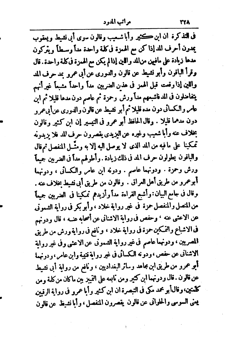 فِي " التَّذْكِرَةِ " إِنَّ ابْنَ كَثِيرٍ، وَأَبَا شُعَيْبٍ وَقَالُونَ، سِوَى أَبِي نَشِيطٍ وَيَعْقُوبَ - يَمُدُّونَ أَحْرُفَ الْمَدِّ إِذَا كُنَّ مَعَ الْهَمْزَةِ فِي كَلِمَةٍ وَاحِدَةٍ مَدًّا وَسَطًا، وَيَتْرُكُونَ مَدَّهَا زِيَادَةً عَلَى مَا فِيهِنَّ مِنَ الْمَدِّ وَاللِّينِ إِذَا لَمْ يَكُنْ مَعَ الْهَمْزَةِ فِي كَلِمَةٍ وَاحِدَةٍ. قَالَ: وَقَرَأَ الْبَاقُونَ وَأَبُو نَشِيطٍ، عَنْ قَالُونَ، وَالدُّورِيِّ، عَنْ أَبِي عَمْرٍو بِمَدِّ حَرْفِ الْمَدِّ وَاللِّينِ إِذَا وَقَعَتْ قَبْلَ الْهَمْزِ فِي هَذَيْنِ الضَّرْبَيْنِ مَدًّا وَاحِدًا مُشْبَعًا غَيْرَ أَنَّهُمْ يَتَفَاضَلُونَ فِي الْمَدِّ، فَأَشْبَعُهُمْ مَدًّا وَرْشٌ وَحَمْزَةُ، ثُمَّ عَاصِمٌ دُونَ مَدِّهَا قَلِيلًا، ثُمَّ ابْنُ عَامِرٍ وَالْكِسَائِيُّ دُونَ مَدِّهِ قَلِيلًا، ثُمَّ أَبُو نَشِيطٍ عَنْ قَالُونَ، وَالدُّورِيُّ، عَنْ أَبِي عَمْرٍو دُونَ مَدِّهِمَا قَلِيلًا، وَقَالَ الْحَافِظُ أَبُو عَمْرٍو فِي التَّيْسِيرِ: إِنَّ ابْنَ كَثِيرٍ وَقَالُونَ - بِخِلَافٍ عَنْهُ - وَأَبَا شُعَيْبٍ وَغَيْرَهُ عَنِ الْيَزِيدِيِّ يَقْصُرُونَ حَرْفَ الْمَدِّ، فَلَا يَزِيدُونَهُ تَمْكِينًا عَلَى مَا فِيهِ مِنَ الْمَدِّ الَّذِي لَا يُوصَلُ إِلَيْهِ إِلَّا بِهِ، وَمَثَّلَ الْمُنْفَصِلَ ثُمَّ قَالَ: وَالْبَاقُونَ يُطَوِّلُونَ حَرْفَ الْمَدِّ فِي ذَلِكَ زِيَادَةً، وَأَطْوَلُهُمْ مَدًّا فِي الضَّرْبَيْنِ جَمِيعًا وَرْشٌ وَحَمْزَةُ، وَدُونَهُمَا عَاصِمٌ، وَدُونَهُ ابْنُ عَامِرٍ وَالْكِسَائِيُّ، وَدُونَهُمَا أَبُو عَمْرٍو مِنْ طَرِيقِ أَهْلِ الْعِرَاقِ، وَقَالُونُ مِنْ طَرِيقٍ أَبِي نَشِيطٍ بِخِلَافٍ عَنْهُ، وَقَالَ فِي " جَامِعِ الْبَيَانِ ": وَأَشْبَعُ الْقِرَاءَةِ مَدًّا وَأَزْيَدُهُمْ تَمْكِينًا فِي الضَّرْبَيْنِ جَمِيعًا مِنَ الْمُتَّصِلِ وَالْمُنْفَصِلِ حَمْزَةُ فِي غَيْرِ رِوَايَةِ خَلَّادٍ وَأَبُو بَكْرٍ فِي رِوَايَةِ الشَّمُونِيِّ عَنِ الْأَعْشَى، عَنْهُ، وَحَفْصٌ فِي رِوَايَةِ الْأُشْنَانِيِّ، عَنْ أَصْحَابِهِ، عَنْهُ، قَالَ: وَدُونَهُمْ فِي الْإِشْبَاعِ وَالتَّمْكِينِ حَمْزَةُ فِي رِوَايَةِ خَلَّادٍ وَنَافِعٌ فِي رِوَايَةِ وَرْشٍ مِنْ طَرِيقِ الْمِصْرِيِّينَ، وَدُونَهُمَا عَاصِمٌ فِي رِوَايَةِ الشَّمُونِيِّ عَنِ الْأَعْشَى، وَفِي غَيْرِ رِوَايَةِ الْأُشْنَانِيِّ، عَنْ حَفْصٍ، وَدُونَهُ الْكِسَائِيُّ فِي غَيْرِ رِوَايَةِ قُتَيْبَةَ وَابْنِ عَامِرٍ، وَدُونَهُمَا أَبُو عَمْرٍو مِنْ طَرِيقِ ابْنِ مُجَاهِدٍ وَسَائِرِ الْبَغْدَادِيِّينَ، وَنَافِعٌ مِنْ رِوَايَةِ أَبِي نَشِيطٍ عَنْ قَالُونَ. قَالَ: وَدُونَهُمَا ابْنُ كَثِيرٍ وَمَنْ تَابَعَهُ عَلَى التَّمَيُّزِ بَيْنَ مَا كَانَ مِنْ كَلِمَةٍ وَمِنْ كَلِمَتَيْنِ، وَقَالَ أَبُو مُحَمَّدٍ مَكِّيٌّ فِي التَّبْصِرَةِ: إِنَّ ابْنَ كَثِيرٍ وَأَبَا عَمْرٍو فِي رِوَايَةِ الْعِرَاقِيِّينَ - يَعْنِي السُّوسِيَّ وَالْحُلْوَانِيَّ - عَنْ قَالُونَ يَقْصُرُونَ الْمُنْفَصِلَ، وَأَبَا نَشِيطٍ، عَنْ قَالُونَ