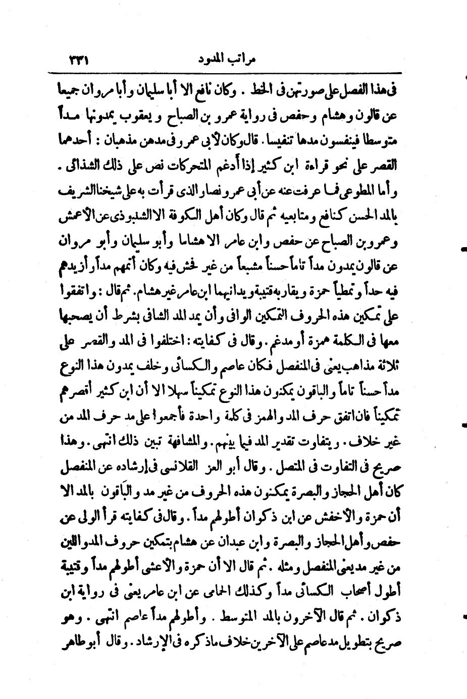 قَالَ: وَكَانَ لِأَبِي عَمْرٍو فِي مَدِّهِنَّ مَذْهَبَانِ: أَحَدُهُمَا الْقَصْرُ عَلَى نَحْوِ قِرَاءَةِ ابْنِ كَثِيرٍ إِذَا أَدْغَمَ الْمُتَحَرِّكَاتِ، نَصَّ عَلَى ذَلِكَ الشَّذَائِيُّ، وَأَمَّا الْمُطَّوِّعِيُّ فَمَا عَرَفْتُ عَنْهُ عَنْ أَبِي عَمْرٍو نَصًّا، وَالَّذِي قَرَأْتُ بِهِ عَلَى شَيْخِنَا الشَّرِيفِ بِالْمَدِّ الْحَسَنِ كَنَافِعٍ وَمُتَابِعِيهِ، ثُمَّ قَالَ: وَكَانَ أَهْلُ الْكُوفَةِ إِلَّا الشَّنَبُوذِيَّ عَنِ الْأَعْمَشِ وَعَمْرِو بْنِ الصَّبَّاحِ وَابْنِ عَامِرٍ إِلَّا هِشَامًا وَأَبُو سُلَيْمَانَ وَأَبُو مَرْوَانَ، عَنْ قَالُونَ يَمُدُّونَ مَدًّا تَامًّا حَسَنًا مُشْبَعًا مِنْ غَيْرِ فُحْشٍ فِيهِ، وَكَانَ أَتَمُّهُمْ مَدًّا وَأَزْيَدُهُمْ فِيهِ حَدًّا وَتَمَطِّيًا حَمْزَةَ، وَيُقَارِبُهُ قُتَيْبَةُ وَيُدَانِيهِمَا ابْنُ عَامِرٍ غَيْرَ هِشَامٍ. ثُمَّ قَالَ: وَاتَّفَقُوا عَلَى تَمْكِينِ هَذِهِ الْحُرُوفِ التَّمْكِينَ الْوَافِيَ، وَأَنْ يُمَدَّ الْمَدُّ الشَّافِي بِشَرْطِ أَنْ يَصْحَبَهَا مَعَهَا فِي الْكَلِمَةِ هَمْزَةٌ، أَوْ مُدْغَمٌ.