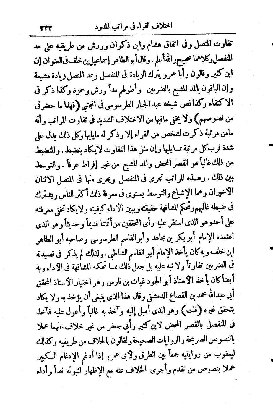 وَقَالَ أَبُو الطَّاهِرِ إِسْمَاعِيلُ بْنُ خَلَفٍ فِي " الْعُنْوَانِ ": إِنَّ ابْنَ كَثِيرٍ وَقَالُونَ وَأَبَا عَمْرٍو يَتْرُكُ الزِّيَادَةَ فِي الْمُنْفَصِلِ وَيَمُدُّ الْمُتَّصِلَ زِيَادَةً مُشْبَعَةً، وَإِنَّ الْبَاقِينَ بِالْمَدِّ الْمُشْبَعِ بِالضَّرْبَيْنِ، وَأَطْوَلُهُمْ مَدًّا وَرْشٌ وَحَمْزَةُ، كَذَا ذَكَرَ فِي " الِاكْتِفَاءِ "، وَكَذَا نَصَّ شَيْخُهُ عَبْدُ الْجَبَّارِ الطَّرَسُوسِيُّ فِي " الْمُجْتَبَى ": (فَهَذَا مَا حَضَرَنِي مِنْ نُصُوصِهِمْ) وَلَا يَخْفَى مَا فِيهَا مِنَ الِاخْتِلَافِ الشَّدِيدِ فِي تَفَاوُتِ الْمَرَاتِبِ، وَإِنَّهُ مَا مِنْ مَرْتَبَةٍ ذُكِرَتْ لِشَخْصٍ مِنَ الْقُرَّاءِ إِلَّا وَذُكِرَ لَهُ مَا يَلِيهَا، وَكُلُّ ذَلِكَ يَدُلُّ عَلَى شِدَّةِ قُرْبِ كُلِّ مَرْتَبَةٍ مِمَّا يَلِيهَا، وَإِنَّ مِثْلَ هَذَا التَّفَاوُتِ لَا يَكَادُ يَنْضَبِطُ، وَالْمُنْضَبِطُ مِنْ ذَلِكَ غَالِبًا هُوَ الْقَصْرُ الْمَحْضُ وَالْمَدُّ الْمُشْبَعُ مِنْ غَيْرِ إِفْرَاطٍ عُرْفًا، وَالتَّوَسُّطُ بَيْنَ ذَلِكَ. وَهَذِهِ الْمَرَاتِبُ تَجْرِي فِي الْمُنْفَصِلِ، وَيَجْرِي مِنْهَا فِي الْمُتَّصِلِ الِاثْنَانِ الْأَخِيرَانِ، وَهُمَا الْإِشْبَاعُ وَالتَّوَسُّطُ، يَسْتَوِي فِي مَعْرِفَةِ ذَلِكَ أَكْثَرُ النَّاسِ، وَيَشْتَرِكُ فِي ضَبْطِهِ غَالِبِيَّتُهُمْ، وَتَحْكُمُ الْمُشَافَهَةُ حَقِيقَتَهُ، وَيُبَيِّنُ الْأَدَاءُ كَيْفِيَّتَهُ، وَلَا يَكَادُ تَخْفَى مَعْرِفَتُهُ عَلَى أَحَدٍ، وَهُوَ الَّذِي اسْتَقَرَّ عَلَيْهِ رَأْيُ الْمُحَقِّقِينَ مِنْ أَئِمَّتِنَا قَدِيمًا وَحَدِيثًا، وَهُوَ الَّذِي اعْتَمَدَهُ الْإِمَامُ أَبُو بَكْرِ بْنُ مُجَاهِدٍ وَأَبُو الْقَاسِمِ الطَّرَسُوسِيُّ، وَصَاحِبُهُ أَبُو الطَّاهِرِ بْنُ خَلَفٍ، وَبِهِ كَانَ يَأْخُذُ الْإِمَامُ أَبُو الْقَاسِمِ الشَّاطِبِيُّ ; وَلِذَلِكَ لَمْ يَذْكُرْ فِي قَصِيدَتِهِ فِي الضَّرْبَيْنِ تَفَاوُتًا، وَلَا نَبَّهَ عَلَيْهِ، بَلْ جَعَلَ ذَلِكَ مِمَّا تَحْكُمُهُ الْمُشَافَهَةُ فِي الْأَدَاءِ، وَبِهِ أَيْضًا كَانَ يَأْخُذُ الْأُسْتَاذُ أَبُو الْجُودِ غِيَاثُ بْنُ فَارِسٍ، وَهُوَ اخْتِيَارُ الْأُسْتَاذِ الْمُحَقِّقِ أَبِي عَبْدِ اللَّهِ مُحَمَّدِ بْنِ الْقَصَّاعِ الدِّمَشْقِيِّ، وَقَالَ: هَذَا الَّذِي يَنْبَغِي أَنْ يُؤْخَذَ بِهِ، وَلَا يَكَادُ يَتَحَقَّقُ غَيْرُهُ.