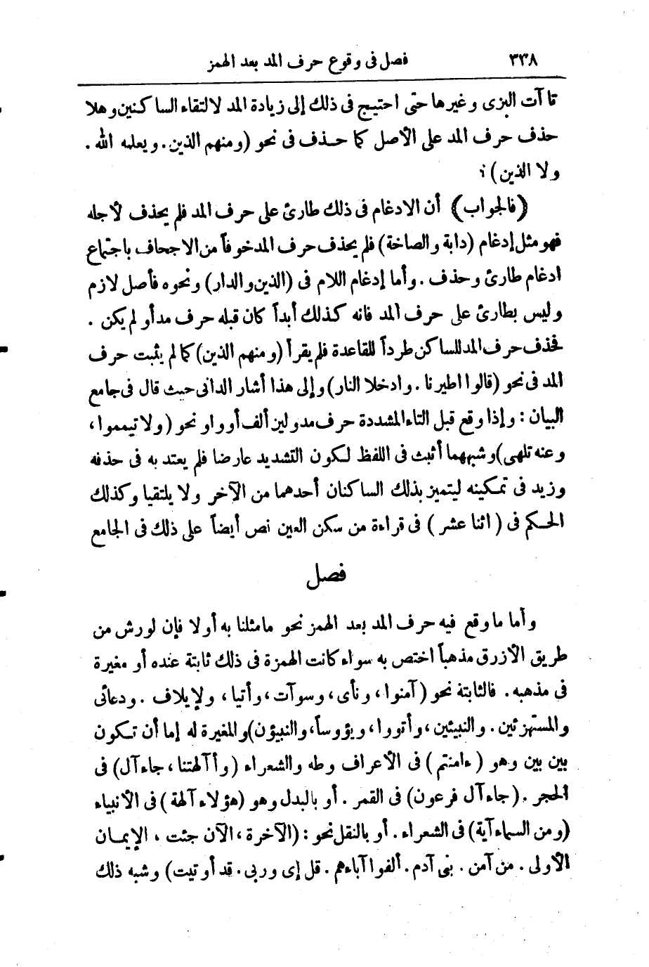 (فَالْجَوَابُ) أَنَّ الْإِدْغَامَ فِي ذَلِكَ طَارِئٌ عَلَى حَرْفِ الْمَدِّ، فَلَمْ يُحْذَفْ لِأَجْلِهِ، فَهُوَ مِثْلُ إِدْغَامِ (دَابَّةٍ) وَ (الصَّاخَّةُ) فَلَمْ يُحْذَفْ حَرْفُ الْمَدِّ خَوْفًا مِنَ الْإِجْحَافِ بِاجْتِمَاعِ إِدْغَامٍ طَارِئٍ وَحَذْفٍ، وَأَمَّا إِدْغَامُ اللَّامِ فِي (الَّذِينَ) وَ (الدَّارُ) وَنَحْوِهِ فَأَصْلٌ لَازِمٌ، وَلَيْسَ بِطَارِئٍ عَلَى حَرْفِ الْمَدِّ، فَإِنَّهُ كَذَلِكَ أَبَدًا - كَانَ قَبْلَهُ حَرْفُ مَدٍّ أَوَ لَمْ يَكُنْ، فَحَذْفُ حَرْفِ الْمَدِّ لِلسَّاكِنِ طَرْدًا لِلْقَاعِدَةِ فَلَمْ يَقْرَأْ (وَمِنْهُمُ الَّذِينَ) كَمَا لَمْ يَثْبُتْ حَرْفُ الْمَدِّ فِي نَحْوِ (قَالُوا اطَّيَّرْنَا) ، وَ (ادْخُلَا النَّارَ) وَإِلَى هَذَا أَشَارَ الدَّانِيُّ حَيْثُ قَالَ فِي " جَامِعِ الْبَيَانِ ": وَإِذَا وَقَعَ قَبْلَ التَّاءِ الْمُشَدَّدَةِ حَرْفُ مَدٍّ وَلِينٍ - أَلِفٌ أَوْ وَاوٌ - نَحْوُ (" وَلَا تَيَمَّمُوا "، وَ " عَنْهُ تَلَهَّى ") وَشِبْهُهُمَا أُثْبِتَ فِي اللَّفْظِ؛ لِكَوْنِ التَّشْدِيدِ عَارِضًا، فَلَمْ يُعْتَدَّ بِهِ فِي حَذْفِهِ، وَزِيدَ فِي تَمْكِينِهِ لِيَتَمَيَّزَ بِذَلِكَ السَّاكِنَانِ أَحَدُهُمَا مِنَ الْآخَرِ وَلَا يَلْتَقِيَا، وَكَذَلِكَ الْحُكْمُ فِي (اثْنَا عَشَرَ) فِي قِرَاءَةِ مَنْ سَكَّنَ الْعَيْنَ. نَصَّ أَيْضًا عَلَى ذَلِكَ فِي " الْجَامِعِ ".