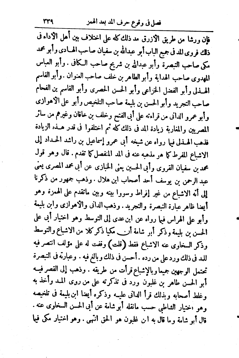 (قُلْتُ) : وَقَفْتُ لَهُ عَلَى مُؤَلَّفٍ انْتَصَرَ فِيهِ لِلْمَدِّ فِي ذَلِكَ وَرَدَّ عَلَى مَنْ رَدَّهُ، أَحْسَنَ فِي ذَلِكَ وَبَالَغَ فِيهِ، وَعِبَارَتُهُ فِي " التَّبْصِرَةِ " تَحْتَمِلُ الْوَجْهَيْنِ جَمِيعًا، وَبِالْإِشْبَاعِ قَرَأْتُ مِنْ طَرِيقِهِ، وَذَهَبَ إِلَى الْقَصْرِ فِيهِ أَبُو الْحَسَنِ طَاهِرُ بْنُ غَلْبُونَ، وَرَدَّ فِي تَذْكِرَتِهِ عَلَى مَنْ رَوَى الْمَدَّ وَأَخَذَ بِهِ، وَغَلَّطَ أَصْحَابَهُ، وَبِذَلِكَ قَرَأَ الدَّانِيُّ عَلَيْهِ، وَذَكَرَهُ أَيْضًا ابْنُ بَلِّيمَةَ فِي تَلْخِيصِهِ، وَهُوَ اخْتِيَارُ الشَّاطِبِيِّ حَسْبَ مَا نَقَلَهُ أَبُو شَامَةَ، عَنْ أَبِي الْحَسَنِ السَّخَاوِيِّ، عَنْهُ، قَالَ أَبُو شَامَةَ: وَمَا قَالَ بِهِ ابْنُ غَلْبُونَ هُوَ الْحَقُّ. انْتَهَى. وَهُوَ اخْتِيَارُ مَكِّيٍّ فِيمَا