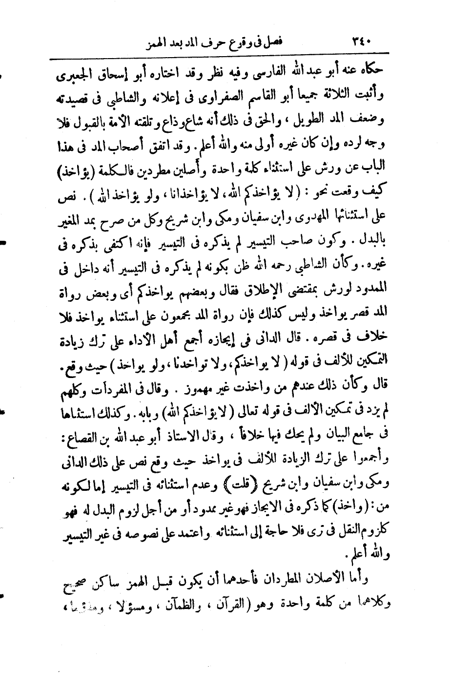 حَكَاهُ عَنْهُ أَبُو عَبْدِ اللَّهِ الْفَارِسِيُّ، وَفِيهِ نَظَرٌ، وَقَدِ اخْتَارَهُ أَبُو إِسْحَاقَ الْجَعْبَرِيُّ، وَأَثْبَتَ الثَّلَاثَةَ جَمِيعًا أَبُو الْقَاسِمِ الصَّفْرَاوِيُّ فِي إِعْلَانِهِ، وَالشَّاطِبِيُّ فِي قَصِيدَتِهِ، وَضَعَّفَ الْمَدَّ الطَّوِيلَ، وَأَلْحَقَ فِي ذَلِكَ أَنَّهُ شَاعَ وَذَاعَ وَتَلَقَّتْهُ الْأُمَّةُ بِالْقَبُولِ، فَلَا وَجْهَ لِرَدِّهِ، وَإِنْ كَانَ غَيْرُهُ أَوْلَى مِنْهُ، وَاللَّهُ أَعْلَمُ. وَقَدِ اتَّفَقَ أَصْحَابُ الْمَدَنِيِّ فِي هَذَا الْبَابِ، عَنْ وَرْشٍ عَلَى اسْتِثْنَاءِ كَلِمَةٍ وَاحِدَةٍ، وَأَصْلَيْنِ مُطَّرِدَيْنِ، فَالْكَلِمَةُ (يُؤَاخِذُ) كَيْفَ وَقَعَتْ نَحْوَ: (لَا يُؤَاخِذُكُمُ اللَّهُ، لَا تُؤَاخِذْنَا، وَلَوْ يُؤَاخِذُ اللَّهُ) . نَصَّ عَلَى اسْتِثْنَائِهَا الْمَهْدَوِيُّ، وَابْنُ سُفْيَانَ، وَمَكِّيٌّ وَابْنُ شُرَيْحٍ، وَكُلُّ مَنْ صَرَّحَ بِمَدِّ الْمُغَيَّرِ بِالْبَدَلِ، وَكَوْنُ صَاحِبِ " التَّيْسِيرِ " لَمْ يَذْكُرْهُ فِي " التَّيْسِيرِ "، فَإِنَّهُ اكْتَفَى بِذِكْرِهِ فِي غَيْرِهِ. وَكَأَنَّ الشَّاطِبِيَّ - رَحِمَهُ اللَّهُ - ظَنَّ بِكَوْنِهِ لَمْ يَذْكُرْهُ فِي " التَّيْسِيرِ " أَنَّهُ دَاخِلٌ فِي الْمَمْدُودِ لِوَرْشٍ بِمُقْتَضَى الْإِطْلَاقِ، فَقَالَ: وَبَعْضُهُمْ: يُوَاخِذُكُمْ، أَيْ: وَبَعْضُ رُوَاةِ الْمَدِّ قَصَرَ " يُوَاخِذُ " وَلَيْسَ كَذَلِكَ، فَإِنَّ رُوَاةَ الْمَدِّ مُجْمِعُونَ عَلَى اسْتِثْنَاءِ " يُؤَاخِذُ " فَلَا خِلَافَ فِي قَصْرِهِ. قَالَ الدَّانِيُّ فِي إِيجَازِهِ: أَجْمَعَ أَهْلُ الْأَدَاءِ عَلَى تَرْكِ زِيَادَةِ التَّمْكِينِ لِلْأَلْفِ فِي قَوْلِهِ: (لَا يُوَاخِذُكُمْ) ، وَ (لَا تُوَاخِذْنَا) ، وَ (لَوْ يُوَاخِذُ) حَيْثُ وَقَعَ. قَالَ: وَكَانَ ذَلِكَ عِنْدَهُمْ مِنْ " وَاخَذْتُ " غَيْرُ مَهْمُوزٍ، وَقَالَ فِي " الْمُفْرَدَاتِ ": وَكُلُّهُمْ لَمْ يَزِدْ فِي تَمْكِينِ الْأَلِفِ فِي قَوْلِهِ تَعَالَى: (لَا يُؤَاخِذُكُمُ اللَّهُ) وَبَابِهِ. وَكَذَلِكَ اسْتَثْنَاهَا فِي " جَامِعِ الْبَيَانِ " وَلَمْ يَحْكِ فِيهَا خِلَافًا، وَقَالَ الْأُسْتَاذُ أَبُو عَبْدِ اللَّهِ بْنُ الْقَصَّاعِ: وَأَجْمَعُوا عَلَى تَرْكِ الزِّيَادَةِ لِلْأَلْفِ فِي " يُوَاخِذُ " حَيْثُ وَقَعَ. نَصَّ عَلَى ذَلِكَ الدَّانِيُّ وَمَكِّيٌّ وَابْنُ سُفْيَانَ وَابْنُ شُرَيْحٍ.