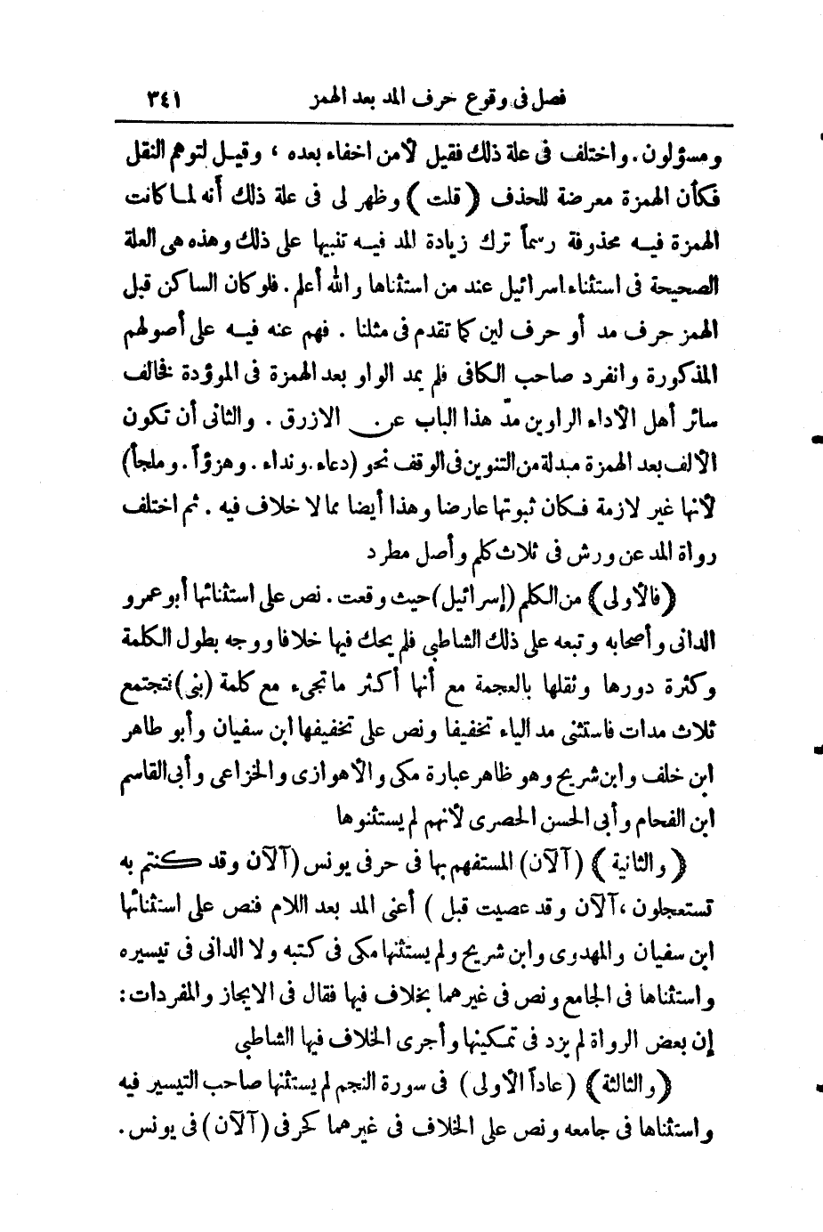 (قُلْتُ) : ظَهَرَ لِي فِي عِلَّةِ ذَلِكَ أَنَّهُ لَمَّا كَانَتِ الْهَمْزَةُ فِيهِ مَحْذُوفَةٌ رَسْمًا تُرِكَ زِيَادَةُ الْمَدِّ فِيهِ تَنْبِيهًا عَلَى ذَلِكَ، وَهَذِهِ هِيَ الْعِلَّةُ الصَّحِيحَةُ فِي اسْتِثْنَاءِ " إِسْرَائِيلَ " عِنْدَ مَنِ اسْتَثْنَاهَا، وَاللَّهُ أَعْلَمُ، فَلَوْ كَانَ السَّاكِنُ قَبْلَ الْهَمْزِ حَرْفَ مَدٍّ أَوْ حَرْفَ لِينٍ كَمَا تَقَدَّمَ فِي مَثَلِنَا فَهُمْ عَنْهُ فِيهِ عَلَى أُصُولِهِمُ الْمَذْكُورَةِ. وَانْفَرَدَ صَاحِبُ " الْكَافِي " فَلَمْ يَمُدَّ الْوَاوَ بَعْدَ الْهَمْزَةِ فِي " الْمَوْءُودَةِ " فَخَالَفَ سَائِرَ أَهْلِ الْأَدَاءِ الرَّاوِينَ مَدَّ هَذَا الْبَابِ عَنِ الْأَزْرَقِ، وَالثَّانِي أَنْ تَكُونَ الْأَلِفُ بَعْدَ الْهَمْزَةِ مُبْدَلَةً مِنَ التَّنْوِينِ فِي الْوَقْفِ نَحْوُ (دُعَاءً، وَنِدَاءً، وَهُزُؤًا، وَمَلْجَأً) لِأَنَّهَا غَيْرُ لَازِمَةٍ، فَكَانَ ثُبُوتُهَا عَارِضًا، وَهَذَا أَيْضًا مِمَّا لَا خِلَافَ فِيهِ. ثُمَّ اخْتَلَفَ رُوَاةُ الْمَدِّ، عَنْ وَرْشٍ فِي ثَلَاثِ كَلِمٍ وَأَصْلٍ مُطَّرِدٍ.