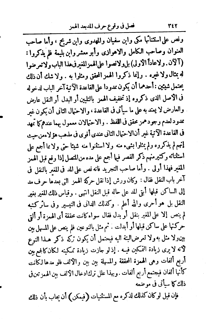 وَنَصَّ عَلَى اسْتِثْنَائِهَا مَكِّيٌّ وَابْنُ سُفْيَانَ وَالْمَهْدَوِيُّ وَابْنُ شُرَيْحٍ، وَأَمَّا صَاحِبُ " الْعُنْوَانِ "، وَصَاحِبُ " الْكَامِلِ "، وَالْأَهْوَازِيُّ وَأَبُو مَعْشَرٍ وَابْنُ بَلِّيمَةَ فَلَمْ يَذْكُرُوا: (آلْآنَ، وَلَا عَادًا الْأُولَى) بَلْ وَلَا نَصُّوا عَلَى الْهَمْزِ الْمُغَيَّرِ فِي هَذَا الْبَابِ وَلَا تَعَرَّضُوا لَهُ بِمِثَالٍ وَلَا غَيْرِهِ. وَإِنَّمَا ذَكَرُوا الْهَمْزَ الْمُحَقَّقَ وَمَثَّلُوا بِهِ، وَلَا شَكَّ أَنَّ ذَلِكَ يَحْتَمِلُ شَيْئَيْنِ: أَحَدُهُمَا أَنْ يَكُونَ مُمَدًّا عَلَى الْقَاعِدَةِ الْآتِيَةِ آخِرَ الْبَابِ لِدُخُولِهِ فِي الْأَصْلِ الَّذِي ذَكَرُوهُ، إِذْ تَخْفِيفُ الْهَمْزِ بِالتَّلْيِينِ أَوِ الْبَدَلِ أَوِ النَّقْلِ عَارِضٌ، وَالْعَارِضُ لَا يُعْتَدُّ بِهِ عَلَى مَا سَيَأْتِي فِي الْقَاعِدَةِ، وَالِاحْتِمَالُ الثَّانِي أَنْ يَكُونَ غَيْرَ مَمْدُودٍ لِعَدَمِ وُجُودِ هَمْزٍ مُحَقَّقٍ فِي اللَّفْظِ، وَالِاحْتِمَالَانِ مَعْمُولٌ بِهِمَا عِنْدَهُمْ كَمَا تَمَهَّدَ فِي الْقَاعِدَةِ الْآتِيَةِ غَيْرَ أَنَّ الِاحْتِمَالَ الثَّانِيَ عِنْدِي أَقْوَى فِي مَذْهَبِ هَؤُلَاءِ مِنْ حَيْثُ إِنَّهُمْ لَمْ يَذْكُرُوهُ وَلَمْ يُمَثِّلُوا بِشَيْءٍ مِنْهُ، وَلَا اسْتَثْنَوْا مِنْهُ شَيْئًا حَتَّى وَلَا مِمَّا أُجْمِعَ عَلَى اسْتِثْنَائِهِ، وَكَثِيرٌ مِنْهُمْ ذَكَرَ الْقَصْرَ فِيمَا أَجْمَعَ عَلَى مَدِّهِ مِنَ الْمُتَّصِلِ إِذَا وَقَعَ قَبْلَ الْهَمْزِ الْمُغَيَّرِ، فَهَذَا أَوْلَى، وَأَمَّا صَاحِبُ " التَّجْرِيدِ "، فَإِنَّهُ نَصَّ عَلَى الْمَدِّ فِي الْمُغَيَّرِ بِالنَّقْلِ فِي آخِرِ بَابِ النَّقْلِ، فَقَالَ: وَكَانَ وَرْشٌ إِذَا نَقَلَ حَرَكَةَ الْهَمْزِ الَّتِي بَعْدَهَا حَرْفُ مَدٍّ إِلَى السَّاكِنِ قَبْلَهَا أَبْقَى الْمَدَّ عَلَى حَالِهِ قَبْلَ النَّقْلِ. انْتَهَى، وَقِيَاسُ ذَلِكَ الْمُغَيَّرِ بِغَيْرِ النَّقْلِ، بَلْ هُوَ أَحْرَى، وَاللَّهُ أَعْلَمُ.