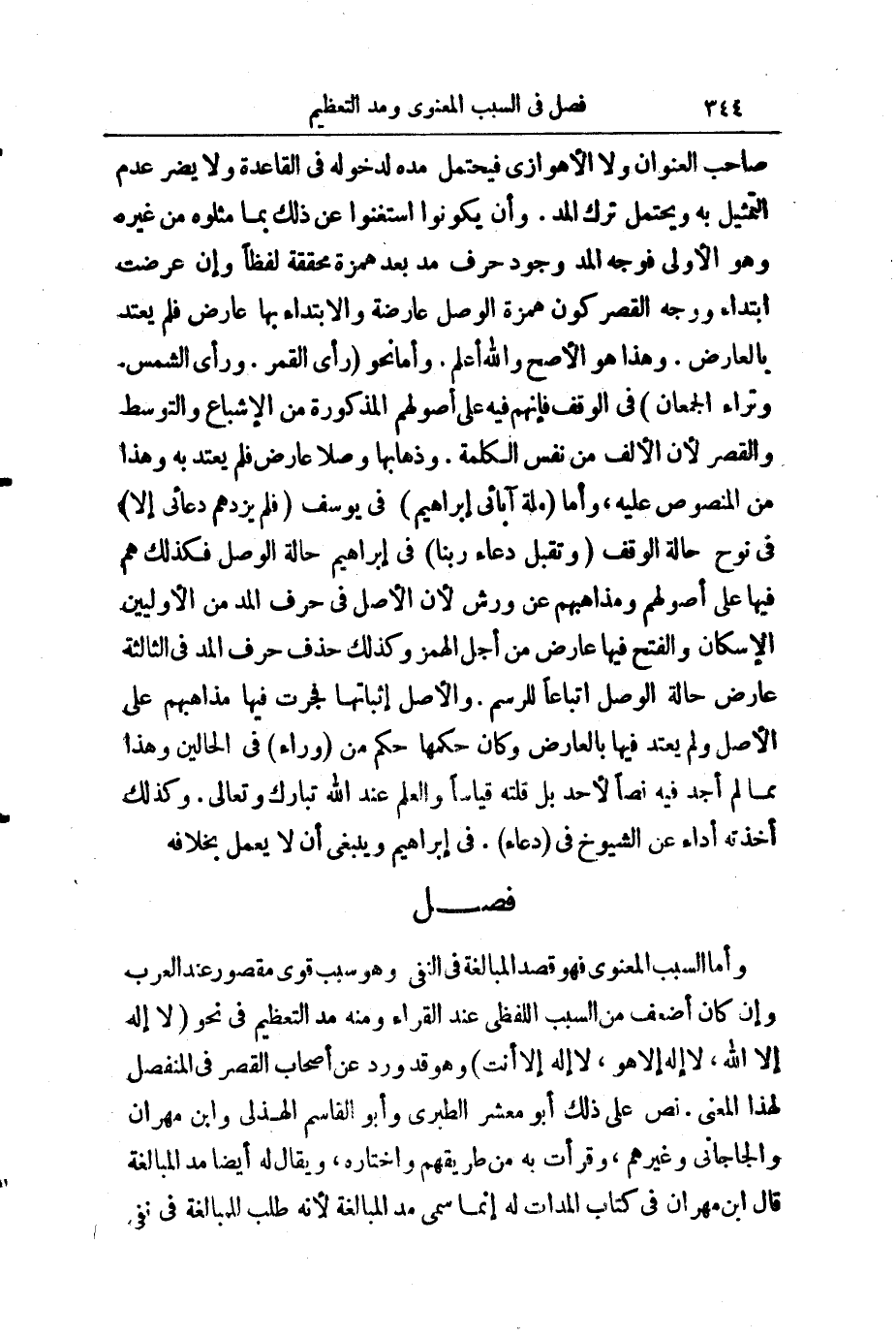 وَأَمَّا السَّبَبُ الْمَعْنَوِيُّ فَهُوَ قَصْدُ الْمُبَالَغَةِ فِي النَّفْيِ، وَهُوَ سَبَبٌ قَوِيٌّ مَقْصُورٌ عِنْدَ الْعَرَبِ، وَإِنْ كَانَ أَضْعَفَ مِنَ السَّبَبِ اللَّفْظِيِّ عِنْدَ الْقُرَّاءِ، وَمِنْهُ مَدُّ التَّعْظِيمِ فِي نَحْوِ (لَا إِلَهَ إِلَّا اللَّهُ) ، (لَا إِلَهَ إِلَّا هُوَ) ، (لَا إِلَهَ إِلَّا أَنْتَ) ، وَهُوَ قَدْ وَرَدَ عَنْ أَصْحَابِ الْقَصْرِ فِي الْمُنْفَصِلِ لِهَذَا الْمَعْنَى، وَنَصَّ عَلَى ذَلِكَ أَبُو مَعْشَرٍ الطَّبَرِيُّ وَأَبُو الْقَاسِمِ الْهُذَلِيُّ، وَابْنُ مِهْرَانَ، وَالْجَاجَانِيُّ، وَغَيْرُهُمْ، وَقَرَأْتُ بِهِ مِنْ طَرِيقِهِمْ، وَأَخْتَارُهُ، وَيُقَالُ لَهُ أَيْضًا: مَدُّ الْمُبَالَغَةِ. قَالَ ابْنُ مِهْرَانَ فِي " كِتَابِ الْمَدَّاتِ " لَهُ: إِنَّمَا سُمِّيَ مَدَّ الْمُبَالَغَةِ ; لِأَنَّهُ طَلَبٌ لِلْمُبَالَغَةِ فِي نَفْيِ