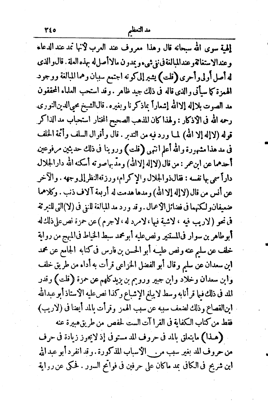 (قُلْتُ) : يُشِيرُ إِلَى كَوْنِهِ اجْتَمَعَ سَبَبَانِ، وَهُمَا الْمُبَالَغَةُ وَوُجُودُ الْهَمْزَةِ كَمَا سَيَأْتِي، وَالَّذِي قَالَهُ فِي ذَلِكَ جَيِّدٌ ظَاهِرٌ. وَقَدِ اسْتَحَبَّ الْعُلَمَاءُ الْمُحَقِّقُونَ مَدَّ الصَّوْتِ بِلَا إِلَهَ إِلَّا اللَّهُ إِشْعَارًا بِمَا ذَكَرْنَاهُ وَبِغَيْرِهِ. قَالَ الشَّيْخُ مُحْيِي الدِّينِ النَّوَوِيُّ - رَحِمَهُ اللَّهُ - فِي " الْأَذْكَارِ ": وَلِهَذَا كَانَ الْمَذْهَبُ الصَّحِيحُ الْمُخْتَارُ اسْتِحْبَابَ مَدِّ الذَّاكِرِ قَوْلَهُ: (لَا إِلَهَ إِلَّا اللَّهُ) لِمَا وَرَدَ مِنَ التَّدَبُّرِ. قَالَ: وَأَقْوَالُ السَّلَفِ وَأَئِمَّةِ الْخَلَفِ فِي مَدِّ هَذَا مَشْهُورَةٌ، وَاللَّهُ أَعْلَمُ. انْتَهَى.