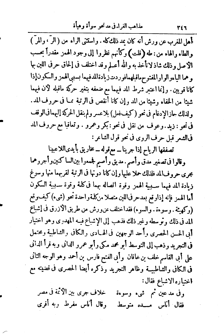 وَفِي مَدِّ عَيْنٍ ثُمَّ شَيْءٍ وَسَوْأَةٍ ... خِلَافٌ جَرَى بَيْنَ الْأَئِمَّةِ فِي مِصْرِ