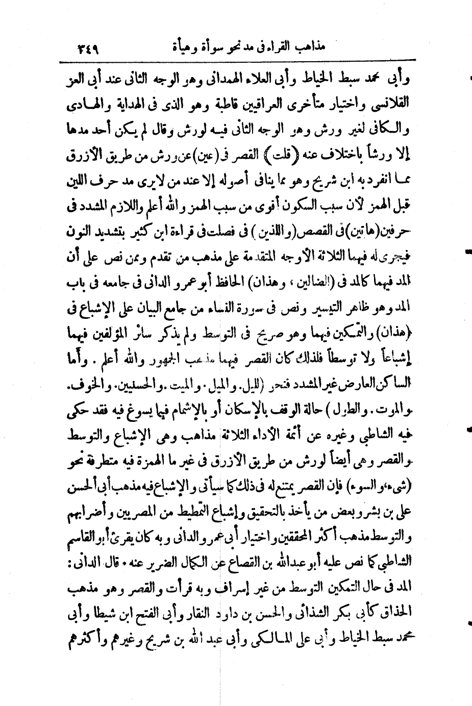 وَأَبِي مُحَمَّدٍ سِبْطِ الْخَيَّاطِ وَأَبِي الْعَلَاءِ الْهَمْدَانِيِّ، وَهُوَ الْوَجْهُ الثَّانِي عِنْدَ أَبِي الْعِزِّ الْقَلَانِسِيِّ، وَاخْتِيَارُ مُتَأَخِّرِي الْعِرَاقِيِّينَ قَاطِبَةً، وَهُوَ الَّذِي فِي " الْهِدَايَةِ " وَ " الْهَادِي " وَ " الْكَافِي " لِغَيْرِ وَرْشٍ، وَهُوَ الْوَجْهُ الثَّانِي فِيهِ لِوَرْشٍ، وَقَالَ: لَمْ يَكُنْ أَحَدٌ مَدَّهَا إِلَّا وَرْشًا بِاخْتِلَافٍ عَنْهُ.