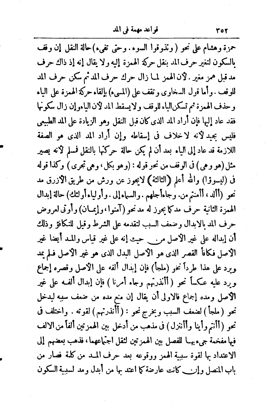 حَمْزَةَ وَهِشَامٍ عَلَى نَحْوِ (وَتَذُوقُوا السُّوءَ، وَحَتَّى تَفِيءَ) حَالَةَ النَّقْلِ إِنْ وُقِفَ بِالسُّكُونِ؛ لِتَغَيُّرِ حَرْفِ الْمَدِّ بِنَقْلِ حَرَكَةِ الْهَمْزَةِ إِلَيْهِ، وَلَا يُقَالُ إِنَّهُ إِذْ ذَاكَ حَرْفُ مَدٍّ قَبْلَ هَمْزٍ مُغَيَّرٍ ; لِأَنَّ الْهَمْزَ لَمَّا زَالَ حُرِّكَ حَرْفُ الْمَدِّ، ثُمَّ سَكَنَ حَرْفُ الْمَدِّ لِلْوَقْفِ، وَأَمَّا قَوْلُ السَّخَاوِيِّ: وَتَقِفُ عَلَى (الْمُسِيءُ) بِإِلْقَاءِ حَرَكَةِ الْهَمْزَةِ عَلَى الْيَاءِ وَحَذْفِ الْهَمْزَةِ، ثُمَّ تُسْكِنُ الْيَاءَ لِلْوَقْفِ وَلَا يَسْقُطُ الْمَدُّ ; لِأَنَّ الْيَاءَ وَإِنْ زَالَ سُكُونُهَا فَقَدْ عَادَ إِلَيْهَا - فَإِنْ أَرَادَ الْمَدَّ الَّذِي كَانَ قَبْلَ النَّقْلِ وَهُوَ الزِّيَادَةُ عَلَى الْمَدِّ الطَّبِيعِيِّ فَلَيْسَ بِجَيِّدٍ ; لِأَنَّهُ لَا خِلَافَ فِي إِسْقَاطِهِ، وَإِنْ أَرَادَ الْمَدَّ الَّذِي هُوَ الصِّفَةُ اللَّازِمَةُ قَدْ عَادَ إِلَى الْيَاءِ بَعْدَ أَنْ لَمْ يَكُنْ حَالَةَ حَرَكَتِهَا بِالنَّقْلِ فَمُسَلَّمٌ ; لِأَنَّهُ يَصِيرُ مِثْلَ (هُوَ وَهِيَ) فِي الْوَقْفِ مِنْ نَحْوِ قَوْلِهِ: (وَهُوَ بِكُلِّ، وَهِيَ تَجْرِي) ، وَكَذَا قَوْلُهُ فِي (لِيَسُوءُوا) ، وَاللَّهُ أَعْلَمُ.