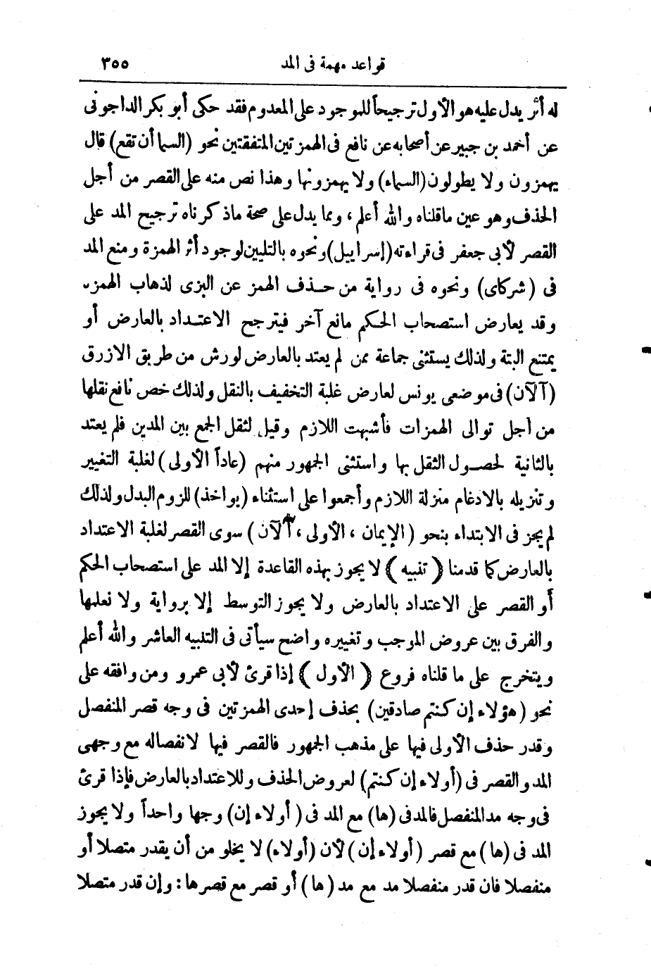 وَمِمَّا يَدُلُّ عَلَى صِحَّةِ مَا ذَكَرْنَاهُ، تَرْجِيحُ الْمَدِّ عَلَى الْقَصْرِ لِأَبِي جَعْفَرٍ فِي قِرَاءَتِهِ (إِسْرَايِيلَ) وَنَحْوِهِ بِالتَّلْيِينِ؛ لِوُجُودِ أَثَرِ الْهَمْزَةِ، وَمَنْعِ الْمَدِّ فِي (شُرَكَايَ) وَنَحْوِهِ فِي رِوَايَةِ مَنْ حَذَفَ الْهَمْزَةَ عَنِ الْبَزِّيِّ لِذَهَابِ الْهَمْزَةِ، وَقَدْ يُعَارِضُ اسْتِصْحَابَ الْحُكْمِ مَانِعٌ آخَرُ، فَيَتَرَجَّحُ الِاعْتِدَادُ بِالْعَارِضِ، أَوْ يَمْتَنِعُ أَلْبَتَّةَ ; وَلِذَلِكَ يَسْتَثْنِي جَمَاعَةٌ مِمَّنْ لَمْ يَعْتَدَّ بِالْعَارِضِ لِوَرْشٍ مِنْ طَرِيقِ الْأَزْرَقِ (آلْآنَ) فِي مَوْضِعَيْ يُونُسَ لِعَارِضٍ غَلَبَهُ التَّخْفِيفُ بِالنَّقْلِ ; وَلِذَلِكَ خَصَّ نَافِعٌ نَقْلَهَا مِنْ أَجْلِ تَوَالِي الْهَمَزَاتِ، فَأَشْبَهَتِ اللَّازِمَ، وَقِيلَ: لِثِقَلِ الْجَمْعِ بَيْنَ الْمَدَّيْنِ، فَلَمْ يَعْتَدَّ بِالثَّانِيَةِ لِحُصُولِ الثِّقَلِ بِهَا، وَاسْتَثْنَى الْجُمْهُورُ مِنْهُمْ (عَادًا الْأُولَى) لِغَلَبَةِ التَّغْيِيرِ، وَتَنْزِيلِهِ بِالْإِدْغَامِ مَنْزِلَةَ اللَّازِمِ، وَأَجْمَعُوا عَلَى اسْتِثْنَاءِ (يُوَاخِذُ) ؛ لِلُزُومِ الْبَدَلِ، وَلِذَلِكَ لَمْ يَجُزْ فِي الِابْتِدَاءِ بِنَحْوِ (الْإِيمَانِ، الْمَوْلَى، آلْآنَ) سِوَى الْقَصْرِ لِغَلَبَةِ الِاعْتِدَادِ بِالْعَارِضِ كَمَا قَدَّمْنَا.
