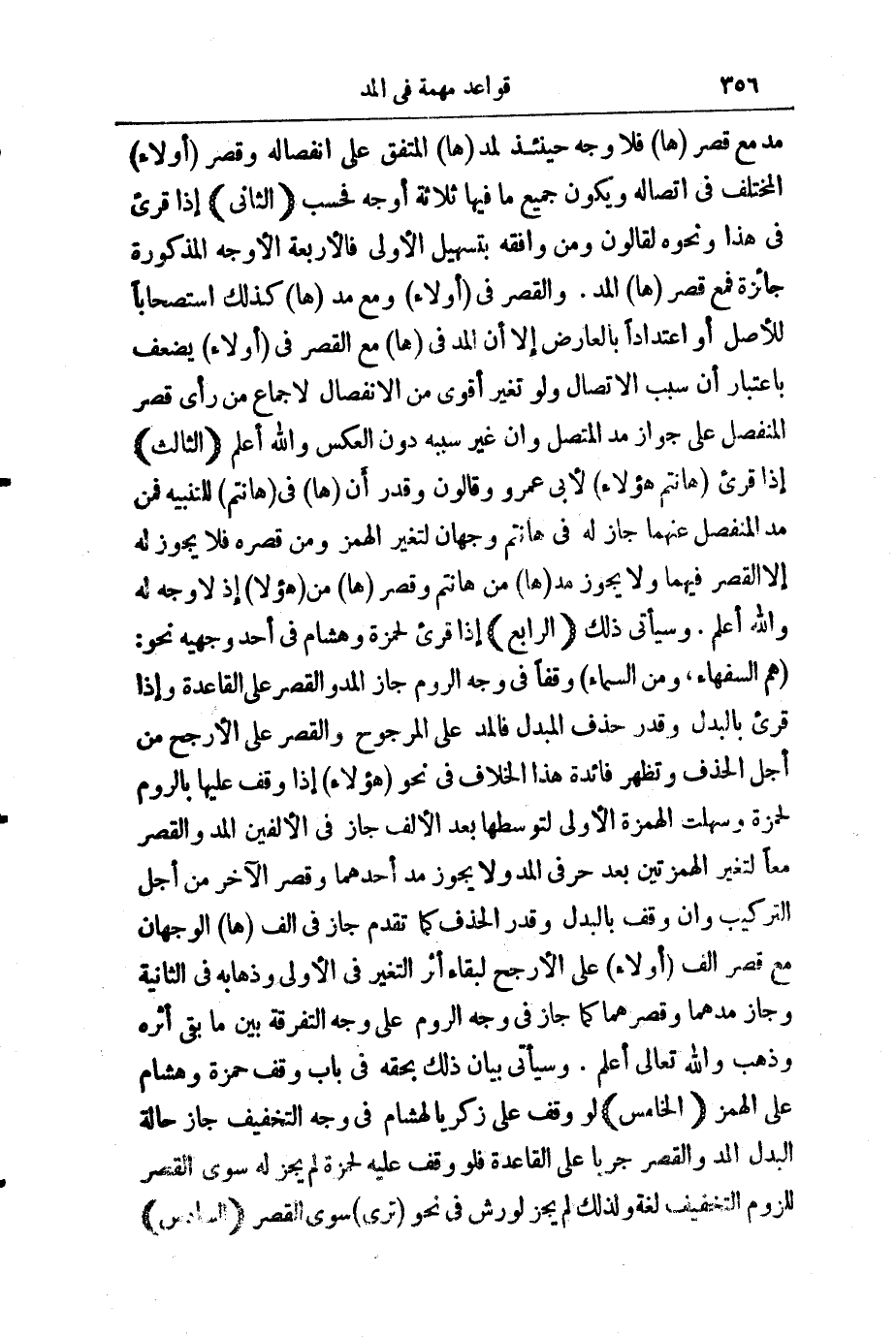 (الثَّانِي) إِذَا قُرِئَ فِي هَذَا وَنَحْوِهِ لَقَالُونَ وَمَنْ وَافَقَهُ بِتَسْهِيلِ الْأُولَى - فَالْأَرْبَعَةُ أَوْجُهٍ الْمَذْكُورَةُ جَائِزَةٌ، فَمَعَ قَصْرِ (هَا) الْمَدِّ وَالْقَصْرِ فِي (أُولَاءِ) وَمَعَ مَدِّ (هَا) كَذَلِكَ اسْتِصْحَابًا لِلْأَصْلِ إِلَّا اعْتِدَادًا بِالْعَارِضِ، إِلَّا أَنَّ الْمَدَّ فِي (هَا) مَعَ الْقَصْرِ فِي (أُولَاءِ) يَضْعُفُ بِاعْتِبَارِ أَنَّ سَبَبَ الِاتِّصَالِ - وَلَوْ تَغَيَّرَ - أَقْوَى مِنَ الِانْفِصَالِ؛ لِإِجْمَاعِ مَنْ رَأَى قَصْرَ الْمُنْفَصِلِ عَلَى جَوَازِ مَدِّ الْمُتَّصِلِ، وَإِنْ غُيِّرَ سَبَبُهُ دُونَ الْعَكْسِ، وَاللَّهُ أَعْلَمُ.