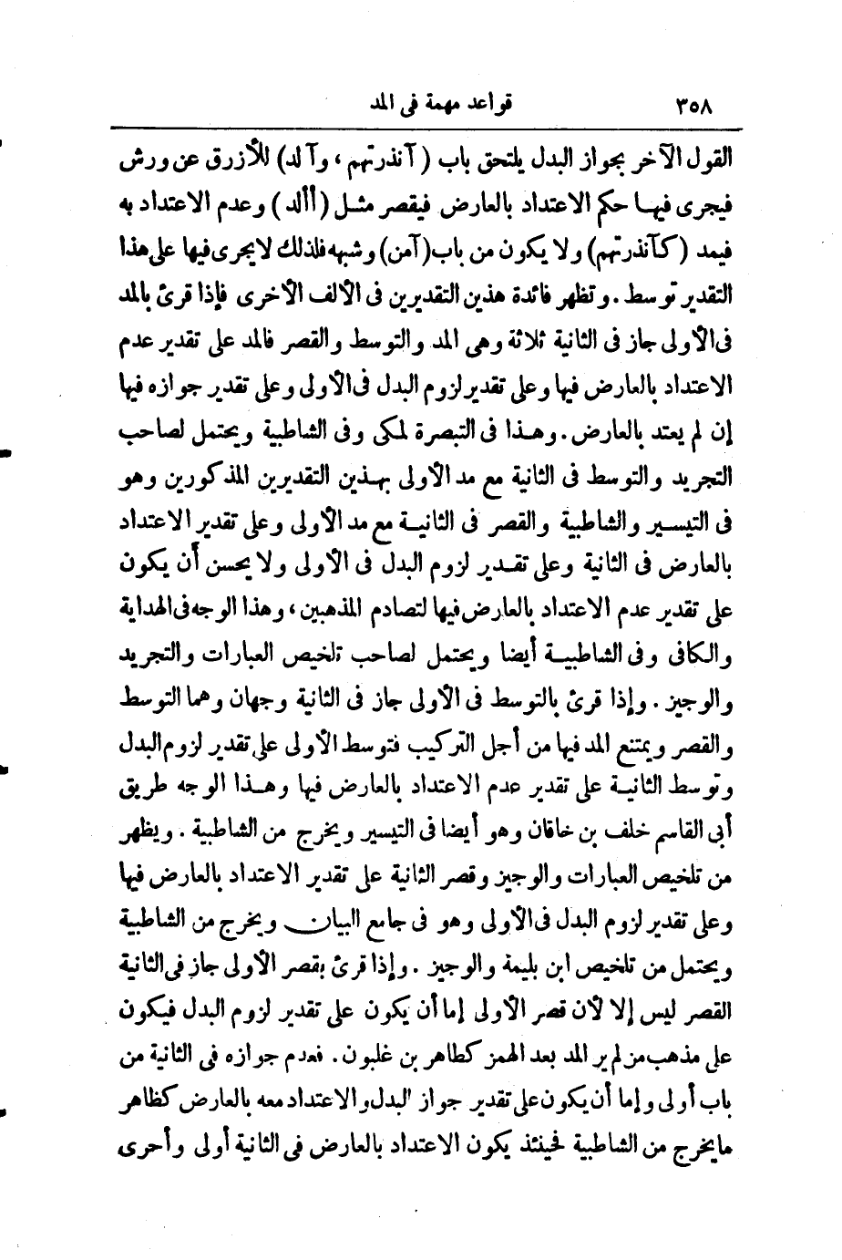 الْقَوْلِ الْآخَرِ بِجَوَازِ الْبَدَلِ يَلْتَحِقُ بَابَ (آنْذَرْتَهُمْ، وَآلِدُ) لِلْأَزْرَقِ، عَنْ وَرْشٍ، فَيَجْرِي فِيهَا حُكْمُ الِاعْتِدَادِ بِالْعَارِضِ، فَيُقْصَرُ مِثْلُ (أَأَلِدُ) وَعَدَمُ الِاعْتِدَادِ بِهِ فَيُمَدُّ كَـ (آنْذَرْتَهُمْ) وَلَا يَكُونُ مِنْ بَابِ (آمَنَ) وَشِبْهِهِ، فَذَلِكَ لَا يَجْرِي فِيهَا عَلَى هَذَا التَّقْدِيرِ تَوَسُطٌ، وَتَظْهَرُ فَائِدَةُ هَذَيْنِ التَّقْدِيرَيْنِ فِي الْأَلِفِ الْأُخْرَى، فَإِذَا قُرِئَ بِالْمَدِّ فِي الْأُولَى جَازَ فِي الثَّانِيَةِ ثَلَاثَةٌ، وَهِيَ الْمَدُّ وَالتَّوَسُّطُ وَالْقَصْرُ، فَالْمَدُّ عَلَى تَقْدِيرِ عَدَمِ الِاعْتِدَادِ بِالْعَارِضِ فِيهَا، وَعَلَى تَقْدِيرِ لُزُومِ الْبَدَلِ فِي الْأُولَى، وَعَلَى تَقْدِيرِ جَوَازِهِ فِيهَا إِنْ لَمْ يُعْتَدَّ بِالْعَارِضِ. وَهَذَا فِي " التَّبْصِرَةِ " لِمَكِّيٍّ وَفِي " الشَّاطِبِيَّةِ "، وَيُحْتَمَلُ لِصَاحِبِ " التَّجْرِيدِ "، وَالتَّوَسُّطُ فِي الثَّانِيَةِ مَعَ مَدِّ الْأُولَى بِهَذَيْنِ التَّقْدِيرَيْنِ الْمَذْكُورَيْنِ، وَهُوَ فِي " التَّيْسِيرِ " وَ " الشَّاطِبِيَّةِ "، وَالْقَصْرُ فِي الثَّانِيَةِ مَعَ الْأُولَى، وَعَلَى تَقْدِيرِ الِاعْتِدَادِ بِالْعَارِضِ فِي الثَّانِيَةِ، وَعَلَى تَقْدِيرِ لُزُومِ الْبَدَلِ فِي الْأُولَى، وَلَا يَحْسُنُ أَنْ يَكُونَ عَلَى تَقْدِيرِ عَدَمِ الِاعْتِدَادِ بِالْعَارِضِ فِيهَا لِتَصَادُمِ الْمَذْهَبَيْنِ، وَهَذَا الْوَجْهُ فِي " الْهِدَايَةِ " وَ " الْكَافِي " وَفِي " الشَّاطِبِيَّةِ " أَيْضًا، وَيُحْتَمَلُ لِصَاحِبِ " تَلْخِيصِ الْعِبَارَاتِ "، وَ " التَّجْرِيدِ " وَ " الْوَجِيزِ "، وَإِذَا قُرِئَ بِالتَّوَسُّطِ فِي الْأُولَى جَازَ فِي الثَّانِيَةِ وَجْهَانِ، وَهُمَا التَّوَسُّطُ وَالْقَصْرُ، وَيَمْتَنِعُ الْمَدُّ فِيهَا مِنْ أَجْلِ التَّرْكِيبِ، فَتَوَسُّطُ الْأُولَى عَلَى تَقْدِيرِ لُزُومِ الْبَدَلِ، وَتَوَسُّطُ الثَّانِيَةِ عَلَى تَقْدِيرِ عَدَمِ الِاعْتِدَادِ بِالْعَارِضِ فِيهَا، وَهَذَا الْوَجْهُ طَرِيقُ أَبِي الْقَاسِمِ خَلَفِ بْنِ خَاقَانَ، وَهُوَ أَيْضًا فِي " التَّيْسِيرِ "، وَيَخْرُجُ مِنَ " الشَّاطِبِيَّةِ "، وَيَظْهَرُ مِنْ " تَلْخِيصِ الْعِبَارَاتِ " وَ " الْوَجِيزِ "، وَقَصْرُ الثَّانِيَةِ عَلَى تَقْدِيرِ الِاعْتِدَادِ بِالْعَارِضِ فِيهَا، وَعَلَى تَقْدِيرِ لُزُومِ الْبَدَلِ فِي الْأُولَى، وَهُوَ فِي " جَامِعِ الْبَيَانِ "، وَيَخْرُجُ مِنَ الشَّاطِبِيَّةِ، وَيُحْتَمَلُ مِنْ تَلْخِيصِ ابْنِ بَلِّيمَةَ وَ " الْوَجِيزِ ". وَإِذَا قُرِئَ بِقَصْرِ الْأُولَى جَازَ فِي الثَّانِيَةِ الْقَصْرُ لَيْسَ إِلَّا ; لِأَنَّ قَصْرَ الْأُولَى إِمَّا أَنْ يَكُونَ عَلَى تَقْدِيرِ لُزُومِ الْبَدَلِ فَيَكُونُ عَلَى مَذْهَبِ مَنْ لَمْ يَرَ الْمَدَّ بَعْدَ الْهَمْزِ كَطَاهِرِ بْنِ غَلْبُونَ فَعَدَمُ جَوَازِهِ فِي الثَّانِيَةِ مِنْ بَابِ أَوْلَى، وَإِمَّا أَنْ يَكُونَ عَلَى تَقْدِيرِ جَوَازِ الْبَدَلِ وَالِاعْتِدَادِ مَعَهُ بِالْعَارِضِ كَظَاهِرِ مَا يَخْرُجُ مِنَ " الشَّاطِبِيَّةِ "، فَحِينَئِذٍ يَكُونُ الِاعْتِدَادُ بِالْعَارِضِ فِي الثَّانِيَةِ أَوْلَى وَأَحْرَى