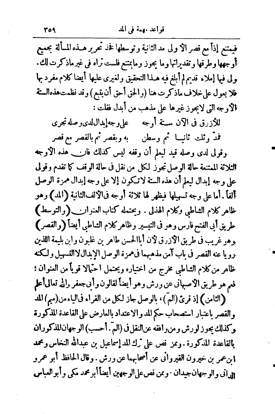 فَيَمْتَنِعُ إِذًا مَعَ قَصْرِ الْأُولَى مَدُّ الثَّانِيَةِ وَتَوَسُّطُهَا، فَخُذْ تَحْرِيرَ هَذِهِ الْمَسْأَلَةِ بِجَمِيعِ أَوْجُهِهَا، وَطُرُقِهَا، وَتَقْدِيرَاتِهَا، وَمَا يَجُوزُ وَمَا يَمْتَنِعُ، فَلَسْتَ تَرَاهُ فِي غَيْرِ مَا ذَكَرْتُ لَكَ، وَلِي فِيهَا إِمْلَاءٌ قَدِيمٌ لَمْ أَبْلُغْ فِيهِ هَذَا التَّحْقِيقَ، وَلِغَيْرِي عَلَيْهَا أَيْضًا كَلَامٌ مُفْرَدٌ بِهَا، فَلَا يُعَوَّلُ عَلَى خِلَافِ مَا ذَكَرْتُ هُنَا، وَالْحَقُّ أَحَقُّ أَنْ يُتَّبَعَ، وَقَدْ نَظَمْتُ هَذِهِ الْأَوْجَهَ الَّتِي لَا يَجُوزُ غَيْرُهَا عَلَى مَذْهَبِ مَنْ أَبْدَلَ، فَقُلْتُ: