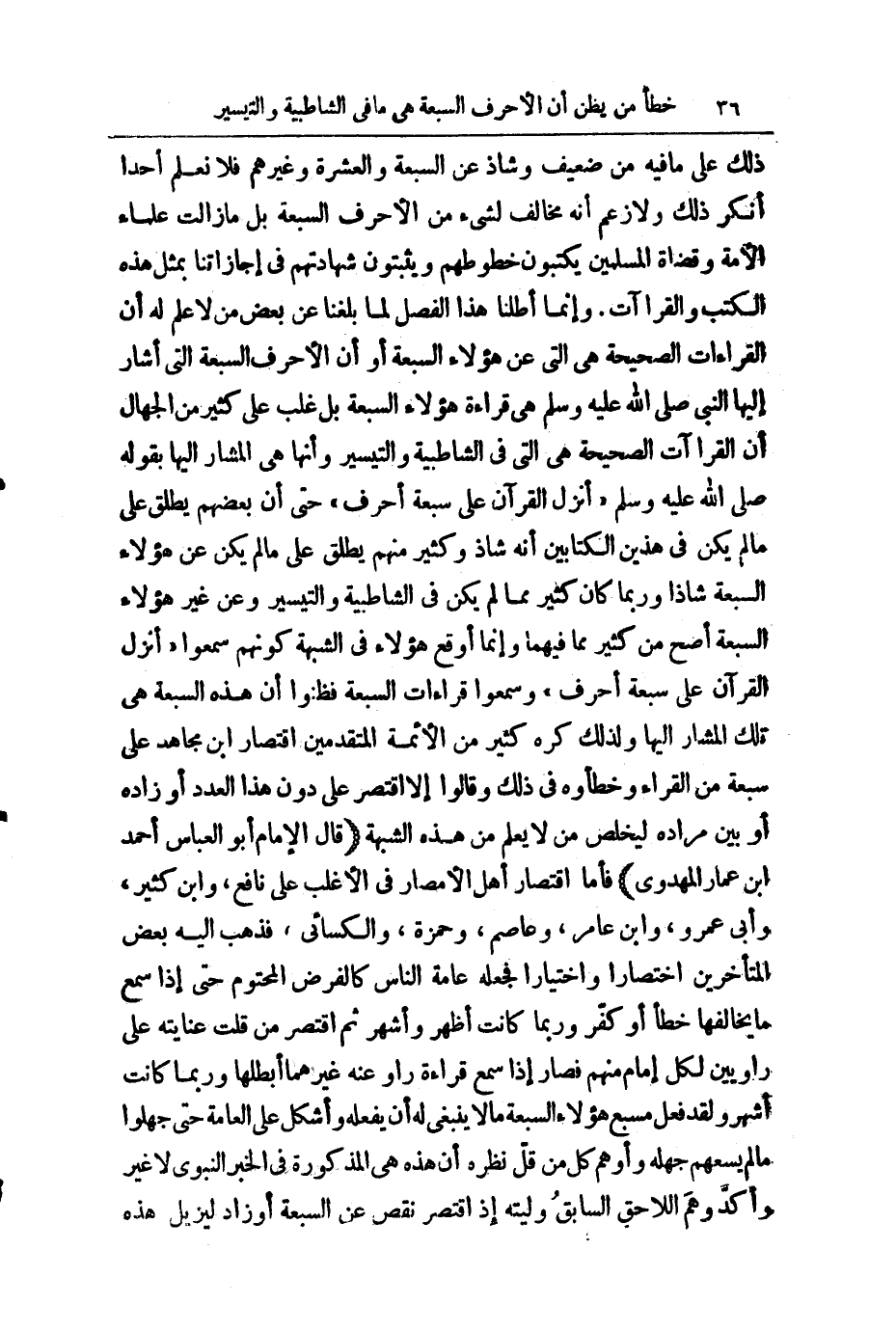 وَإِنَّمَا أَطَلْنَا هَذَا الْفَصْلَ لِمَا بَلَغَنَا عَنْ بَعْضِ مَنْ لَا عِلْمَ لَهُ أَنَّ الْقِرَاءَاتِ الصَّحِيحَةَ هِيَ الَّتِي عَنْ هَؤُلَاءِ السَّبْعَةِ، أَوْ أَنَّ الْأَحْرُفَ السَّبْعَةَ الَّتِي أَشَارَ إِلَيْهَا النَّبِيُّ - صَلَّى اللَّهُ عَلَيْهِ وَسَلَّمَ - هِيَ قِرَاءَةُ هَؤُلَاءِ السَّبْعَةِ، بَلْ غَلَبَ عَلَى كَثِيرٍ مِنَ الْجُهَّالِ أَنَّ الْقِرَاءَاتِ الصَّحِيحَةَ هِيَ الَّتِي فِي الشَّاطِبِيَّةِ وَالتَّيْسِيرِ وَأَنَّهَا هِيَ الْمُشَارُ إِلَيْهَا بِقَوْلِهِ: - صَلَّى اللَّهُ عَلَيْهِ وَسَلَّمَ -: أُنْزِلَ الْقُرْآنُ عَلَى سَبْعَةِ أَحْرُفٍ، حَتَّى أَنَّ بَعْضَهُمْ يُطْلِقُ عَلَى مَا لَمْ يَكُنْ فِي هَذَيْنَ الْكِتَابَيْنِ أَنَّهُ شَاذٌّ، وَكَثِيرٌ مِنْهُمْ يُطْلِقُ عَلَى مَا لَمْ يَكُنْ عَنْ هَؤُلَاءِ السَّبْعَةِ شَاذًّا، وَرُبَّمَا كَانَ كَثِيرٌ مِمَّا لَمْ يَكُنْ فِي الشَّاطِبِيَّةِ وَالتَّيْسِيرِ وَعَنْ غَيْرِ هَؤُلَاءِ السَّبْعَةِ أَصَحَّ مِنْ كَثِيرٍ مِمَّا فِيهِمَا، وَإِنَّمَا أَوْقَعَ هَؤُلَاءِ فِي الشُّبْهَةِ كَوْنُهُمْ سَمِعُوا: أُنْزِلَ الْقُرْآنُ عَلَى سَبْعَةِ أَحْرُفٍ، وَسَمِعُوا قِرَاءَاتِ السَّبْعَةِ فَظَنُّوا أَنَّ هَذِهِ السَّبْعَةَ هِيَ تِلْكَ الْمُشَارُ إِلَيْهَا ; وَلِذَلِكَ كَرِهَ كَثِيرٌ مِنَ الْأَئِمَّةِ الْمُتَقَدِّمِينَ اقْتِصَارَ ابْنِ مُجَاهِدٍ عَلَى سَبْعَةٍ مِنَ الْقُرَّاءِ وَخَطَّئُوهُ فِي ذَلِكَ، وَقَالُوا: أَلَا اقْتَصَرَ عَلَى دُونِ هَذَا الْعَدَدِ أَوْ زَادَهُ أَوْ بَيَّنَ مُرَادَهُ؟ لِيُخَلِّصَ مَنْ لَا يَعْلَمُ مِنْ هَذِهِ الشُّبْهَةِ.