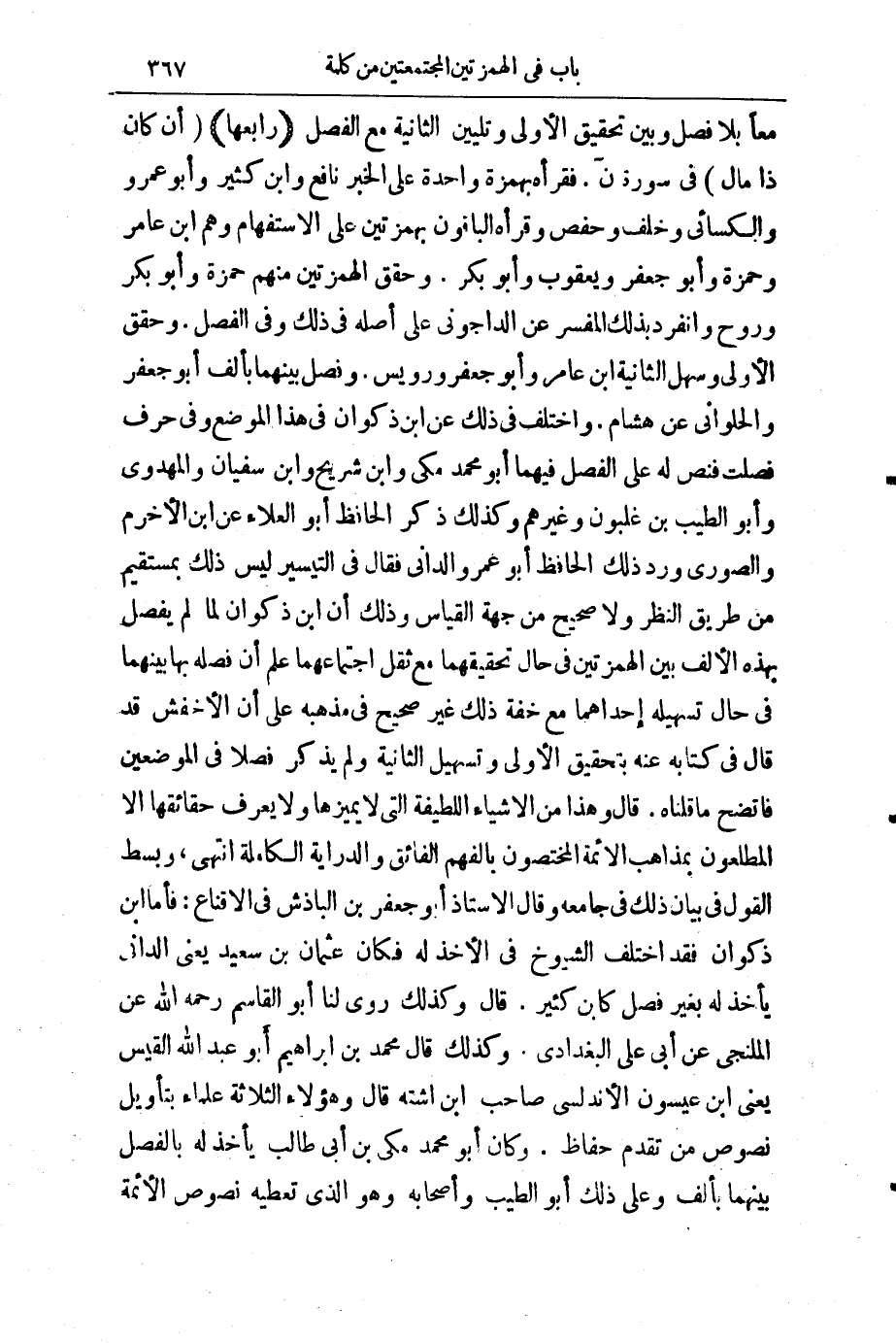 (رَابِعُهَا) (أَنْ كَانَ ذَا مَالٍ) فِي سُورَةِ " ن ". فَقَرَأَ بِهَمْزَةٍ وَاحِدَةٍ عَلَى الْخَبَرِ نَافِعٌ، وَابْنُ كَثِيرٍ وَأَبُو عَمْرٍو وَالْكِسَائِيُّ وَخَلَفٌ، وَحَفْصٌ، وَقَرَأَهُ الْبَاقُونَ بِهَمْزَتَيْنِ عَلَى الِاسْتِفْهَامِ، وَهُمُ ابْنُ عَامِرٍ وَحَمْزَةُ وَأَبُو جَعْفَرٍ، وَيَعْقُوبُ وَأَبُو بَكْرٍ، وَحَقَّقَ الْهَمْزَتَيْنِ مِنْهُمْ حَمْزَةُ وَأَبُو بَكْرٍ، وَرَوْحٌ، وَانْفَرَدَ بِذَلِكَ الْمُفَسِّرُ عَنِ الدَّاجُونِيِّ عَلَى أَصْلِهِ فِي ذَلِكَ وَفِي الْفَصْلِ، وَحَقَّقَ الْأُولَى وَسَهَّلَ الثَّانِيَةَ ابْنُ عَامِرٍ وَأَبُو جَعْفَرٍ وَرُوَيْسٌ، وَفَصَلَ بَيْنَهُمَا بِأَلِفٍ أَبُو جَعْفَرٍ وَالْحُلْوَانِيُّ، عَنْ هِشَامٍ، وَاخْتُلِفَ فِي ذَلِكَ عَنِ ابْنِ ذَكْوَانَ فِي هَذَا الْمَوْضِعِ وَفِي حَرْفِ فُصِّلَتْ، فَنَصَّ لَهُ عَلَى الْفَصْلِ فِيهِمَا أَبُو مُحَمَّدٍ مَكِّيٌّ، وَابْنُ شُرَيْحٍ وَابْنُ سُفْيَانَ وَالْمَهْدَوِيُّ وَأَبُو الطَّيِّبِ بْنُ غَلْبُونَ، وَغَيْرُهُمْ. وَكَذَلِكَ ذَكَرَ الْحَافِظُ أَبُو الْعَلَاءِ عَنِ ابْنِ الْأَخْرَمِ وَالصُّورِيِّ، وَرَدَّ ذَلِكَ الْحَافِظُ أَبُو عَمْرٍو الدَّانِيُّ فَقَالَ فِي " التَّيْسِيرِ ": لَيْسَ ذَلِكَ بِمُسْتَقِيمٍ مِنْ طَرِيقِ النَّظَرِ، وَلَا صَحِيحٍ مِنْ جِهَةِ الْقِيَاسِ، وَذَلِكَ أَنَّ ابْنَ ذَكْوَانَ لَمَّا لَمْ يَفْصِلْ بِهَذِهِ الْأَلِفِ بَيْنَ الْهَمْزَتَيْنِ فِي حَالِ تَحْقِيقِهِمَا مَعَ ثِقَلِ اجْتِمَاعِهِمَا عُلِمَ أَنَّ فَصْلَهُ بِهَا بَيْنَهُمَا فِي حَالِ تَسْهِيلِهِ إِحْدَاهُمَا مَعَ خِفَّةِ ذَلِكَ غَيْرُ صَحِيحٍ فِي مَذْهَبِهِ، عَلَى أَنَّ الْأَخْفَشَ قَدْ قَالَ فِي كِتَابِهِ عَنْهُ بِتَحْقِيقِ الْأُولَى وَتَسْهِيلِ الثَّانِيَةِ، وَلَمْ يَذْكُرْ فَصْلًا فِي الْمَوْضِعَيْنِ، فَاتَّضَحَ مَا قُلْنَاهُ. قَالَ: وَهَذَا مِنَ الْأَشْيَاءِ اللَّطِيفَةِ الَّتِي لَا يُمَيِّزُهَا وَلَا يَعْرِفُ حَقَائِقَهَا إِلَّا الْمُطَّلِعُونَ بِمَذَاهِبِ الْأَئِمَّةِ، الْمُخْتَصُّونَ بِالْفَهْمِ الْفَائِقِ وَالدِّرَايَةِ الْكَامِلَةِ. انْتَهَى. وَبَسَطَ الْقَوْلَ فِي ذَلِكَ فِي جَامِعِهِ، وَقَالَ الْأُسْتَاذُ أَبُو جَعْفَرِ بْنُ الْبَاذِشِ فِي " الْإِقْنَاعِ ": فَأَمَّا ابْنُ ذَكْوَانَ فَقَدِ اخْتَلَفَ الشُّيُوخُ فِي الْأَخْذِ لَهُ، فَكَانَ عُثْمَانُ بْنُ سَعِيدٍ - يَعْنِي الدَّانِيَّ - يَأْخُذُ لَهُ بِغَيْرِ فَصْلٍ كَابْنِ كَثِيرٍ، قَالَ: وَكَذَلِكَ رَوَى لَنَا أَبُو الْقَاسِمِ - رَحِمَهُ اللَّهُ - عَنِ الْمِلَنْجِيِّ، عَنْ أَبِي عَلِيٍّ الْبَغْدَادِيِّ. وَكَذَلِكَ قَالَ مُحَمَّدُ بْنُ إِبْرَاهِيمَ أَبُو عَبْدِ اللَّهِ الْقَيْسُ - يَعْنِي ابْنَ عِيسُونَ الْأَنْدَلُسِيَّ صَاحِبَ ابْنِ أَشْتَةَ - قَالَ: وَهَؤُلَاءِ الثَّلَاثَةُ عُلَمَاءُ بِتَأْوِيلِ نُصُوصِ مَنْ تَقَدَّمَ، حُفَّاظٌ. وَكَانَ أَبُو مُحَمَّدٍ مَكِّيُّ بْنُ أَبِي طَالِبٍ يَأْخُذُ لَهُ بِالْفَصْلِ بَيْنَهُمَا بِأَلِفٍ، وَعَلَى ذَلِكَ أَبُو الطَّيِّبِ وَأَصْحَابُهُ، وَهُوَ الَّذِي تُعْطِيهِ نُصُوصُ الْأَئِمَّةِ