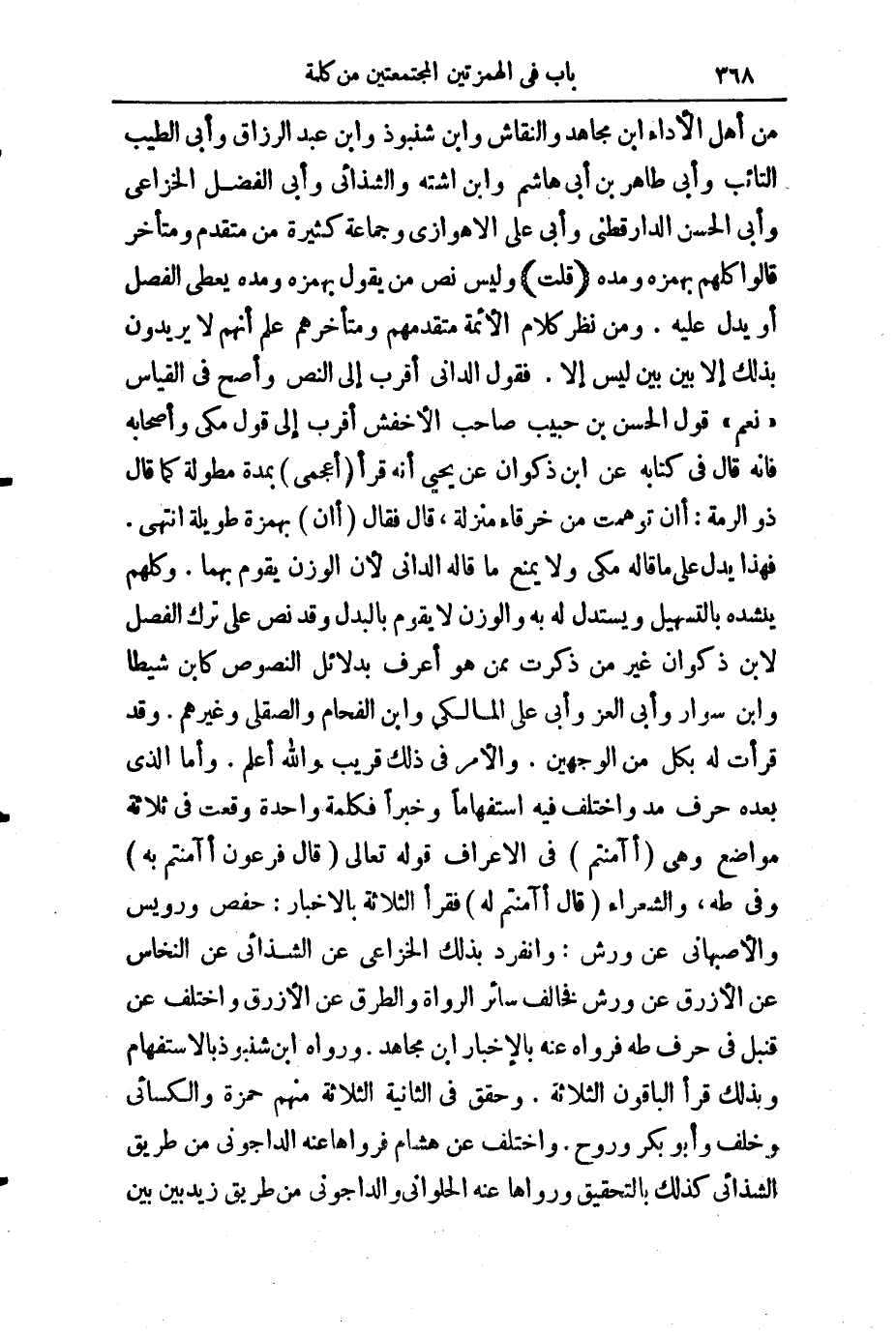 مِنْ أَهْلِ الْأَدَاءِ ابْنِ مُجَاهِدٍ وَالنَّقَّاشِ، وَابْنِ شَنَبُوذَ، وَابْنِ عَبْدِ الرَّزَّاقِ وَأَبِي الطَّيِّبِ التَّائِبِ وَأَبِي طَاهِرِ بْنِ أَبِي هَاشِمٍ وَابْنِ أَشْتَةَ وَالشَّذَائِيِّ وَأَبِي الْفَضْلِ الْخُزَاعِيِّ وَأَبِي الْحَسَنِ الدَّارَقُطْنِيِّ وَأَبِي عَلِيٍّ الْأَهْوَازِيِّ، وَجَمَاعَةٍ كَثِيرَةٍ مِنْ مُتَقَدِّمٍ وَمُتَأَخِّرٍ، قَالُوا كُلُّهُمْ بِهَمْزَةٍ وَمَدَّةٍ.
