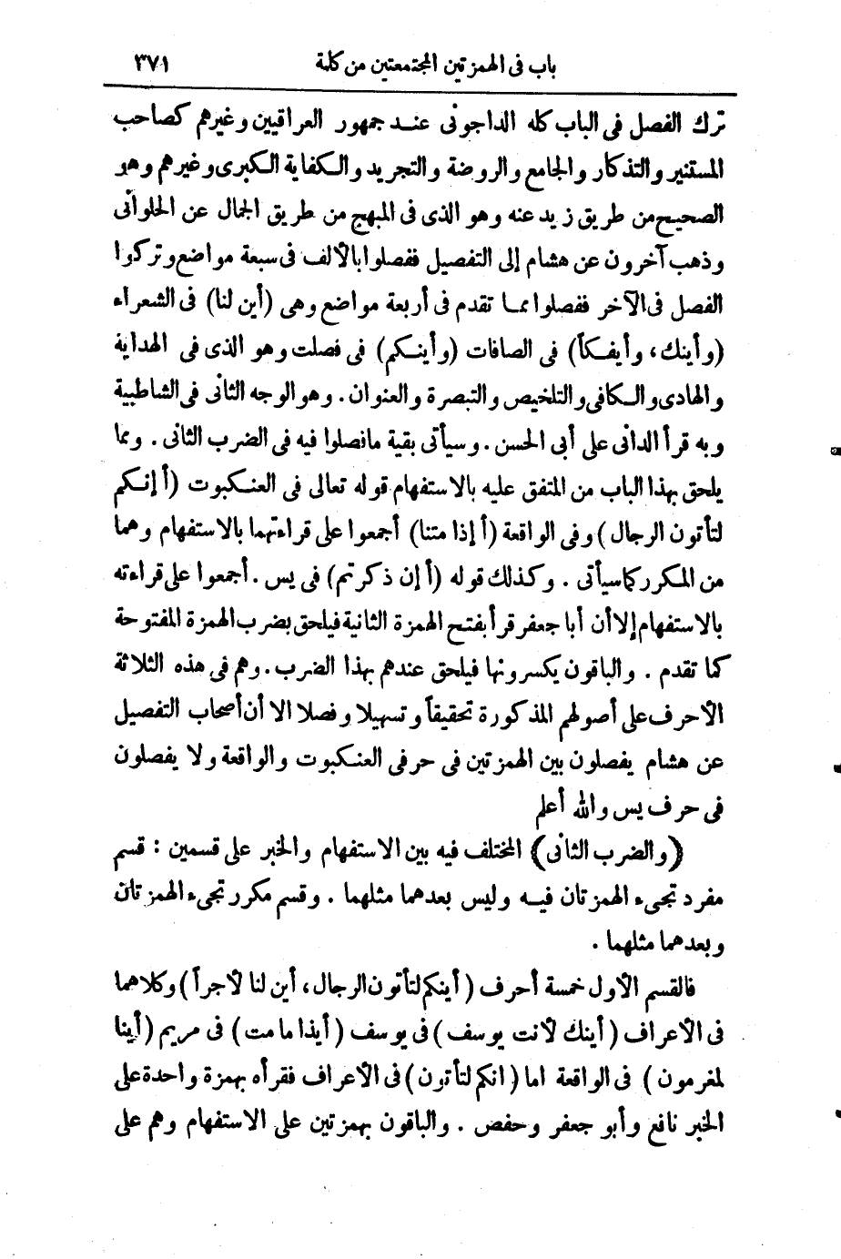 تَرْكُ الْفَصْلِ فِي الْبَابِ كُلِّهِ - الدَّاجُونِيُّ عِنْدَ جُمْهُورِ الْعِرَاقِيِّينَ وَغَيْرِهِمْ، كَصَاحِبِ " الْمُسْتَنِيرِ "، وَ " التَّذْكَارِ "، وَ " الْجَامِعِ "، وَ " الرَّوْضَةِ "، وَ " التَّجْرِيدِ "، وَ " الْكِفَايَةِ الْكُبْرَى "، وَغَيْرِهِمْ، وَهُوَ الصَّحِيحُ مِنْ طَرِيقِ زَيْدٍ عَنْهُ، وَهُوَ الَّذِي فِي " الْمُبْهِجِ " مِنْ طَرِيقِ الْجَمَّالِ عَنِ الْحُلْوَانِيِّ، وَذَهَبَ آخَرُونَ عَنْ هِشَامٍ إِلَى التَّفْصِيلِ، فَفَصَلُوا بِالْأَلِفِ فِي سَبْعَةِ مَوَاضِعَ وَتَرَكُوا الْفَصْلَ فِي الْآخَرِ، فَفَصَلُوا مِمَّا تَقَدَّمَ فِي أَرْبَعَةِ مَوَاضِعَ وَهِيَ (أَيِنَّ لَنَا) فِي الشُّعَرَاءِ وَ (أَيِنَّكَ، وَأَيِفْكًا) فِي الصَّافَّاتِ وَ (أَيِنَّكُمْ) فِي فُصِّلَتْ، وَهُوَ الَّذِي فِي " الْهِدَايَةِ "، وَ " الْهَادِي "، وَ " الْكَافِي "، وَ " التَّلْخِيصِ "، وَ " التَّبْصِرَةِ "، وَ " الْعُنْوَانِ "، وَهُوَ الْوَجْهُ الثَّانِي فِي " الشَّاطِبِيَّةِ "، وَبِهِ قَرَأَ الدَّانِيُّ عَلَى أَبِي الْحَسَنِ، وَسَيَأْتِي بَقِيَّةُ مَا فَصَلُوا فِيهِ فِي الضَّرْبِ الثَّانِي. وَمِمَّا يَلْحَقُ بِهَذَا الْبَابِ مِنَ الْمُتَّفَقِ عَلَيْهِ بِالِاسْتِفْهَامِ قَوْلُهُ تَعَالَى فِي الْعَنْكَبُوتِ: (أَئِنَّكُمْ لَتَأْتُونَ الرِّجَالَ) وَفِي الْوَاقِعَةِ: (أَإِنْ ذُكِّرْتُمْ) فِي يس. أَجْمَعُوا عَلَى قِرَاءَتِهِ بِالِاسْتِفْهَامِ، إِلَّا أَنَّ أَبَا جَعْفَرٍ، قَرَأَ بِفَتْحِ الْهَمْزَةِ الثَّانِيَةِ، فَيُلْحَقُ بِضَرْبِ الْهَمْزَةِ الْمَفْتُوحَةِ كَمَا تَقَدَّمَ، وَالْبَاقُونَ يَكْسِرُونَهَا، فَيُلْحَقُ عِنْدَهُمْ بِهَذَا الضَّرْبِ، وَهُمْ فِي هَذِهِ الثَّلَاثَةِ الْأَحْرُفِ عَلَى أُصُولِهِمُ الْمَذْكُورَةِ تَحْقِيقًا وَتَسْهِيلًا وَفَصْلًا، إِلَّا أَنَّ أَصْحَابَ التَّفْصِيلِ عَنْ هِشَامٍ يَفْصِلُونَ بَيْنَ الْهَمْزَتَيْنِ فِي حَرْفَيِ الْعَنْكَبُوتِ وَالْوَاقِعَةِ، وَلَا يَفْصِلُونَ فِي حَرْفِ يس، وَاللَّهُ أَعْلَمُ.