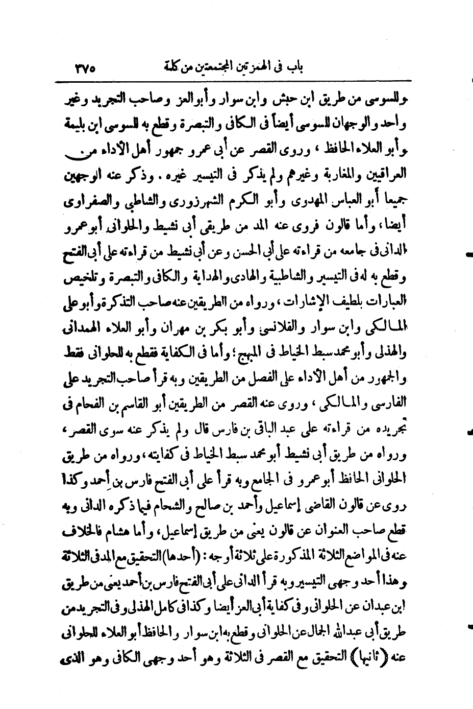 وَلِلسُّوسِيِّ مِنْ طَرِيقِ ابْنِ حَبَشٍ، ابْنُ سَوَّارٍ وَأَبُو الْعِزِّ، وَصَاحِبُ " التَّجْرِيدِ "، وَغَيْرُ وَاحِدٍ، وَالْوَجْهَانِ لِلسُّوسِيِّ أَيْضًا فِي " الْكَافِي " وَ " التَّبْصِرَةِ "، وَقَطَعَ بِهِ لِلسُّوسِيِّ ابْنُ بَلِّيمَةَ وَأَبُو الْعَلَاءِ الْحَافِظُ، وَرَوَى الْقَصْرَ عَنْ أَبِي عَمْرٍو جُمْهُورُ أَهْلِ الْأَدَاءِ مِنَ الْعِرَاقِيِّينَ وَالْمَغَارِبَةِ وَغَيْرِهِمْ، وَلَمْ يَذْكُرْ فِي " التَّيْسِيرِ " غَيْرَهُ، وَذَكَرَ عَنْهُ الْوَجْهَيْنِ جَمِيعًا أَبُو الْعَبَّاسِ الْمَهْدَوِيُّ وَأَبُو الْكَرَمِ الشَّهْرَزُورِيُّ وَالصَّفْرَاوِيُّ أَيْضًا، وَأَمَّا قَالُونُ فَرَوَى عَنْهُ الْمَدَّ مِنْ طَرِيقَيْ أَبِي نَشِيطٍ، وَالْحُلْوَانِيِّ وَأَبُو عَمْرٍو الدَّانِيُّ فِي جَامِعِهِ مِنْ قِرَاءَتِهِ عَلَى أَبِي الْحَسَنِ، وَعَنْ أَبِي نَشِيطٍ مِنْ قِرَاءَتِهِ عَلَى أَبِي الْفَتْحِ، وَقَطَعَ بِهِ لَهُ فِي " التَّيْسِيرِ "، وَ " الشَّاطِبِيَّةِ "، وَ " الْهَادِي "، وَ " الْهِدَايَةِ "، وَ " الْكَافِي "، وَ " التَّبْصِرَةِ "، وَ " تَلْخِيصِ الْعِبَارَاتِ بِلَطِيفِ الْإِشَارَاتِ "، وَرَوَاهُ مِنَ الطَّرِيقَيْنِ عَنْهُ صَاحِبُ " التَّذْكِرَةِ "، وَأَبُو عَلِيٍّ الْمَالِكِيُّ، وَابْنُ سَوَّارٍ وَالْقَلَانِسِيُّ وَأَبُو بَكْرِ بْنُ مِهْرَانَ وَأَبُو الْعَلَاءِ الْهَمْدَانِيُّ، وَالْهُذَلِيُّ وَأَبُو مُحَمَّدٍ سِبْطُ الْخَيَّاطِ فِي " الْمُبْهِجِ "، وَأَمَّا فِي " الْكِفَايَةِ " فَقَطَعَ بِهِ لِلْحَلْوَانِيِّ فَقَطْ، وَالْجُمْهُورُ مِنْ أَهْلِ الْأَدَاءِ عَلَى الْفَصْلِ مِنَ الطَّرِيقَيْنِ، وَبِهِ قَرَأَ صَاحِبُ " التَّجْرِيدِ " عَلَى الْفَارِسِيِّ وَالْمَالِكِيِّ، وَرَوَى عَنْهُ الْقَصْرَ مِنَ الطَّرِيقَيْنِ أَبُو الْقَاسِمِ بْنُ الْفَحَّامِ فِي تَجْرِيدِهِ، مِنْ قِرَاءَتِهِ عَلَى عَبْدِ الْبَاقِي بْنِ فَارِسٍ قَالَ: وَلَمْ يَذْكُرْ عَنْهُ سِوَى الْقَصْرِ. وَرَوَاهُ مِنْ طَرِيقِ أَبِي نَشِيطٍ أَبُو مُحَمَّدٍ سِبْطُ الْخَيَّاطِ فِي كِفَايَتِهِ، وَرَوَاهُ مِنْ طَرِيقِ الْحُلْوَانِيِّ الْحَافِظُ أَبُو عَمْرٍو فِي الْجَامِعِ، وَبِهِ قَرَأَ عَلَى أَبِي الْفَتْحِ فَارِسِ بْنِ أَحْمَدَ، وَكَذَا رَوَى عَنْ قَالُونَ الْقَاضِي إِسْمَاعِيلُ، وَأَحْمَدُ بْنُ صَالِحٍ وَالشَّحَّامُ فِيمَا ذَكَرَهُ الدَّانِيُّ وَبِهِ قَطَعَ صَاحِبُ " الْعُنْوَانِ " عَنْ قَالُونَ - يَعْنِي مِنْ طَرِيقِ إِسْمَاعِيلَ - وَأَمَّا هِشَامٌ فَالْخِلَافُ عَنْهُ فِي الْمَوَاضِعِ الثَّلَاثَةِ الْمَذْكُورَةِ عَلَى ثَلَاثَةِ أَوْجُهٍ: