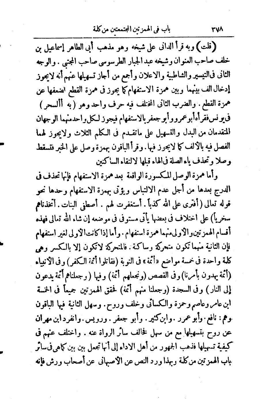 (قُلْتُ) : وَبِهِ قَرَأَ الدَّانِيُّ عَلَى شَيْخِهِ، وَهُوَ مَذْهَبُ أَبِي طَاهِرٍ إِسْمَاعِيلَ بْنِ خَلَفٍ صَاحِبِ " الْعُنْوَانِ " وَشَيْخِهِ عَبْدِ الْجَبَّارِ الطَّرَسُوسِيِّ صَاحِبِ " الْمُجْتَبَى "، وَالْوَجْهُ الثَّانِي فِي " التَّيْسِيرِ " وَ " الشَّاطِبِيَّةِ "، وَ " الْإِعْلَانِ "، وَأَجْمَعَ مَنْ أَجَازَ تَسْهِيلَهَا عَنْهُمْ أَنَّهُ لَا يَجُوزُ إِدْخَالُ أَلِفٍ بَيْنَهُمَا وَبَيْنَ هَمْزَةِ الِاسْتِفْهَامِ كَمَا يَجُوزُ فِي هَمْزَةِ الْقَطْعِ؛ لِضَعْفِهَا عَنْ هَمْزَةِ الْقَطْعِ. وَالضَّرْبُ الثَّانِي الْمُخْتَلَفِ فِيهِ حَرْفٌ وَاحِدٌ وَهُوَ (بِهِ أَالسِّحْرُ) فِي يُونُسَ، فَقَرَأَهُ أَبُو عَمْرٍو وَأَبُو جَعْفَرٍ بِالِاسْتِفْهَامِ، فَيَجُوزُ لِكُلِّ وَاحِدٍ مِنْهَا الْوَجْهَانِ الْمُتَقَدِّمَانِ مِنَ الْبَدَلِ وَالتَّسْهِيلِ عَلَى مَا تَقَدَّمَ فِي الْكَلِمِ الثَّلَاثِ، وَلَا يَجُوزُ لَهُمَا الْفَصْلُ فِيهِ بِالْأَلِفِ كَمَا يَجُوزُ فِيهَا، وَقَرَأَ الْبَاقُونَ بِهَمْزَةِ وَصْلٍ عَلَى الْخَبَرِ، فَتَسْقُطُ وَصْلًا، وَتُحْذَفُ يَاءُ الصِّلَةِ فِي الْهَاءِ قَبْلَهَا لِالْتِقَاءِ السَّاكِنَيْنِ.