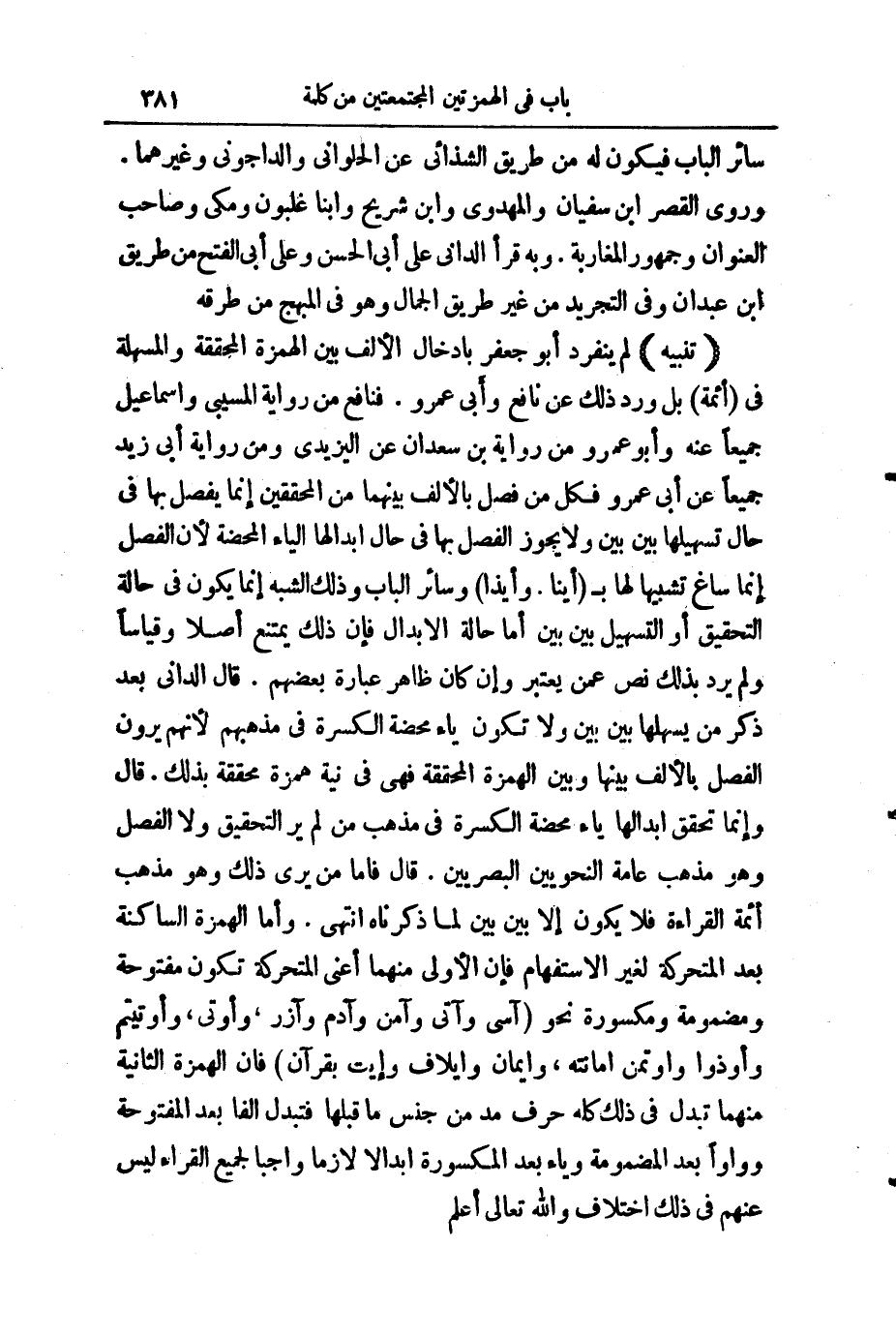 (تَنْبِيهٌ) لَمْ يَنْفَرِدْ أَبُو جَعْفَرٍ بِإِدْخَالِ الْأَلِفِ بَيْنَ الْهَمْزَةِ الْمُحَقَّقَةِ وَالْمُسَهَّلَةِ فِي (أَئِمَّةً) بَلْ وَرَدَ ذَلِكَ عَنْ نَافِعٍ وَأَبِي عَمْرٍو. فَنَافِعٌ، عَنْ رِوَايَةِ الْمُسَيَّبِيِّ وَإِسْمَاعِيلَ جَمِيعًا عَنْهُ، وَأَبُو عَمْرٍو مِنْ رِوَايَةِ ابْنِ سَعْدَانَ، عَنِ الْيَزِيدِيِّ، وَمِنْ رِوَايَةِ أَبِي زَيْدٍ جَمِيعًا، عَنْ أَبِي عَمْرٍو، فَكُلُّ مَنْ فَصَلَ بِالْأَلِفِ بَيْنَهُمَا مِنَ الْمُحَقِّقِينَ إِنَّمَا يَفْصِلُ بِهَا فِي حَالِ تَسْهِيلِهَا بَيْنَ بَيْنَ، وَلَا يَجُوزُ الْفَصْلُ بِهَا فِي حَالِ إِبْدَالِهَا الْيَاءَ الْمَحْضَةَ ; لِأَنَّ الْفَصْلَ إِنَّمَا سَاغَ تَشْبِيهًا لَهَا بِ (أَيِنَّا) ، (أَيِذَا) وَسَائِرِ الْبَابِ، وَذَلِكَ الشَّبَهُ، إِنَّمَا يَكُونُ فِي حَالَةِ التَّحْقِيقِ أَوِ التَّسْهِيلِ بَيْنَ بَيْنَ، أَمَّا حَالَةُ الْإِبْدَالِ، فَإِنَّ ذَلِكَ يَمْتَنِعُ أَصْلًا وَقِيَاسًا، وَلَمْ يَرِدْ بِذَلِكَ نَصٌّ عَمَّنْ يُعْتَبَرُ، وَإِنْ كَانَ ظَاهِرَ عِبَارَةِ بَعْضِهِمْ. قَالَ الدَّانِيُّ بَعْدَ ذِكْرِ مَنْ يُسَهِّلُهَا بَيْنَ بَيْنَ: وَلَا تَكُونُ يَاءً مَحْضَةَ الْكَسْرَةِ فِي مَذْهَبِهِمْ ; لِأَنَّهُمْ يَرَوْنَ الْفَصْلَ بِالْأَلِفِ بَيْنَهَا وَبَيْنَ الْهَمْزَةِ الْمُحَقَّقَةِ فِي نِيَّةِ هَمْزَةٍ مُحَقَّقَةٍ بِذَلِكَ. قَالَ: وَإِنَّمَا تَحَقَّقَ إِبْدَالُهَا يَاءً مَحْضَةَ الْكَسْرَةِ فِي مَذْهَبِ مَنْ لَمْ يَرَ التَّحْقِيقَ وَلَا الْفَصْلَ، وَهُوَ مَذْهَبُ عَامَّةِ النَّحْوِيِّينَ الْبَصْرِيِّينَ. قَالَ: فَأَمَّا مَنْ يَرَى ذَلِكَ، وَهُوَ مَذْهَبُ أَئِمَّةِ الْقُرَّاءِ، فَلَا يَكُونُ إِلَّا بَيْنَ بَيْنَ لِمَا ذَكَرْنَاهُ. انْتَهَى. وَأَمَّا الْهَمْزَةُ السَّاكِنَةُ بَعْدَ الْمُتَحَرِّكَةِ لِغَيْرِ الِاسْتِفْهَامِ فَإِنَّ الْأُولَى مِنْهُمَا - أَعْنِي الْمُتَحَرِّكَةَ - تَكُونُ مَفْتُوحَةً وَمَضْمُومَةً وَمَكْسُورَةً نَحْوُ (آسَى وَآتِي وَآمَنَ وَآدَمَ وَآزَرَ، وَأُوتِيَ، وَأُوتِيتُمْ، وَأُوذُوا، وَاؤْتُمِنَ أَمَانَتَهُ، وَإِيمَانٌ، وَإِيلَافِ، وَإِيتِ بِقُرْآنٍ) فَإِنَّ الْهَمْزَةَ الثَّانِيَةَ مِنْهُمَا تُبْدَلُ فِي ذَلِكَ كُلِّهِ حَرْفَ مَدٍّ مِنْ جِنْسِ مَا قَبْلَهَا، فَتُبْدَلُ أَلِفًا بَعْدَ الْمَفْتُوحَةِ، وَوَاوًا بَعْدَ الْمَضْمُومَةِ، وَيَاءً بَعْدَ الْمَكْسُورَةِ، إِبْدَالًا لَازِمًا وَاجِبًا لِجَمِيعِ الْقُرَّاءِ، لَيْسَ عَنْهُمْ فِي ذَلِكَ اخْتِلَافٌ، وَاللَّهُ تَعَالَى أَعْلَمُ.