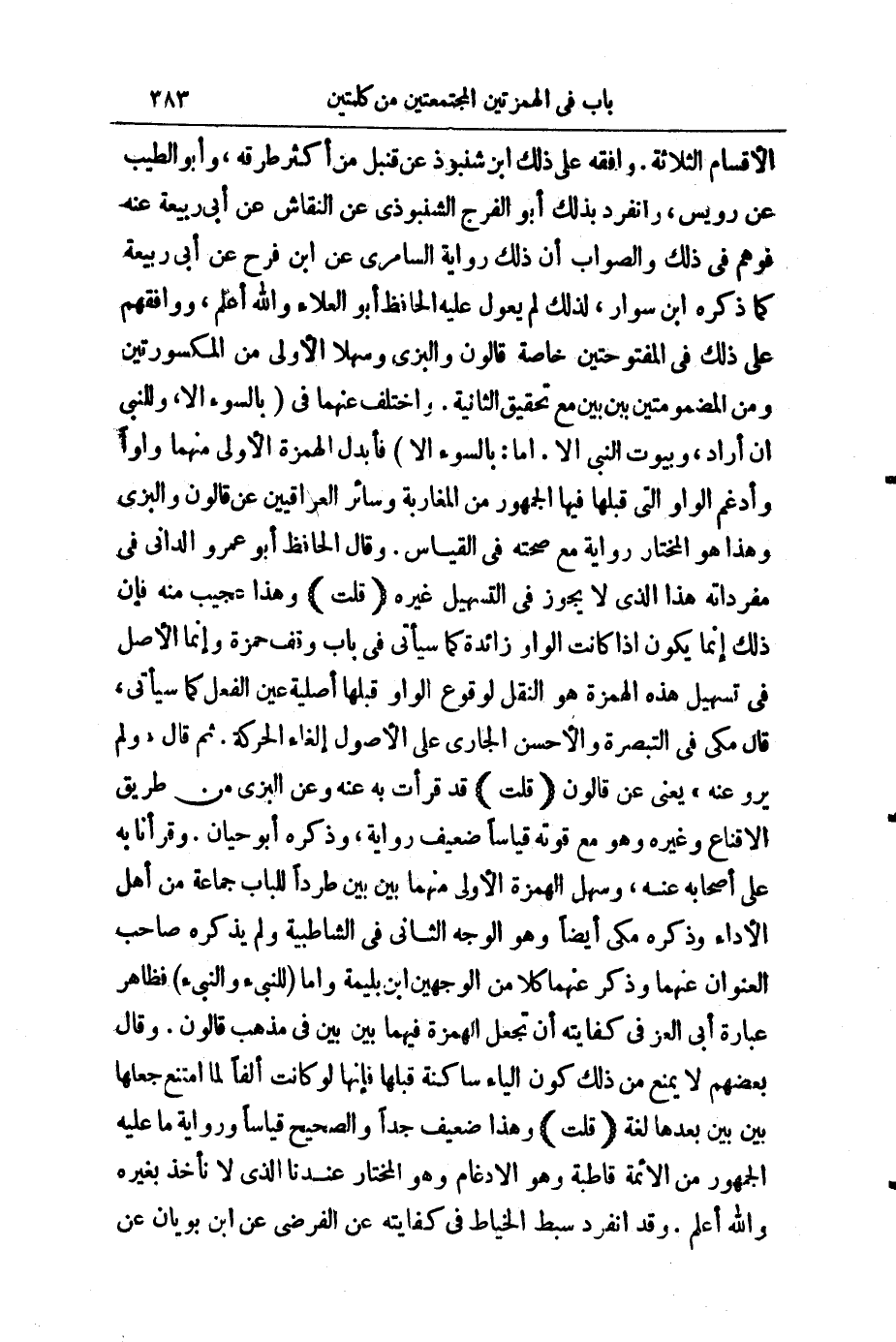 (قُلْتُ) : قَدْ قَرَأْتُ بِهِ عَنْهُ، وَعَنِ الْبَزِّيِّ مِنْ طَرِيقِ الْإِقْنَاعِ وَغَيْرِهِ، وَهُوَ مَعَ قُوَّتِهِ قِيَاسًا ضَعِيفٌ رِوَايَةً، وَذَكَرَهُ أَبُو حَيَّانَ، وَقَرَأْنَا بِهِ عَلَى أَصْحَابِهِ عَنْهُ، وَسَهَّلَ الْهَمْزَةَ الْأُولَى مِنْهُمَا بَيْنَ بَيْنَ؛ طَرْدًا لِلْبَابِ جَمَاعَةٌ مِنْ أَهْلِ الْأَدَاءِ، وَذَكَرَهُ مَكِّيٌّ أَيْضًا، وَهُوَ الْوَجْهُ الثَّانِي فِي الشَّاطِبِيَّةِ، وَلَمْ يَذْكُرْهُ صَاحِبُ " الْعُنْوَانِ " عَنْهُمَا. وَذَكَرَ عَنْهُمَا كُلًّا مِنَ الْوَجْهَيْنِ ابْنُ بَلِّيمَةَ، وَأَمَّا (لِلنَّبِيءِ) ، وَ (النَّبِيءُ) فَظَاهِرُ عِبَارَةِ أَبِي الْعِزِّ فِي كِفَايَتِهِ أَنْ تُجْعَلَ الْهَمْزَةُ فِيهِمَا بَيْنَ بَيْنَ فِي مَذْهَبِ قَالُونَ، وَقَالَ بَعْضُهُمْ: لَا يَمْنَعُ مِنْ ذَلِكَ كَوْنُ الْيَاءِ سَاكِنَةً قَبْلَهَا، فَإِنَّهَا لَوْ كَانَتْ أَلِفًا لَمَا امْتَنَعَ جَعْلُهَا بَيْنَ بَيْنَ بَعْدَهَا لُغَةً.