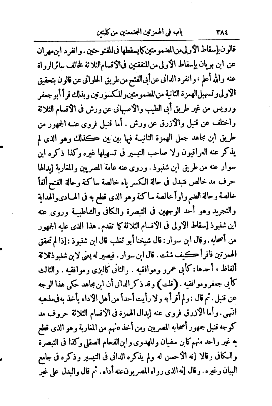 (قُلْتُ) : وَقَدْ ذَكَرَ الدَّانِيُّ أَنَّ ابْنَ مُجَاهِدٍ حَكَى هَذَا الْوَجْهَ عَنْ قُنْبُلٍ. ثُمَّ قَالَ: وَلَمْ أَقْرَأْ بِهِ، وَلَا رَأَيْتُ أَحَدًا مِنْ أَهْلِ الْأَدَاءِ يَأْخُذُ فِي مَذْهَبِهِ. انْتَهَى. وَأَمَّا الْأَزْرَقُ فَرَوَى عَنْهُ إِبْدَالَ الْهَمْزَةِ فِي الْأَقْسَامِ الثَّلَاثَةِ حُرُوفَ مَدٍّ كَوَجْهِ قُنْبُلٍ جُمْهُورُ أَصْحَابِ الْمِصْرِيِّينَ، وَمَنْ أَخَذَ عَنْهُمْ مِنَ الْمَغَارِبَةِ، وَهُوَ الَّذِي قَطَعَ بِهِ غَيْرُ وَاحِدٍ مِنْهُمْ، كَابْنِ سُفْيَانَ، وَالْمَهْدَوِيِّ، وَابْنِ الْفَحَّامِ الصَّقَلِّيِّ، وَكَذَا فِي " التَّبْصِرَةِ "، وَ " الْكَافِي "، وَقَالَا: إِنَّهُ الْأَحْسَنُ لَهُ، وَلَمْ يَذْكُرْهُ الدَّانِيُّ فِي " التَّيْسِيرِ "، وَذَكَرَهُ فِي " جَامِعِ الْبَيَانِ "، وَغَيْرِهِ، وَقَالَ: إِنَّهُ الَّذِي رَوَاهُ الْمِصْرِيُّونَ عَنْهُ أَدَاءً. ثُمَّ قَالَ: وَالْبَدَلُ عَلَى غَيْرِ