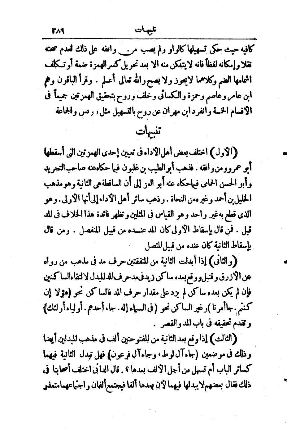 (الثَّالِثُ) إِذَا وَقَعَ بَعْدَ الثَّانِيَةِ مِنَ الْمَفْتُوحَتَيْنِ أَلِفٌ فِي مَذْهَبِ الْمُبْدِلِينَ أَيْضًا، وَذَلِكَ فِي مَوْضِعَيْنِ جَاءَ آلَ لُوطٍ، وَجَاءَ آلَ فِرْعَوْنَ فَهَلْ تُبْدَلُ الثَّانِيَةُ فِيهِمَا كَسَائِرِ الْبَابِ أَمْ تُسَهَّلُ مِنْ أَجْلِ الْأَلِفِ بَعْدَهَا؟ قَالَ الدَّانِيُّ: اخْتَلَفَ أَصْحَابُنَا فِي ذَلِكَ، فَقَالَ بَعْضُهُمْ: لَا يُبْدِلُهَا فِيهِمَا ; لِأَنَّ بَعْدَهَا أَلِفًا فَيَجْتَمِعُ أَلِفَانِ وَاجْتِمَاعُهُمَا مُتَعَذِّرٌ،