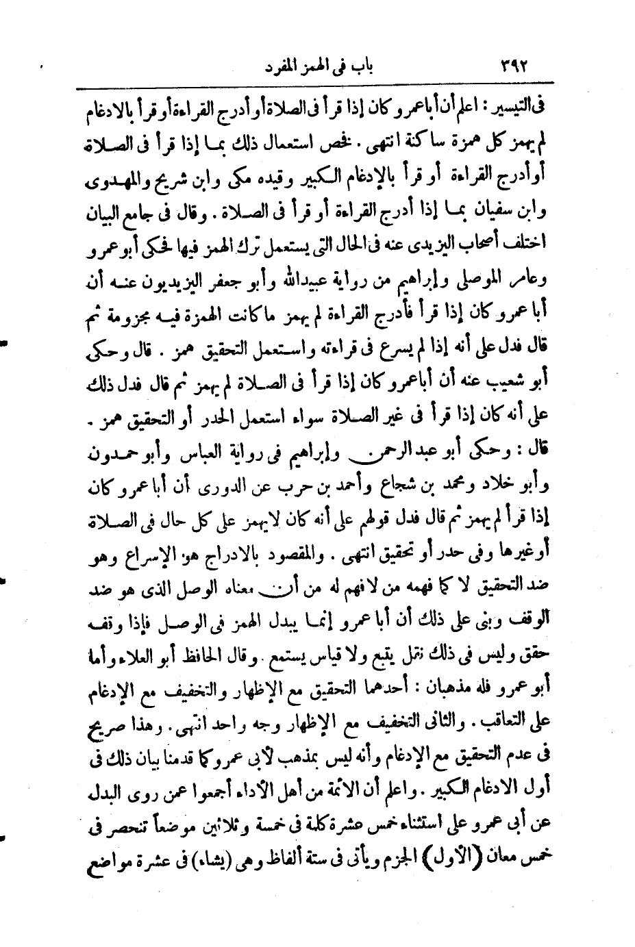 قَالَ: وَحَكَى أَبُو عَبْدِ الرَّحْمَنِ، وَإِبْرَاهِيمُ فِي رِوَايَةِ الْعَبَّاسِ وَأَبُو حَمْدُونٍ وَأَبُو خَلَّادٍ وَمُحَمَّدُ بْنُ شُجَاعٍ، وَأَحْمَدُ بْنُ حَرْبٍ، عَنِ الدُّورِيِّ، أَنَّ أَبَا عَمْرٍو كَانَ إِذَا قَرَأَ لَمْ يَهْمِزْ، ثُمَّ قَالَ: فَدَلَّ قَوْلُهُمْ أَنَّهُ كَانَ لَا يَهْمِزُ عَلَى كُلِّ حَالٍ فِي الصَّلَاةِ أَوْ غَيْرِهَا، وَفِي حَدْرٍ أَوْ تَحْقِيقٍ. انْتَهَى.