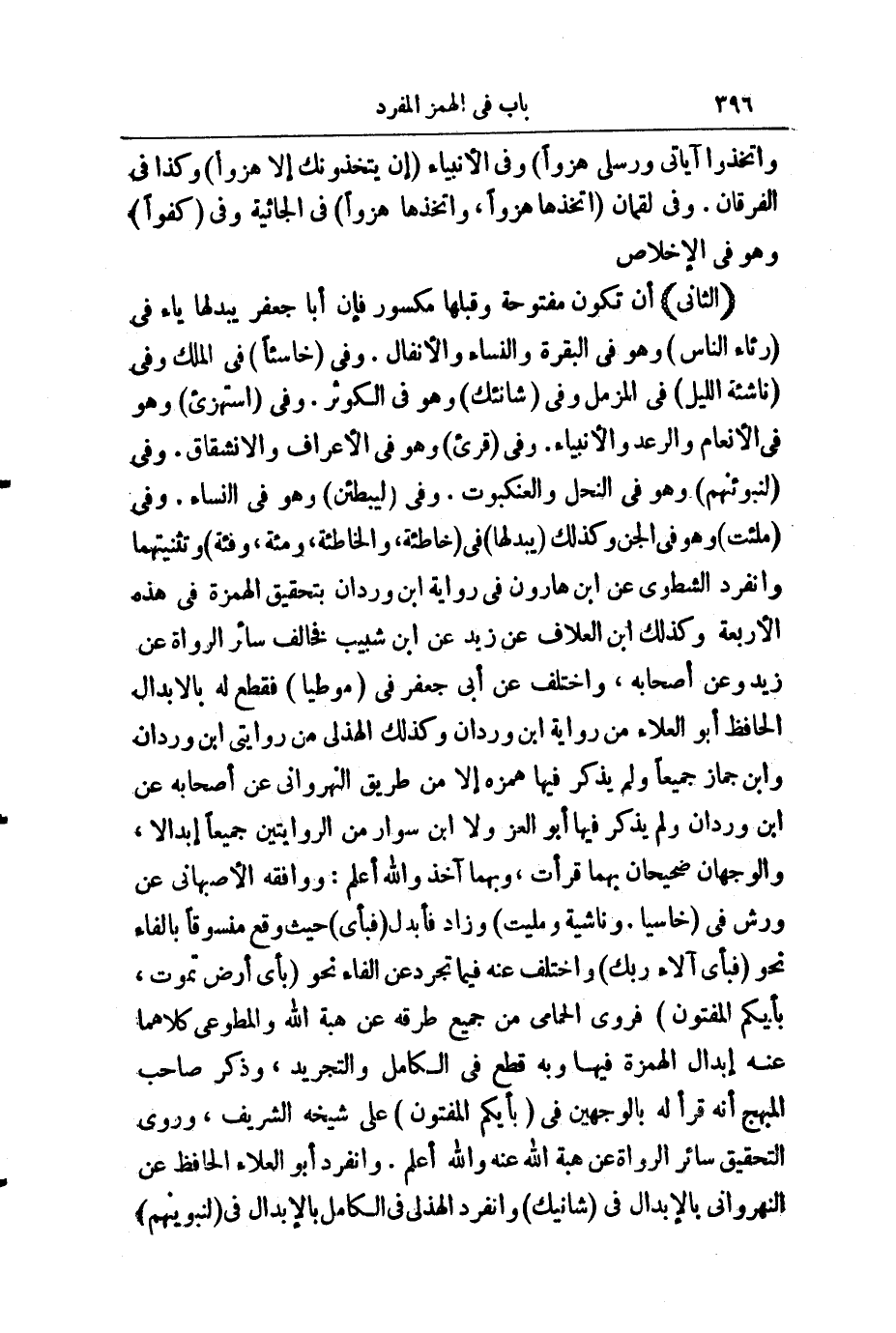 (الثَّانِي) أَنْ تَكُونَ مَفْتُوحَةً وَقَبْلَهَا مَكْسُورٌ، فَإِنَّ أَبَا جَعْفَرٍ يُبْدِلُهَا يَاءً فِي (رِئَاءَ النَّاسِ) ، وَهُوَ فِي الْبَقَرَةِ وَالنِّسَاءِ وَالْأَنْفَالِ، وَفِي (خَاسِئًا) فِي الْمُلْكِ، وَفِي (نَاشِئَةَ اللَّيْلِ) فِي الْمُزَّمِّلِ، وَفِي (شَانِئَكَ) ، وَهُوَ فِي الْكَوْثَرِ، وَفِي (اسْتُهْزِئَ) ، وَهُوَ فِي الْأَنْعَامِ وَالرَّعْدِ وَالْأَنْبِيَاءِ، وَفِي (قُرِئَ) ، وَهُوَ فِي الْأَعْرَافِ وَالِانْشِقَاقِ، وَفِي (لَنُبَوِّئَنَّهُمْ) ، وَهُوَ فِي النَّحْلِ وَالْعَنْكَبُوتِ، وَفِي (لَيُبَطِّئَنَّ) ، وَهُوَ فِي النِّسَاءِ، وَفِي (مُلِئَتْ) ، وَهُوَ فِي الْجِنِّ، وَكَذَلِكَ (يُبْدِلُهَا) فِي (خَاطِئَةٍ، وَالْخَاطِئَةُ، وَمِئَةَ، وَفِئَةٍ) وَتَثْنِيَتُهُمَا، وَانْفَرَدَ الشَّطَوِيُّ عَنِ ابْنِ هَارُونَ فِي رِوَايَةِ ابْنِ وَرْدَانَ بِتَحْقِيقِ الْهَمْزَةِ فِي هَذِهِ الْأَرْبَعَةِ، وَكَذَلِكَ ابْنُ الْعَلَّافِ، عَنْ زَيْدٍ عَنِ ابْنِ شَبِيبٍ، فَخَالَفَ سَائِرَ الرُّوَاةِ عَنْ زَيْدٍ وَعَنْ أَصْحَابِهِ، وَاخْتُلِفَ عَنْ أَبِي جَعْفَرٍ فِي (مَوْطِيًا) فَقَطَعَ لَهُ بِالْإِبْدَالِ الْحَافِظُ أَبُو الْعَلَاءِ مِنْ رِوَايَةِ ابْنِ وَرْدَانَ، وَكَذَلِكَ الْهُذَلِيُّ مِنْ رِوَايَتَيِ ابْنِ وَرْدَانَ وَابْنِ جَمَّازٍ جَمِيعًا، وَلَمْ يُذْكَرْ فِيهَا هَمْزَةٌ إِلَّا مِنْ طَرِيقِ النَّهْرَوَانِيِّ، عَنْ أَصْحَابِهِ عَنِ ابْنِ وَرْدَانَ وَلَمْ يَذْكُرْ فِيهَا أَبُو الْعِزِّ وَلَا ابْنُ سَوَّارٍ مِنَ الرِّوَايَتَيْنِ جَمِيعًا إِبْدَالًا، وَالْوَجْهَانِ صَحِيحَانِ، بِهِمَا قَرَأْتُ، وَبِهِمَا آخُذُ، وَاللَّهُ أَعْلَمُ.