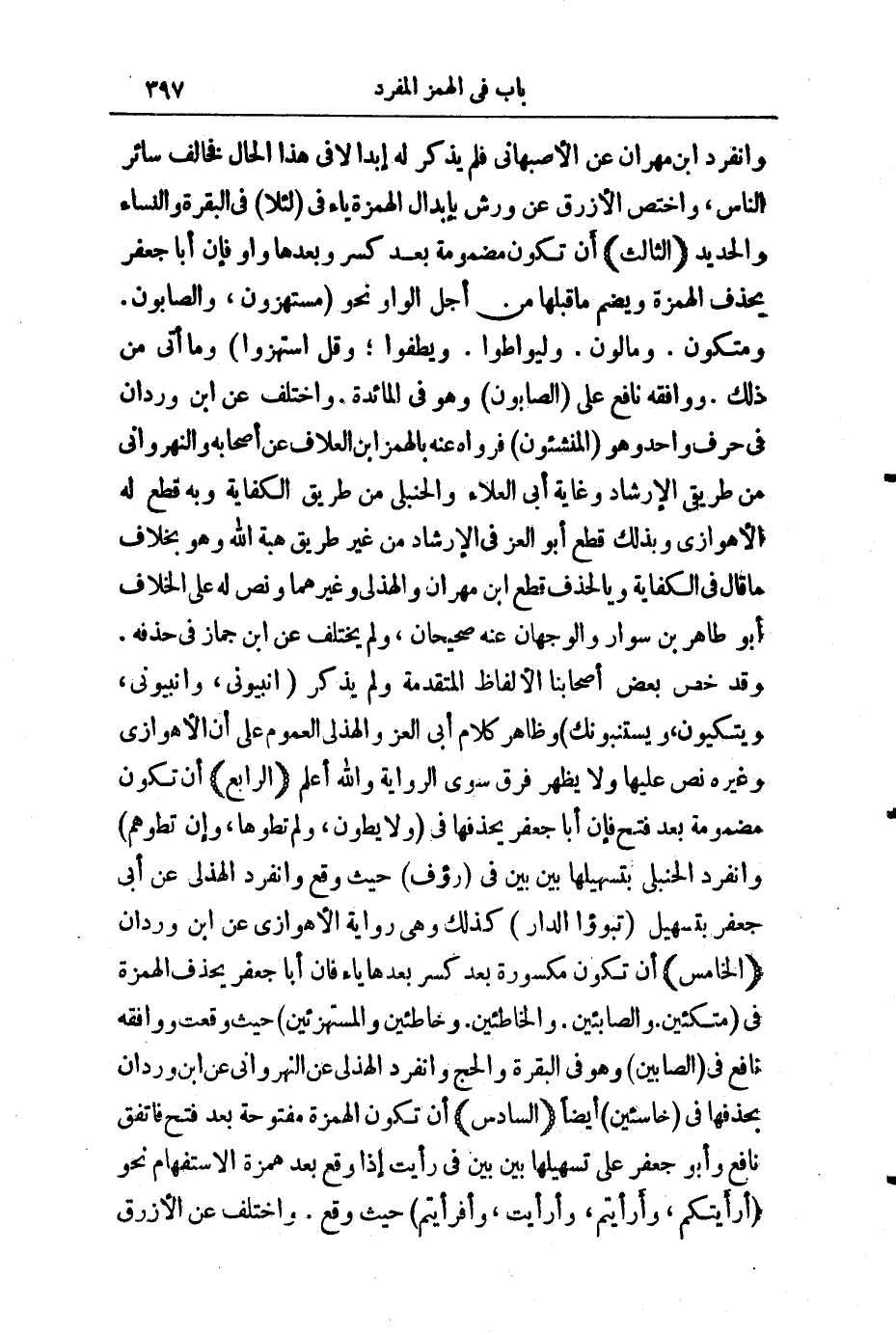 وَانْفَرَدَ ابْنُ مِهْرَانَ عَنِ الْأَصْبَهَانِيِّ فَلَمْ يَذْكُرْ لَهُ إِبْدَالًا فِي هَذَا الْحَالِ، فَخَالَفَ سَائِرَ النَّاسِ، وَاخْتَصَّ الْأَزْرَقُ عَنْ وَرْشٍ بِإِبْدَالِ الْهَمْزَةِ يَاءً فِي (لِئَلَّا) فِي الْبَقَرَةِ وَالنِّسَاءِ وَالْحَدِيدِ.