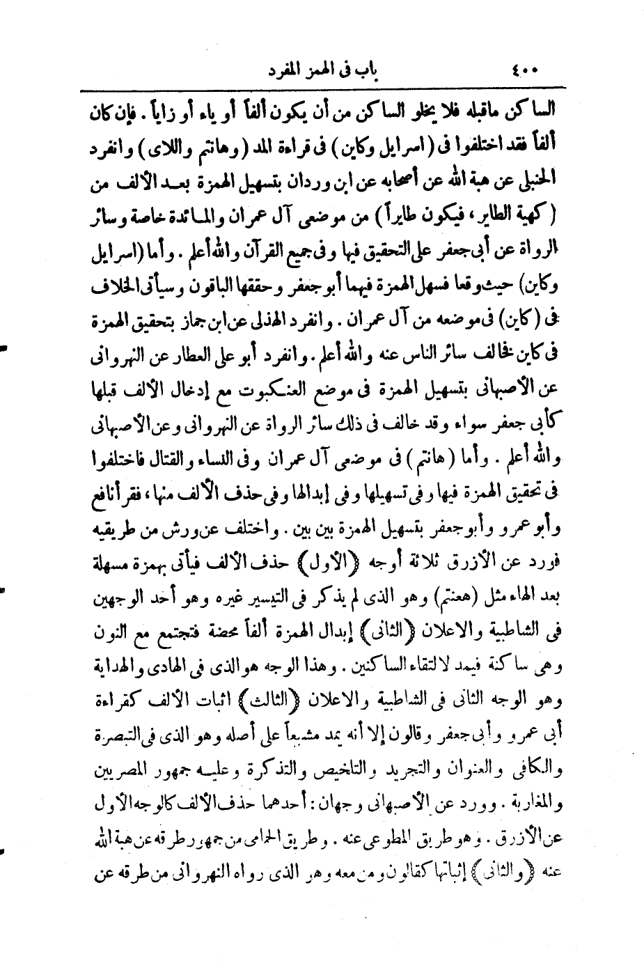 السَّاكِنُ مَا قَبْلَهُ فَلَا يَخْلُو السَّاكِنُ مِنْ أَنْ يَكُونَ أَلِفًا، أَوْ يَاءً، أَوْ زَايًا. فَإِنْ كَانَ أَلِفًا فَقَدِ اخْتَلَفُوا فِي (اسْرَايِلَ وَكَايِّنْ) فِي قِرَاءَةِ الْمَدِّ (وَهَانْتُمْ وَاللَّايِ) وَانْفَرَدَ الْحَنْبَلِيُّ، عَنْ هِبَةِ اللَّهِ، عَنْ أَصْحَابِهِ، عَنِ ابْنِ وَرْدَانَ بِتَسْهِيلِ الْهَمْزَةِ بَعْدَ الْأَلِفِ مِنْ (كَهَيَّةِ الطَّايِرِ، فَيَكُونُ طَايِرًا) مِنْ مَوْضِعَيْ آلِ عِمْرَانَ وَالْمَائِدَةِ خَاصَّةً، وَسَائِرُ الرُّوَاةِ عَنْ أَبِي جَعْفَرٍ عَلَى التَّحْقِيقِ فِيهَا وَفِي جَمِيعِ الْقُرْآنِ، وَاللَّهُ أَعْلَمُ.