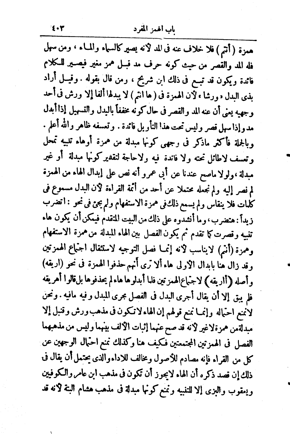 وَبِالْجُمْلَةِ فَأَكْثَرُ مَا ذُكِرَ فِي وَجْهَيْ كَوْنِهَا مُبْدَلَةً مِنْ هَمْزَةٍ أَوْ هَاءِ تَنْبِيهٍ تَمَحُّلٌ وَتَعَسُّفٌ لَا طَائِلَ تَحْتَهُ، وَلَا فَائِدَةَ فِيهِ، وَلَا حَاجَةَ لِتَقْدِيرِ كَوْنِهَا مُبْدَلَةً، أَوْ غَيْرَ مُبْدَلَةٍ، وَلَوْلَا مَا صَحَّ عِنْدَنَا عَنْ أَبِي عَمْرٍو أَنَّهُ نَصَّ عَلَى إِبْدَالِ الْهَاءِ مِنَ الْهَمْزَةِ لَمْ نَصِرْ إِلَيْهِ، وَلَمْ نَجْعَلْهُ مُحْتَمَلًا عَنْ أَحَدٍ مِنْ أَئِمَّةِ الْقُرَّاءِ ; لِأَنَّ الْبَدَلَ مَسْمُوعٌ فِي كَلِمَاتٍ، فَلَا يَنْقَاسُ، وَلَمْ يُسْمَعْ ذَلِكَ فِي هَمْزَةِ الِاسْتِفْهَامِ، وَلِمَ يَجِئْ فِي نَحْوِ: أَتَضْرِبُ زَيْدًا " هَتَضْرِبُ زَيْدًا "، وَمَا أَنْشَدُوهُ عَلَى ذَلِكَ مِنَ الْبَيْتِ الْمُتَقَدِّمَ فَيُمْكِنُ أَنْ يَكُونَ هَاءَ تَنْبِيهٍ وَقُصِرَتْ كَمَا تَقَدَّمَ، ثُمَّ يَكُونُ الْفَصْلُ بَيْنَ الْهَاءِ الْمُبْدَلَةِ مِنْ هَمْزَةِ الِاسْتِفْهَامِ وَهَمْزَةِ (أَنْتُمْ) لَا يُنَاسِبُ ; لِأَنَّهُ إِنَّمَا فَصَلَ التَّوْجِيهَ لِاسْتِقْبَالِ اجْتِمَاعِ الْهَمْزَتَيْنِ، وَقَدْ زَالَ هُنَا بِإِبْدَالِ الْأُولَى هَاءً، أَلَا تَرَى أَنَّهُمْ حَذَفُوا الْهَمْزَةَ فِي نَحْوِ (ارِيقُهُ) وَأَصِلُهُ (أَأُرِيقُهُ) لِاجْتِمَاعِ الْهَمْزَتَيْنِ، فَلَمَّا أَبْدَلُوهَا هَاءً لَمْ يَحْذِفُوهَا، بَلْ قَالُوا: أُهْرِيقُهُ، فَلَمْ يَبْقَ إِلَّا أَنْ يُقَالَ: أُجْرِيَ الْبَدَلُ فِي الْفَصْلِ مَجْرَى الْمُبْدَلِ، وَفِيهِ مَا فِيهِ، وَنَحْنُ لَا نَمْنَعُ احْتِمَالَهُ، وَإِنَّمَا نَمْنَعُ قَوْلَهُمْ: إِنَّ الْهَاءَ لَا تَكُونُ فِي مَذْهَبِ وَرْشٍ وَقُنْبُلٍ إِلَّا مُبْدَلَةً مِنْ هَمْزَةٍ لَا غَيْرَ ; لِأَنَّهُ قَدْ صَحَّ عَنْهُمَا إِثْبَاتُ الْأَلِفِ بَيْنَهُمَا، وَلَيْسَ مِنْ مَذْهَبِهِمَا الْفَصْلُ فِي الْهَمْزَتَيْنِ الْمُجْتَمِعَتَيْنِ، فَكَيْفَ هُنَا؟ وَكَذَلِكَ نَمْنَعُ احْتِمَالَ الْوَجْهَيْنِ عَنْ كُلٍّ مِنَ الْقُرَّاءِ؛ فَإِنَّهُ مُصَادِمٌ لِلْأُصُولِ وَمُخَالِفٌ لِلْأَدَاءِ، وَالَّذِي يُحْتَمَلُ أَنْ يُقَالَ فِي ذَلِكَ: إِنَّ قَصْدَ ذِكْرِهِ أَنَّ الْهَاءَ لَا يَجُوزُ أَنْ تَكُونَ فِي مَذْهَبِ ابْنِ عَامِرٍ، وَالْكُوفِيِّينَ وَيَعْقُوبَ وَالْبَزِّيِّ إِلَّا لِلتَّنْبِيهِ، وَنَمْنَعُ كَوْنَهَا مُبْدَلَةً فِي مَذْهَبِ هِشَامٍ أَلْبَتَّةَ ; لِأَنَّهُ قَدْ