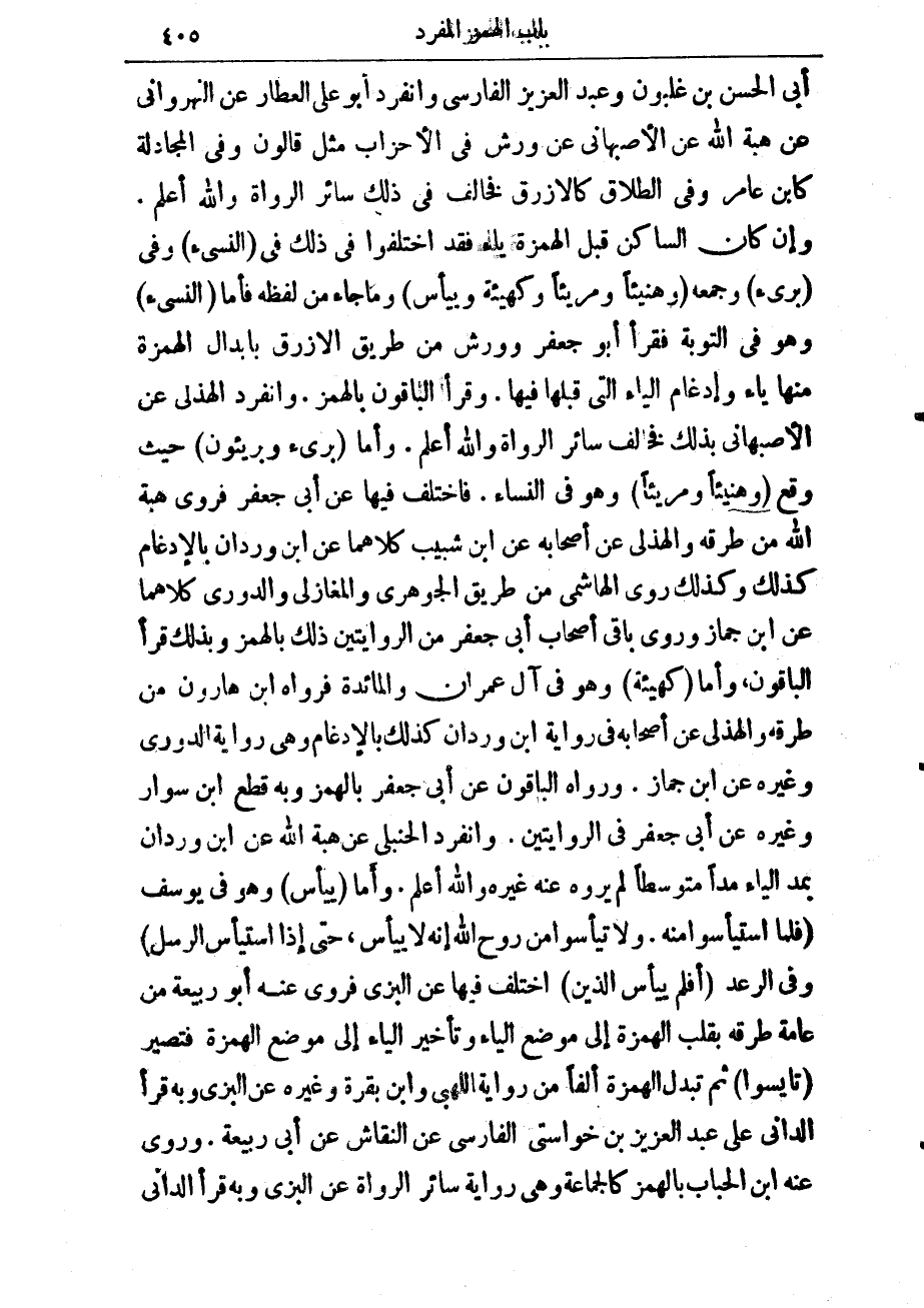 وَأَمَّا (بَرِيءٌ وَبَرِيئُونَ) حَيْثُ وَقَعَ (وَهَنِيئًا وَمَرِيئًا) ، وَهُوَ فِي النِّسَاءِ فَاخْتُلِفَ فِيهَا، عَنْ أَبِي جَعْفَرٍ، فَرَوَى هِبَةُ اللَّهِ مِنْ طُرُقِهِ وَالْهُذَلِيُّ عَنْ أَصْحَابِهِ عَنِ ابْنِ شَبِيبٍ كِلَاهُمَا عَنِ ابْنِ وَرْدَانَ بِالْإِدْغَامِ كَذَلِكَ، وَكَذَلِكَ رَوَى الْهَاشِمِيُّ مِنْ طَرِيقِ الْجَوْهَرِيِّ وَالْمَغَازِلِيِّ وَالدُّورِيِّ، كِلَاهُمَا عَنِ ابْنِ جَمَّازٍ، وَرَوَى بَاقِي أَصْحَابُ أَبِي جَعْفَرٍ مِنَ الرِّوَايَتَيْنِ ذَلِكَ بِالْهَمْزِ، وَبِذَلِكَ قَرَأَ الْبَاقُونَ، وَأَمَّا (كَهَيْئَةِ) وَهُوَ فِي آلِ عِمْرَانَ وَالْمَائِدَةِ، فَرَوَاهُ ابْنُ هَارُونَ مِنْ طُرُقِهِ، وَالْهُذَلِيُّ، عَنْ أَصْحَابِهِ فِي رِوَايَةِ ابْنِ وَرْدَانَ كَذَلِكَ بِالْإِدْغَامِ، وَهِيَ رِوَايَةُ الدُّورِيِّ وَغَيْرِهِ، عَنِ ابْنِ جَمَّازٍ، وَرَوَاهُ الْبَاقُونَ عَنْ أَبِي جَعْفَرٍ بِالْهَمْزِ، وَبِهِ قَطَعَ ابْنُ سَوَّارٍ وَغَيْرُهُ عَنْ أَبِي جَعْفَرٍ فِي الرِّوَايَتَيْنِ، وَانْفَرَدَ الْحَنْبَلِيُّ عَنْ هِبَةِ اللَّهِ عَنِ ابْنِ وَرْدَانَ بِمَدِّ الْيَاءِ مَدًّا مُتَوَسِّطًا، وَلَمْ يَرْوِهِ عَنْهُ غَيْرُهُ، وَاللَّهُ أَعْلَمُ.