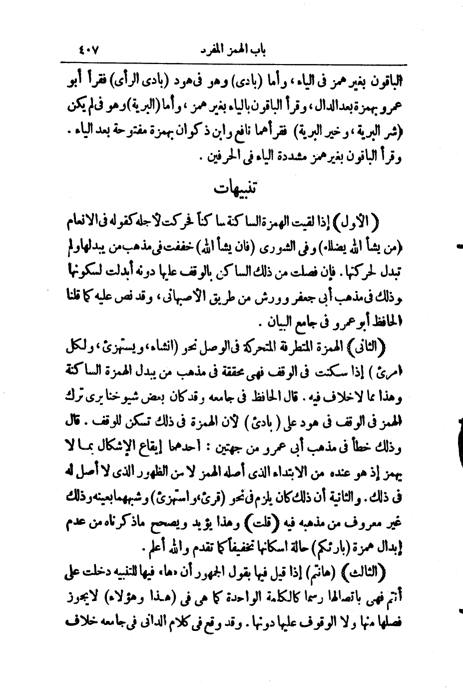 الْبَاقُونَ بِغَيْرِ هَمْزٍ، وَأَمَّا (بَادِيَ) وَهُوَ فِي هُودَ (بَادِيَ الرَّأْيِ) فَقَرَأَ أَبُو عَمْرٍو بِهَمْزَةٍ بَعْدَ الدَّالِّ، وَقَرَأَ الْبَاقُونَ بِغَيْرِ هَمْزٍ، وَأَمَّا (الْبَرِيَّةِ) وَهُوَ فِي " لَمْ يَكُنْ " (شَرُّ الْبَرِيَّةِ) ، وَ (خَيْرُ الْبَرِيَّةِ) فَقَرَأَهُمَا نَافِعٌ وَابْنُ ذَكْوَانَ بِهَمْزَةٍ مَفْتُوحَةٍ بَعْدَ الْيَاءِ، وَقَرَأَ الْبَاقُونَ بِغَيْرِ هَمْزٍ مُشَدَّدَةَ الْيَاءِ فِي الْحَرْفَيْنِ.