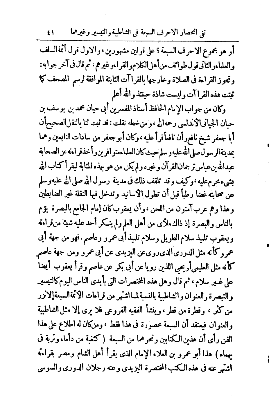 وَكَانَ مِنْ جَوَابِ الْإِمَامِ الْحَافِظِ أُسْتَاذِ الْمُفَسِّرِينَ أَبِي حَيَّانَ مُحَمَّدِ بْنِ يُوسُفَ بْنِ حَيَّانَ الْجَيَّانِيِّ الْأَنْدَلُسِيِّ - رَحِمَهُ اللَّهُ -، وَمِنْ خَطِّهِ نَقَلْتُ: قَدْ ثَبَتَ لَنَا بِالنَّقْلِ الصَّحِيحِ أَنَّ أَبَا جَعْفَرٍ شَيْخُ نَافِعٍ، وَأَنَّ نَافِعًا قَرَأَ عَلَيْهِ، وَكَانَ أَبُو جَعْفَرٍ مِنْ سَادَاتِ التَّابِعِينَ وَهُمَا بِمَدِينَةِ الرَّسُولِ - صَلَّى اللَّهُ عَلَيْهِ وَسَلَّمَ -، حَيْثُ كَانَ الْعُلَمَاءُ مُتَوَافِرِينَ وَأَخَذَ قِرَاءَتَهُ عَنِ الصَّحَابَةِ عَبْدِ اللَّهِ بْنِ عَبَّاسٍ تَرْجُمَانِ الْقُرْآنِ وَغَيْرِهِ وَلَمْ يَكُنْ مَنْ هُوَ بِهَذِهِ الْمَثَابَةِ لِيَقْرَأَ كِتَابَ اللَّهِ بِشَيْءٍ مُحَرَّمٍ عَلَيْهِ، وَكَيْفَ وَقَدْ تَلَقَّفَ ذَلِكَ فِي مَدِينَةِ رَسُولِ اللَّهِ - صَلَّى اللَّهُ عَلَيْهِ وَسَلَّمَ - عَنْ صَحَابَتِهِ غَضًّا رَطْبًا قَبْلَ أَنْ تَطُولَ الْأَسَانِيدُ وَتَدْخُلَ فِيهَا النَّقَلَةُ غَيْرُ الضَّابِطِينَ، وَهَذَا وَهُمْ عَرَبٌ آمِنُونَ مِنَ اللَّحْنِ، وَأَنَّ يَعْقُوبَ كَانَ إِمَامَ الْجَامِعِ بِالْبَصْرَةِ يَؤُمُّ بِالنَّاسِ، وَالْبَصْرَةُ إِذْ ذَاكَ مَلْأَى مِنْ أَهْلِ الْعِلْمِ، وَلَمْ يُنْكِرْ أَحَدٌ عَلَيْهِ شَيْئًا مِنْ قِرَاءَتِهِ وَيَعْقُوبُ تِلْمِيذُ سَلَّامٍ الطَّوِيلِ وَسَلَّامٌ تِلْمِيذُ أَبِي عَمْرٍو وَعَاصِمٍ، فَهُوَ مِنْ جِهَةِ أَبِي عَمْرٍو كَأَنَّهُ مِثْلُ الدُّورِيِّ الَّذِي رَوَى عَنِ الْيَزِيدِيِّ عَنْ أَبِي عَمْرٍو وَمِنْ جِهَةِ عَاصِمٍ كَأَنَّهُ مِثْلُ الْعُلَيْمِيِّ، أَوْ يَحْيَى اللَّذَيْنِ رَوَيَا عَنْ أَبِي بَكْرٍ عَنْ عَاصِمٍ وَقَرَأَ يَعْقُوبُ أَيْضًا عَلَى غَيْرِ سَلَّامٍ، ثُمَّ قَالَ: وَهَلْ هَذِهِ الْمُخْتَصَرَاتُ الَّتِي بِأَيْدِي النَّاسِ الْيَوْمَ كَالتَّيْسِيرِ وَالتَّبْصِرَةِ وَالْعُنْوَانِ وَالشَّاطِبِيَّةِ بِالنِّسْبَةِ لِمَا اشْتَهَرَ مِنْ قِرَاءَاتِ الْأَئِمَّةِ السَّبْعَةِ إِلَّا نَزْرٌ مِنْ كُثْرٍ، وَقَطْرَةٌ مِنْ قَطْرٍ، وَيَنْشَأُ الْفَقِيهُ الْفُرُوعِيُّ فَلَا يَرَى إِلَّا مِثْلَ الشَّاطِبِيَّةِ وَالْعُنْوَانِ فَيَعْتَقِدُ أَنَّ السَّبْعَةَ مَحْصُورَةٌ فِي هَذَا فَقَطْ، وَمَنْ كَانَ لَهُ اطِّلَاعٌ عَلَى هَذَا الْفَنِّ رَأَى أَنَّ هَذَيْنِ الْكِتَابَيْنِ وَنَحْوَهُمَا مِنَ السَّبْعَةِ (كَثَغْبَةٍ مِنْ دَأْمَاءَ وَتُرْبَةٍ فِي بَهْمَاءَ) هَذَا أَبُو عَمْرِو بْنُ الْعَلَاءِ الْإِمَامُ الَّذِي يَقْرَأُ أَهْلُ الشَّامِ وَمِصْرَ بِقِرَاءَتِهِ اشْتَهَرَ عَنْهُ فِي هَذِهِ الْكُتُبِ الْمُخْتَصَرَةِ الْيَزِيدِيُّ وَعَنْهُ رَجُلَانِ الدُّورِيُّ وَالسُّوسِيُّ