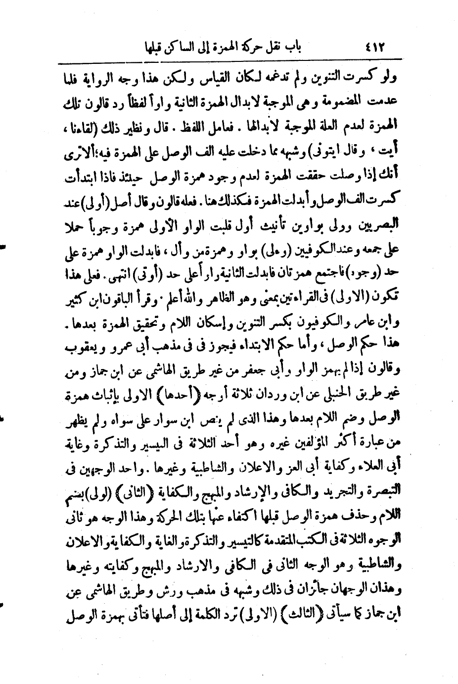 وَلَوْ كَسَرْتَ التَّنْوِينَ وَلَمْ تُدْغِمْهُ لَكَانَ الْقِيَاسُ، وَلَكِنْ هَذَا وَجْهُ الرِّوَايَةِ، فَلَمَّا عَدِمَتِ الْمَضْمُومَةُ وَهِيَ الْمُوجِبَةُ لِإِبْدَالِ الْهَمْزَةِ وَاوًا لَفْظًا رَدَّ قَالُونُ تِلْكَ الْهَمْزَةَ لِعَدَمِ الْعِلَّةِ الْمُوجِبَةِ لِإِبْدَالِهَا. فَعَامَلَ اللَّفْظَ. قَالَ: وَنَظِيرُ ذَلِكَ (لِقَاءَنَا، ايْتِ، وَقَالَ ايْتُونِي) وَشِبْهُهُ مِمَّا دَخَلَتْ عَلَيْهِ أَلِفُ الْوَصْلِ عَلَى الْهَمْزَةِ فِيهِ، أَلَا تَرَى أَنَّكَ إِذَا وَصَلْتَ حَقَّقْتَ الْهَمْزَةَ لِعَدَمِ وُجُودِ هَمْزَةِ الْوَصْلِ حِينَئِذٍ، فَإِذَا ابْتَدَأْتَ كَسَرْتَ أَلِفَ الْوَصْلِ، وَأَبْدَلْتَ الْهَمْزَةَ، فَكَذَلِكَ هُنَا. فَعَلَهُ قَالُونَ وَقَالَ: أَصْلُ (أُولَى) عِنْدَ الْبَصْرِيِّينَ " وُولَى " بِوَاوَيْنِ - تَأْنِيثُ أَوَّلٍ - قُلِبَتِ الْوَاوُ الْأُولَى هَمْزَةً وُجُوبًا حَمْلًا عَلَى جَمْعِهِ، وَعِنْدَ الْكُوفِيِّينَ (وُءْلَى) بِوَاوٍ وَهَمْزَةٍ مِنْ وَأَلَ، فَأُبْدِلَتِ الْوَاوُ هَمْزَةً عَلَى حَدِّ (وُجُوهٍ) فَاجْتَمَعَ هَمْزَتَانِ، فَأُبْدِلَتِ الثَّانِيَةُ وَاوًا عَلَى حَدِّ (أُوتِيَ) انْتَهَى. فَعَلَى هَذَا تَكُونُ (الْأُولَى) فِي الْقِرَاءَتَيْنِ بِمَعْنًى، وَهُوَ الظَّاهِرُ، وَاللَّهُ أَعْلَمُ.