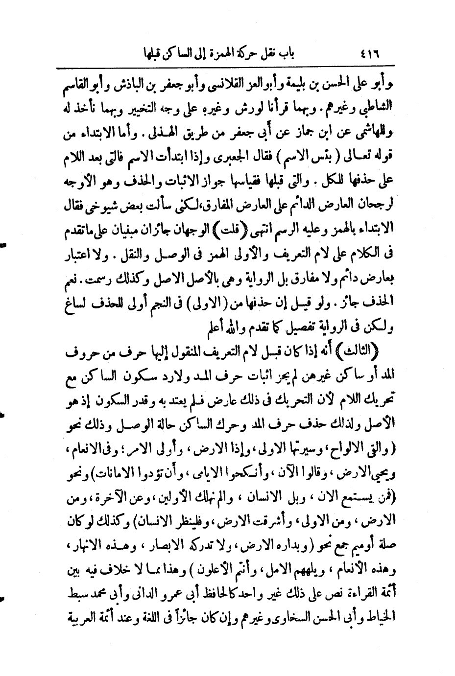 (الثَّالِثُ) أَنَّهُ إِذَا كَانَ قَبْلَ لَامِ التَّعْرِيفِ الْمَنْقُولِ إِلَيْهَا حَرْفٌ مِنْ حُرُوفِ الْمَدِّ، أَوْ سَاكِنٌ غَيْرُهُنَّ لَمْ يَجُزْ إِثْبَاتُ حَرْفِ الْمَدِّ، وَلَا رَدُّ سُكُونِ السَّاكِنِ مَعَ تَحْرِيكِ اللَّامِ ; لِأَنَّ التَّحْرِيكَ فِي ذَلِكَ عَارِضٌ، فَلَمْ يُعْتَدَّ بِهِ، وَقُدِّرَ السُّكُونُ؛ إِذْ هُوَ الْأَصْلُ، وَلِذَلِكَ حُذِفَ حَرْفُ الْمَدِّ، وَحُرِّكَ السَّاكِنُ حَالَةَ الْوَصْلِ، وَذَلِكَ نَحْوُ (وَأَلْقَى الْأَلْوَاحَ) ، وَ (سِيرَتَهَا الْأُولَى) ، وَ (إِذَا الَارْضُ) ، وَ (أُولِي الْأَمْرِ) ، وَ (فِي الَانْعَامِ) ، وَ (يُحْيِي الَارْضَ) ، وَ (قَالُوا الَانَ) ، وَ (أَنْكِحُوا الَايَامَى) ، وَ (أَنْ تُؤَدُّوا الَامَانَاتِ) وَنَحْوُ (فَمَنْ يَسْتَمِعِ الَانَ) ، وَ (بَلِ الِانْسَانُ) ، (وَأَلَمْ نُهْلِكِ الَاوَّلِينَ) ، وَ (عَنِ الَاخِرَةِ) ، وَ (مِنَ الَارْضِ) ، وَ (مِنَ الُاولَى) ، وَ (أَشْرَقَتِ الَارْضُ) ، وَ (فَلْيَنْظُرِ الِانْسَانُ) وَكَذَلِكَ لَوْ كَانَ صِلَةً، أَوْ مِيمَ جَمْعٍ نَحْوُ (وَبِدَارِهِ الَارْضَ) ، وَ (لَا تُدْرِكُهُ الَابْصَارُ) ، وَ (هَذِهِ الَانْهَارُ) ، وَ (هَذِهِ الَانْعَامُ) ، (وَيُلْهِهِمُ الَامَلُ) ، (وَأَنْتُمُ الَاعْلَوْنَ) وَهَذَا مِمَّا لَا خِلَافَ فِيهِ بَيْنَ أَئِمَّةِ الْقُرَّاءِ، نَصَّ عَلَى ذَلِكَ غَيْرُ وَاحِدٍ، كَالْحَافِظِ أَبِي عَمْرٍو الدَّانِيِّ وَأَبِي مُحَمَّدٍ سِبْطِ الْخَيَّاطِ وَأَبِي الْحَسَنِ السَّخَاوِيِّ، وَغَيْرِهِمْ، وَإِنْ كَانَ جَائِزًا فِي اللُّغَةِ وَعِنْدَ أَئِمَّةِ الْعَرَبِيَّةِ