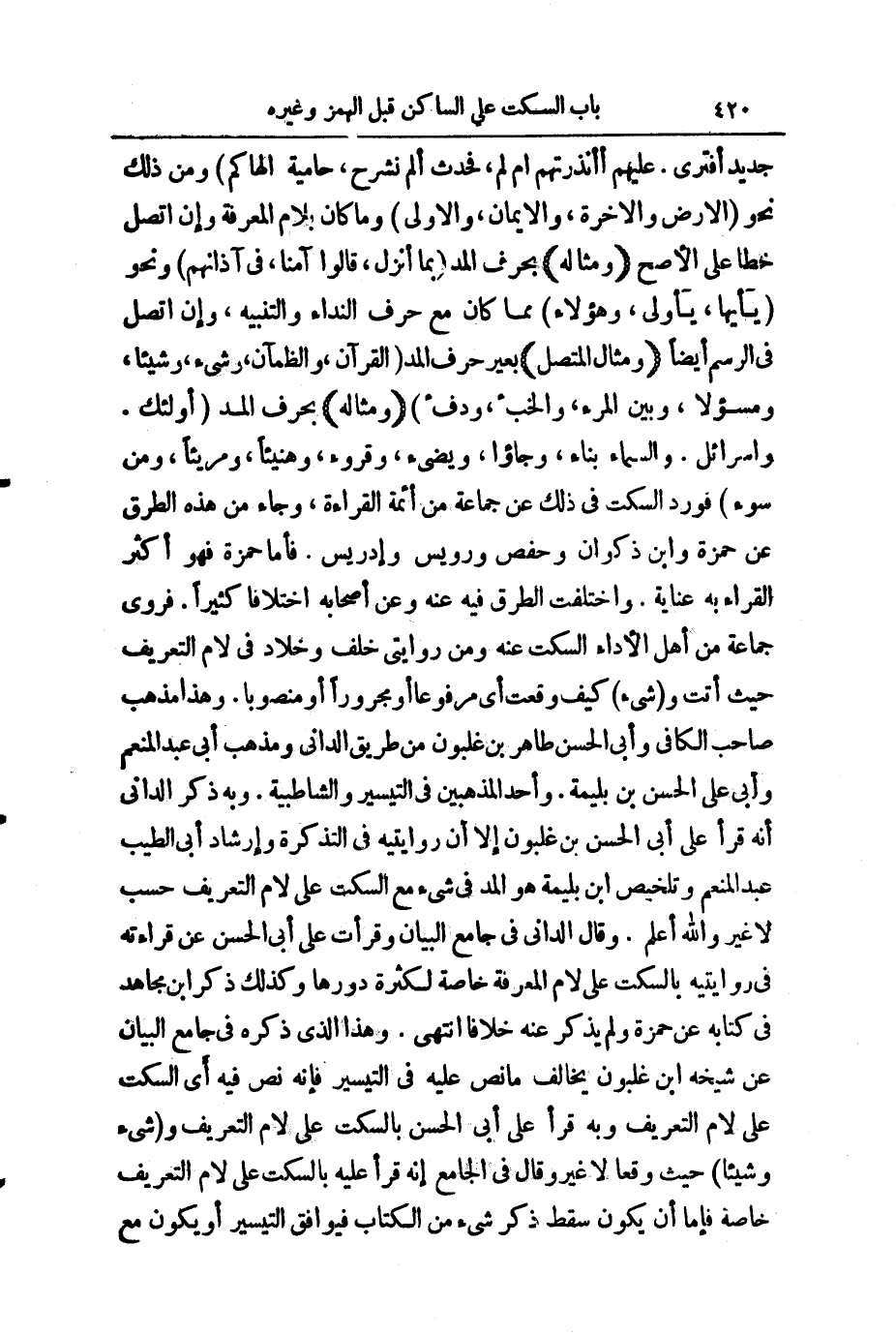 وَقَالَ الدَّانِيُّ فِي " جَامِعِ الْبَيَانِ ": وَقَرَأْتُ عَلَى أَبِي الْحَسَنِ، عَنْ قِرَاءَتِهِ فِي رِوَايَتَيْهِ بِالسَّكْتِ عَلَى لَامِ الْمَعْرِفَةِ خَاصَّةً لِكَثْرَةِ دَوْرِهَا، وَكَذَلِكَ ذَكَرَ ابْنُ مُجَاهِدٍ فِي كِتَابِهِ، عَنْ حَمْزَةَ، وَلَمْ يَذْكُرْ عَنْهُ خِلَافًا. انْتَهَى. وَهَذَا الَّذِي ذَكَرَهُ فِي " جَامِعِ الْبَيَانِ " عَنْ شَيْخِهِ ابْنِ غَلْبُونَ يُخَالِفُ مَا نَصَّ عَلَيْهِ فِي " التَّيْسِيرِ "، فَإِنَّهُ نَصَّ فِيهِ - أَيِ السَّكْتِ - عَلَى لَامِ التَّعْرِيفِ، وَبِهِ قَرَأَ عَلَى أَبِي الْحَسَنِ بِالسَّكْتِ عَلَى لَامِ التَّعْرِيفِ، وَ (شَيْءٍ وَشَيْئًا) حَيْثُ وَقَعَا لَا غَيْرَ، وَقَالَ فِي " الْجَامِعِ ": إِنَّهُ قَرَأَ عَلَيْهِ بِالسَّكْتِ عَلَى لَامِ التَّعْرِيفِ خَاصَّةً، فَإِمَّا أَنْ يَكُونَ سَقَطَ ذِكْرُ شَيْءٍ مِنَ الْكِتَابِ فَيُوَافِقُ " التَّيْسِيرَ "، أَوْ يَكُونَ مَعَ