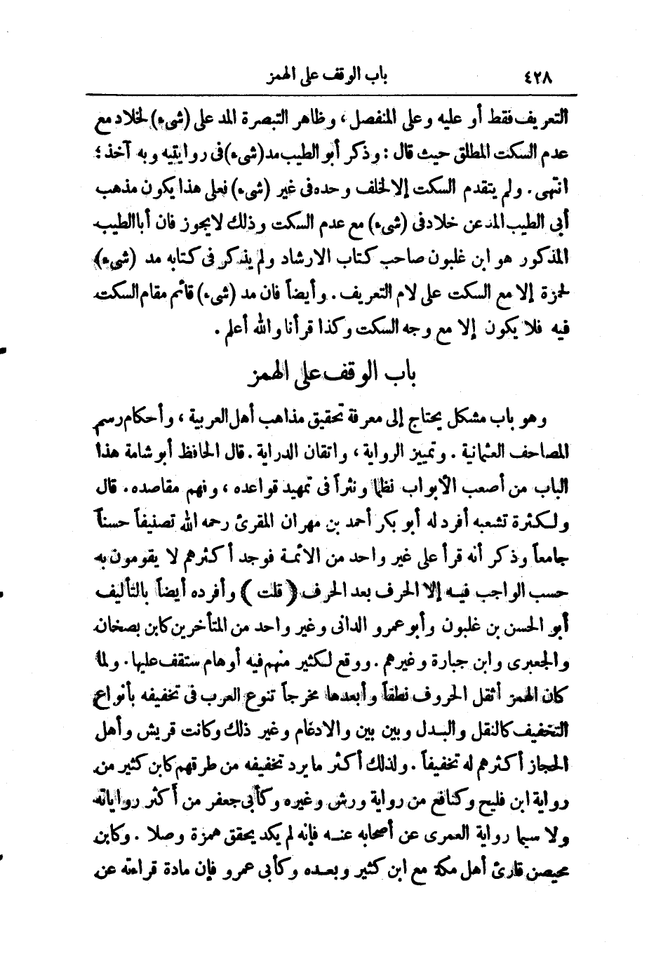 (قُلْتُ) : وَأَفْرَدَهُ أَيْضًا بِالتَّأْلِيفِ أَبُو الْحَسَنِ بْنُ غَلْبُونَ، وَأَبُو عَمْرٍو الدَّانِيُّ، وَغَيْرُ وَاحِدٍ مِنَ الْمُتَأَخِّرِينَ كَابْنِ بَصْخَانَ، وَالْجَعْبَرِيِّ، وَابْنِ جُبَارَةَ، وَغَيْرِهِمْ، وَوَقَعَ لِكَثِيرٍ مِنْهُمْ فِيهِ أَوْهَامٌ سَنَقِفُ عَلَيْهَا، وَلَمَّا كَانَ الْهَمْزُ أَثْقَلَ الْحُرُوفِ نُطْقًا وَأَبْعَدُهَا مَخْرَجًا تَنَوَّعَ الْعَرَبُ فِي تَخْفِيفِهِ بِأَنْوَاعِ التَّخْفِيفِ كَالنَّقْلِ، وَالْبَدَلِ، وَبَيْنَ بَيْنَ، وَالْإِدْغَامِ، وَغَيْرِ ذَلِكَ، وَكَانَتْ قُرَيْشٌ وَأَهْلُ الْحِجَازِ أَكْثَرَهُمْ لَهُ تَخْفِيفًا ; وَلِذَلِكَ أَكْثَرُ مَا يَرِدُ تَخْفِيفُهُ مِنْ طُرُقِهِمْ كَابْنِ كَثِيرٍ مِنْ رِوَايَةِ فُلَيْحٍ، وَكَنَافِعٍ مِنْ رِوَايَةِ وَرْشٍ وَغَيْرِهِ، وَكَأَبِي جَعْفَرٍ مِنْ أَكْثَرِ رِوَايَاتِهِ وَلَا سِيَّمَا رِوَايَةُ الْعُمَرِيِّ، عَنْ أَصْحَابِهِ، عَنْهُ، فَإِنَّهُ لَمْ يَكَدْ يُحَقِّقُ هَمْزَةً وَصْلًا، وَكَابْنِ مُحَيْصِنٍ قَارِئِ أَهْلِ مَكَّةَ مَعَ ابْنِ كَثِيرٍ وَبَعْدِهِ، وَكَأَبِي عَمْرٍو، فَإِنَّ مَادَّةَ قِرَاءَتِهِ عَنْ