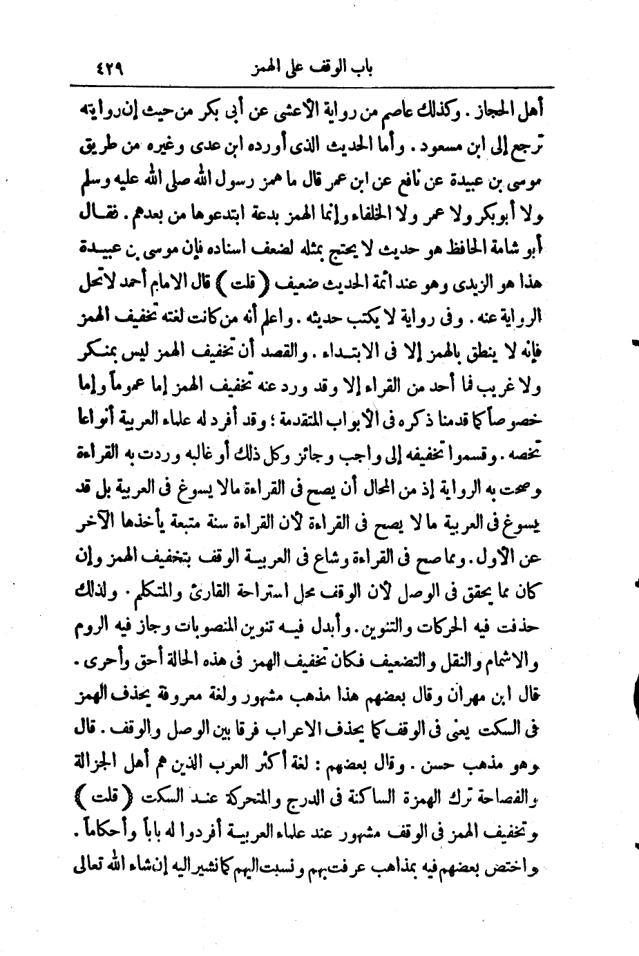 أَهْلِ الْحِجَازِ، وَكَذَلِكَ عَاصِمٌ مِنْ رِوَايَةِ الْأَعْشَى، عَنْ أَبِي بَكْرٍ مِنْ حَيْثُ إِنَّ رِوَايَتَهُ تَرْجِعُ إِلَى ابْنِ مَسْعُودٍ، وَأَمَّا الْحَدِيثُ الَّذِي أَوْرَدَهُ ابْنُ عَدِيٍّ وَغَيْرُهُ مِنْ طَرِيقِ مُوسَى بْنِ عُبَيْدَةَ، عَنْ نَافِعٍ، عَنِ ابْنِ عُمَرَ، قَالَ: مَا هَمَزَ رَسُولُ اللَّهِ - صَلَّى اللَّهُ عَلَيْهِ وَسَلَّمَ - وَلَا أَبُو بَكْرٍ وَلَا عُمَرُ وَلَا الْخُلَفَاءُ، وَإِنَّمَا الْهَمْزُ بِدْعَةٌ ابْتَدَعُوهَا مَنْ بَعْدَهُمْ. فَقَالَ أَبُو شَامَةَ الْحَافِظُ: هُوَ حَدِيثٌ لَا يُحْتَجُّ بِمِثْلِهِ؛ لِضَعْفِ إِسْنَادِهِ، فَإِنَّ مُوسَى بْنَ عُبَيْدَةَ هَذَا هُوَ الزَّيْدِيُّ، وَهُوَ عِنْدَ أَئِمَّةِ الْحَدِيثِ ضَعِيفٌ.