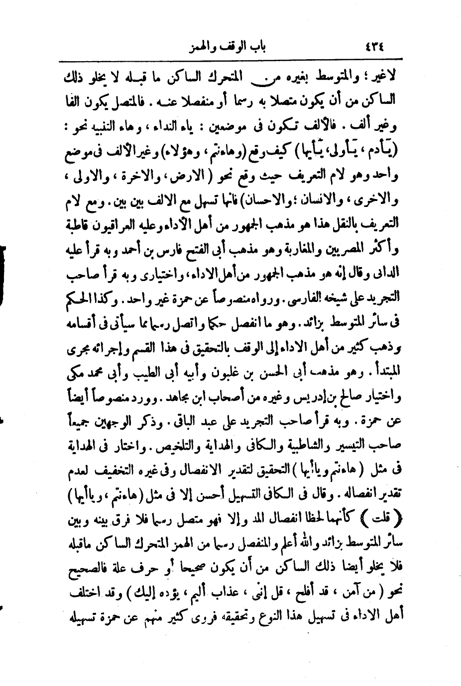 لَا غَيْرَ، وَالْمُتَوَسِّطُ بِغَيْرِهِ مِنَ الْمُتَحَرِّكِ السَّاكِنِ مَا قَبْلَهُ لَا يَخْلُو ذَلِكَ السَّاكِنُ مِنْ أَنْ يَكُونَ مُتَّصِلًا بِهِ رَسْمًا، أَوْ مُنْفَصِلًا عَنْهُ، فَالْمُتَّصِلُ يَكُونُ أَلِفًا وَغَيْرَ أَلِفٍ. فَالْأَلِفُ تَكُونُ فِي مَوْضِعَيْنِ: يَاءُ النِّدَاءِ، وَهَاءُ التَّنْبِيهِ، نَحْوُ: (يَاآدَمُ، يَاأُولِي، يَاأَيُّهَا) كَيْفَ وَقَعَ (وَهَا أَنْتُمْ، وَهَؤُلَاءِ) وَغَيْرَ الْأَلِفِ فِي مَوْضِعٍ وَاحِدٍ، وَهُوَ لَامُ التَّعْرِيفِ حَيْثُ وَقَعَ نَحْوُ (الَارْضِ، وَالَاخِرَةَ، وَالُاولَى، وَالُاخْرَى، وَالِانْسَانَ، وَالِاحْسَانِ) فَإِنَّهَا تُسَهَّلُ مَعَ الْأَلِفِ بَيْنَ بَيْنَ، وَمَعَ لَامِ التَّعْرِيفِ بِالنَّقْلِ هَذَا هُوَ مَذْهَبُ الْجُمْهُورِ مِنْ أَهْلِ الْأَدَاءِ، وَعَلَيْهِ الْعِرَاقِيُّونَ قَاطِبَةً، وَأَكْثَرُ الْمِصْرِيِّينَ وَالْمَغَارِبَةِ، وَهُوَ مَذْهَبُ أَبِي الْفَتْحِ فَارِسِ بْنِ أَحْمَدَ، وَبِهِ قَرَأَ عَلَيْهِ الدَّانِيُّ، وَقَالَ: إِنَّهُ هُوَ مَذْهَبُ الْجُمْهُورِ مِنْ أَهْلِ الْأَدَاءِ، وَاخْتِيَارِي، وَبِهِ قَرَأَ صَاحِبُ " التَّجْرِيدِ " عَلَى شَيْخِهِ الْفَارِسِيِّ، وَرَوَاهُ مَنْصُوصًا عَنْ حَمْزَةَ غَيْرُ وَاحِدٍ. وَكَذَا الْحُكْمُ فِي سَائِرِ الْمُتَوَسِّطِ بِزَائِدٍ، وَهُوَ مَا انْفَصَلَ حُكْمًا وَاتَّصَلَ رَسْمًا مِمَّا سَيَأْتِي فِي أَقْسَامِهِ. وَذَهَبَ كَثِيرٌ مِنْ أَهْلِ الْأَدَاءِ إِلَى الْوَقْفِ بِالتَّحْقِيقِ فِي هَذَا الْقِسْمِ وَإِجْرَائِهِ مَجْرَى الْمُبْتَدَأِ، وَهُوَ مَذْهَبُ أَبِي الْحَسَنِ بْنِ غَلْبُونَ، وَأَبِيهِ أَبِي الطِّيبِ، وَأَبِي مُحَمَّدٍ مَكِّيٍّ، وَاخْتِيَارُ صَالِحِ بْنِ إِدْرِيسَ وَغَيْرِهِ مِنْ أَصْحَابِ ابْنِ مُجَاهِدٍ، وَوَرَدَ مَنْصُوصًا أَيْضًا عَنْ حَمْزَةَ، وَبِهِ قَرَأَ صَاحِبُ " التَّجْرِيدِ " عَلَى عَبْدِ الْبَاقِي. وَذَكَرَ الْوَجْهَيْنِ جَمِيعًا صَاحِبُ " التَّيْسِيرِ "، وَ " الشَّاطِبِيَّةِ "، وَ " الْكَافِي "، وَ " الْهِدَايَةِ "، وَ " التَّلْخِيصِ "، وَاخْتَارَ فِي " الْهِدَايَةِ " فِي مِثْلِ (هَا أَنْتُمْ، وَيَاأَيُّهَا) التَّحْقِيقَ لِتَقْدِيرِ الِانْفِصَالِ، وَفِي غَيْرِهِ التَّخْفِيفَ لِعَدَمِ تَقْدِيرِ انْفِصَالِهِ، وَقَالَ فِي " الْكَافِي ": التَّسْهِيلُ أَحْسَنُ إِلَّا فِي مِثْلِ (هَا أَنْتُمْ، وَيَاأَيُّهَا) .