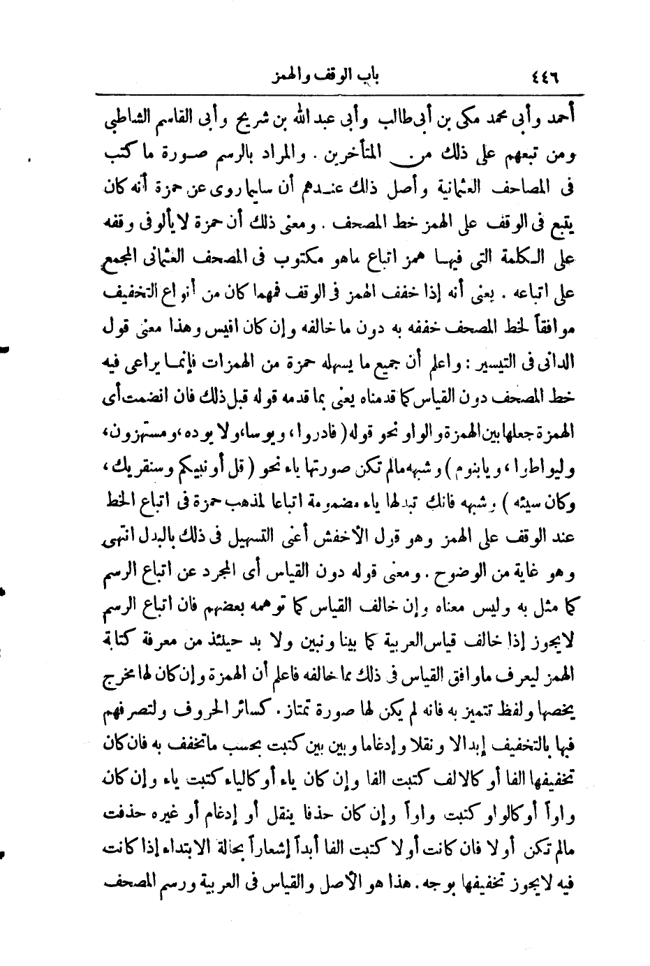 أَحْمَدَ وَأَبِي مُحَمَّدٍ مَكِّيِّ بْنِ أَبِي طَالِبٍ وَأَبِي عَبْدِ اللَّهِ بْنِ شُرَيْحٍ وَأَبِي الْقَاسِمِ الشَّاطِبِيِّ، وَمَنْ تَبِعَهُمْ عَلَى ذَلِكَ مِنَ الْمُتَأَخِّرِينَ. وَالْمُرَادُ بِالرَّسْمِ صُورَةُ مَا كُتِبَ فِي الْمَصَاحِفِ الْعُثْمَانِيَّةِ، وَأَصْلُ ذَلِكَ عِنْدَهُمْ أَنَّ سُلَيْمًا رَوَى عَنْ حَمْزَةَ أَنَّهُ كَانَ يَتَّبِعُ فِي الْوَقْفِ عَلَى الْهَمْزِ خَطَّ الْمُصْحَفِ، وَمَعْنَى ذَلِكَ أَنَّ حَمْزَةَ لَا يَأْلُو فِي وَقْفِهِ عَلَى الْكَلِمَةِ الَّتِي فِيهَا هَمْزٌ اتِّبَاعَ مَا هُوَ مَكْتُوبٌ فِي الْمُصْحَفِ الْعُثْمَانِيِّ الْمُجْمَعِ عَلَى اتِّبَاعِهِ. يَعْنِي أَنَّهُ إِذَا خَفَّفَ الْهَمْزَ فِي الْوَقْفِ فَمَهْمَا كَانَ مِنْ أَنْوَاعِ التَّخْفِيفِ مُوَافِقًا لِخَطِّ الْمُصْحَفِ خَفَّفَهُ بِهِ دُونَ مَا خَالَفَهُ، وَإِنْ كَانَ أَقْيَسَ، وَهَذَا مَعْنَى قَوْلِ الدَّانِيِّ فِي " التَّيْسِيرِ ": وَاعْلَمْ أَنَّ جَمِيعَ مَا يُسَهِّلُهُ حَمْزَةُ مِنَ الْهَمَزَاتِ فَإِنَّمَا يُرَاعَى فِيهِ خَطُّ الْمُصْحَفِ دُونَ الْقِيَاسِ كَمَا قَدَّمْنَاهُ - يَعْنِي بِمَا قَدَّمَهُ قَوْلُهُ قَبْلَ ذَلِكَ - فَإِنِ انْضَمَّتْ، أَيِ الْهَمْزَةُ، جَعَلَهَا بَيْنَ الْهَمْزَةِ وَالْوَاوِ نَحْوُ قَوْلِهِ: (فَادْرُوا، وَبُوسًا، وَلَا يَوُدُهُ، وَمُسْتَهْزُونَ، وَلِيُوَاطُوا، وَيَا بْنُومٍّ) وَشِبْهُهُ مَا لَمْ تَكُنْ صُورَتُهَا يَاءً نَحْوُ (قُلْ أُونَبِّيكُمْ، وَسَنُقْرِيكَ، وَكَانَ سَيِّئُهُ) وَشِبْهُهُ فَإِنَّكَ تُبْدِلُهَا يَاءً مَضْمُومَةً اتِّبَاعًا لِمَذْهَبِ حَمْزَةَ فِي اتِّبَاعِ الْخَطِّ عِنْدَ الْوَقْفِ، وَهُوَ قَوْلُ الْأَخْفَشِ - أَعْنِي التَّسْهِيلَ فِي ذَلِكَ بِالْبَدَلِ - انْتَهَى. وَهُوَ غَايَةٌ مِنَ الْوُضُوحِ. مَعْنَى قَوْلِهِ: دُونَ الْقِيَاسِ - أَيِ الْمُجَرَّدِ عَنِ اتِّبَاعِ الرَّسْمِ كَمَا مَثَّلَ بِهِ، وَلَيْسَ مَعْنَاهُ: وَإِنْ خَالَفَ الْقِيَاسَ - كَمَا تَوَهَّمَهُ بَعْضُهُمْ، فَإِنَّ اتِّبَاعَ الرَّسْمِ لَا يَجُوزُ إِذَا خَالَفَ قِيَاسَ الْعَرَبِيَّةِ كَمَا بَيَّنَّا وَنُبَيِّنُ، وَلَا بُدَّ حِينَئِذٍ مِنْ مَعْرِفَةِ كِتَابَةِ الْهَمْزِ لِيُعْرَفَ مَا وَافَقَ الْقِيَاسَ فِي ذَلِكَ مِمَّا خَالَفَهُ، فَاعْلَمْ أَنَّ الْهَمْزَةَ وَإِنْ كَانَ لَهَا مَخْرَجٌ يَخُصُّهَا وَلَفْظٌ تَتَمَيَّزُ بِهِ فَإِنَّهُ لَمْ يَكُنْ لَهَا صُورَةٌ تَمْتَازُ كَسَائِرِ الْحُرُوفِ، وَلِتَصَرُّفِهِمْ فِيهَا بِالتَّخْفِيفِ إِبْدَالًا، وَنَقْلًا، وَإِدْغَامًا، وَبَيْنَ بَيْنَ، كُتِبَتْ بِحَسَبِ مَا تُخَفَّفُ بِهِ، فَإِنْ كَانَ تَخْفِيفُهَا أَلِفًا، أَوْ كَالْأَلِفِ كُتِبَتْ أَلِفًا، وَإِنْ كَانَ يَاءً أَوْ كَالْيَاءِ كُتِبَتْ يَاءً، وَإِنْ كَانَ وَاوًا أَوْ كَالْوَاوِ كُتِبَتْ وَاوًا، وَإِنْ كَانَ حَذْفًا يُنْقَلُ، أَوْ إِدْغَامًا، أَوْ غَيْرَهُ حُذِفَتْ مَا لَمْ تَكُنْ أَوَّلًا، فَإِنْ كَانَتْ أَوَّلًا كُتِبَتْ أَلِفًا أَبَدًا إِشْعَارًا بِحَالَةِ الِابْتِدَاءِ إِذَا كَانَتْ فِيهِ لَا يَجُوزُ تَخْفِيفُهَا بِوَجْهٍ. هَذَا هُوَ الْأَصْلُ وَالْقِيَاسُ فِي الْعَرَبِيَّةِ وَرَسْمِ الْمُصْحَفِ