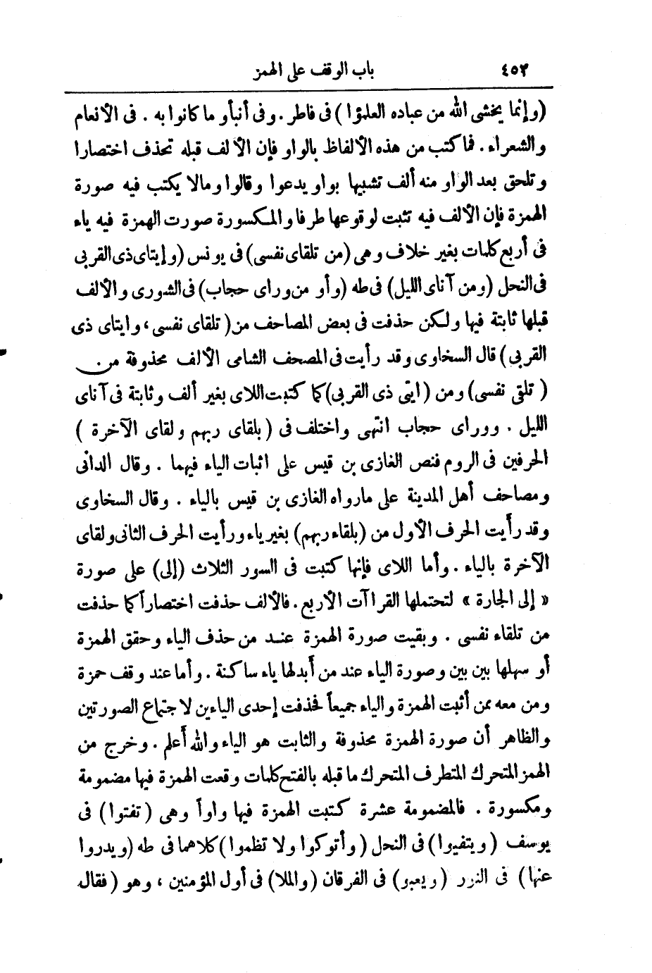 وَ (إِنَّمَا يَخْشَى اللَّهَ مِنْ عِبَادِهِ الْعُلَمَؤُا) فِي فَاطِرٍ، وَفِي (أَنْبَاؤُا مَا كَانُوا بِهِ) فِي الْأَنْعَامِ وَالشُّعَرَاءِ. فَمَا كُتِبَ مِنْ هَذِهِ الْأَلْفَاظِ بِالْوَاوِ، فَإِنَّ الْأَلِفَ قَبْلَهُ تُحْذَفُ اخْتِصَارًا، وَتُلْحَقُ بَعْدَ الْوَاوِ مِنْهُ أَلِفٌ تَشْبِيهًا بِوَاوِ يَدْعُوا، وَقَالُوا: وَمَا لَا يُكْتَبُ فِيهِ صُورَةُ الْهَمْزَةِ فَإِنَّ الْأَلِفَ فِيهِ تُثْبَتُ لِوُقُوعِهَا طَرَفًا وَالْمَكْسُورَةُ صُوِّرَتِ الْهَمْزَةُ فِيهِ يَاءً فِي أَرْبَعِ كَلِمَاتٍ بِغَيْرِ خِلَافٍ، وَهِيَ (مِنْ تِلْقَايِ نَفْسِي) فِي يُونُسَ وَ (إِيتَايِ ذِي الْقُرْبَى) فِي النَّحْلِ، وَ (مِنْ آنَايِ اللَّيْلِ) فِي طه، وَ (أَوْ مِنْ وَرَايِ حِجَابٍ) فِي الشُّورَى، وَالْأَلِفُ قَبْلَهَا ثَابِتَةٌ فِيهَا، وَلَكِنْ حُذِفَتْ فِي بَعْضِ الْمَصَاحِفِ مِنْ (تِلْقَايِ نَفْسِي) ، وَ (إِيتَايِ ذِي الْقُرْبَى) قَالَ السَّخَاوِيُّ قَدْ رَأَيْتُ فِي الْمُصْحَفِ الشَّامِيِّ الْأَلِفَ مَحْذُوفَةً مِنْ (تِلْقَيِ نَفْسِي) ، وَمِنْ (ايتِي ذِي الْقُرْبَى) كَمَا كُتِبَتْ إِلَى بِغَيْرِ أَلِفٍ، وَثَابِتَةٌ فِي آنَايِ اللَّيْلِ، وَوَرَايِ حِجَابٍ. انْتَهَى. وَاخْتُلِفَ فِي (بِلِقَايِ رَبِّهِمْ، وَلِقَايِ الْآخِرَةِ) الْحَرْفَيْنِ فِي الرُّومِ، فَنَصَّ الْغَازِي بْنُ قَيْسٍ عَلَى إِثْبَاتِ الْيَاءِ فِيهِمَا، وَقَالَ الدَّانِيُّ: وَمَصَاحِفُ أَهْلِ الْمَدِينَةِ عَلَى مَا رَوَاهُ الْغَازِي بْنُ قَيْسٍ بِالْيَاءِ. وَقَالَ السَّخَاوِيُّ: وَقَدْ رَأَيْتُ الْحَرْفَ الْأَوَّلَ مِنْ بِلِقَاءِ رَبِّهِمْ بِغَيْرِ يَاءٍ، وَرَأَيْتُ الْحَرْفَ الثَّانِيَ " وَلِقَايِ الْآخِرَةِ " بِالْيَاءِ. وَأَمَّا اللَّايْ فَإِنَّهَا كُتِبَتْ فِي السُّوَرِ الثَّلَاثِ (إِلَى) عَلَى صُورَةِ " إِلَى الْجَارَةِ لِتَحْتَمِلَهَا الْقِرَاءَاتُ الْأَرْبَعُ. فَالْأَلِفُ حُذِفَتِ اخْتِصَارًا كَمَا حُذِفَتْ مِنْ تِلْقَاءِ نَفْسِي وَبَقِيَتْ صُورَةُ الْهَمْزَةِ عِنْدَ مَنْ حَذَفَ الْيَاءَ وَحَقَّقَ الْهَمْزَةَ، أَوْ سَهَّلَهَا بَيْنَ بَيْنَ، وَصُورَةُ الْيَاءِ عِنْدَ مَنْ أَبْدَلَهَا يَاءً سَاكِنَةً، وَأَمَّا عِنْدَ وَقْفِ حَمْزَةَ، وَمَنْ مَعَهُ مِمَّنْ أَثْبَتَ الْهَمْزَةَ وَالْيَاءَ جَمِيعًا، فَحُذِفَتْ إِحْدَى الْيَاءَيْنِ لِاجْتِمَاعِ الصُّورَتَيْنِ، وَالظَّاهِرُ أَنَّ صُورَةَ الْهَمْزَةِ مَحْذُوفَةٌ، وَالثَّابِتُ هُوَ الْيَاءُ، وَاللَّهُ أَعْلَمُ.