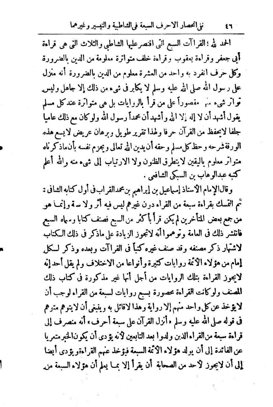 الْحَمْدُ لِلَّهِ؛ الْقِرَاءَاتُ السَّبْعُ الَّتِي اقْتَصَرَ عَلَيْهَا الشَّاطِبِيُّ وَالثَّلَاثُ الَّتِي هِيَ قِرَاءَةُ أَبِي جَعْفَرٍ وَقِرَاءَةُ يَعْقُوبَ وَقِرَاءَةُ خَلَفٍ مُتَوَاتِرَةٌ مَعْلُومَةٌ مِنَ الدِّينِ بِالضَّرُورَةِ وَكُلُّ حَرْفٍ انْفَرَدَ بِهِ وَاحِدٌ مِنَ الْعَشَرَةِ مَعْلُومٌ مِنَ الدِّينِ بِالضَّرُورَةِ أَنَّهُ مُنَزَّلٌ عَلَى رَسُولِ اللَّهِ - صَلَّى اللَّهُ عَلَيْهِ وَسَلَّمَ - لَا يُكَابِرُ فِي شَيْءٍ مِنْ ذَلِكَ إِلَّا جَاهِلٌ، وَلَيْسَ تَوَاتُرُ شَيْءٍ مِنْهَا مَقْصُورًا عَلَى مَنْ قَرَأَ بِالرِّوَايَاتِ، بَلْ هِيَ مُتَوَاتِرَةٌ عِنْدَ كُلِّ مُسْلِمٍ يَقُولُ أَشْهَدَ أَنْ لَا إِلَهَ إِلَّا اللَّهُ وَأَشْهَدُ أَنَّ مُحَمَّدًا رَسُولُ اللَّهِ، وَلَوْ كَانَ مَعَ ذَلِكَ عَامِّيًّا جِلْفًا لَا يَحْفَظُ مِنَ الْقُرْآنِ حَرْفًا، وَلِهَذَا تَقْرِيرٌ طَوِيلٌ وَبُرْهَانٌ عَرِيضٌ لَا يَسَعُ هَذِهِ الْوَرَقَةَ شَرْحُهُ وَحَظُّ كُلِّ مُسْلِمٍ وَحَقُّهُ أَنْ يَدِينَ لِلَّهِ تَعَالَى وَيَجْزِمَ نَفْسَهُ بِأَنَّ مَا ذَكَرْنَاهُ مُتَوَاتِرٌ مَعْلُومٌ بِالْيَقِينِ لَا يَتَطَرَّقُ الظُّنُونُ وَلَا الِارْتِيَابُ إِلَى شَيْءٍ مِنْهُ وَاللَّهُ أَعْلَمُ. كَتَبَهُ عَبْدُ الْوَهَّابِ بْنُ السُّبْكِيِّ الشَّافِعِيُّ.