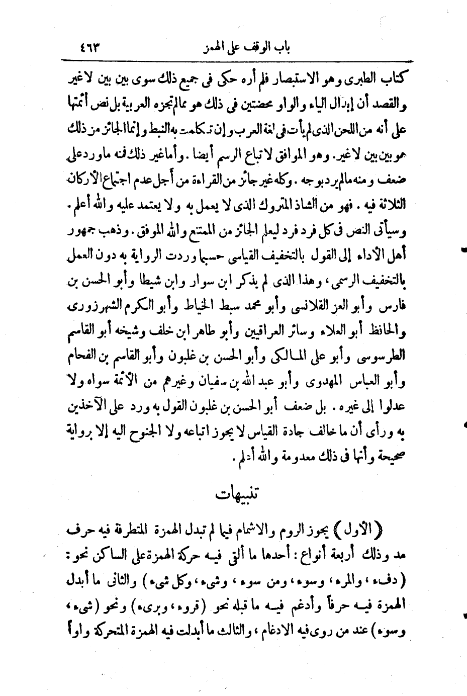 وَسَيَأْتِي النَّصُّ فِي كُلِّ فَرْدٍ فَرْدِ لِيُعْلَمَ الْجَائِزُ مِنَ الْمُمْتَنَعِ وَاللَّهُ الْمُوَفِّقُ. وَذَهَبَ جُمْهُورُ أَهْلِ الْأَدَاءِ إِلَى الْقَوْلِ بِالتَّخْفِيفِ الْقِيَاسِيِّ حَسْبَمَا وَرَدَتِ الرِّوَايَةُ بِهِ دُونَ الْعَمَلِ بِالتَّخْفِيفِ الرَّسْمِيِّ، وَهَذَا الَّذِي لَمْ يَذْكُرِ ابْنُ سَوَّارٍ وَابْنُ شَيْطَا وَأَبُو الْحَسَنِ بْنُ فَارِسٍ وَأَبُو الْعِزِّ الْقَلَانِسِيُّ، وَأَبُوَ مُحَمَّدٍ سِبْطُ الْخَيَّاطِ وَأَبُو الْكَرَمِ الشَّهْرَزُورِيُّ، وَالْحَافِظُ أَبُو الْعَلَاءِ، وَسَائِرُ الْعِرَاقِيِّينَ، وَأَبُو طَاهِرِ بْنُ خَلَفٍ، وَشَيْخُهُ أَبُو الْقَاسِمِ الطَّرَسُوسِيُّ وَأَبُو عَلِيٍّ الْمَالِكِيُّ وَأَبُو الْحَسَنِ بْنُ غَلْبُونَ وَأَبُو الْقَاسِمِ بْنُ الْفَحَّامِ وَأَبُو الْعَبَّاسِ الْمَهْدَوِيُّ، وَأَبُوَ عَبْدِ اللَّهِ بْنُ سُفْيَانَ، وَغَيْرُهُمْ مِنَ الْأَئِمَّةِ سِوَاهُ، وَلَا عَدَلُوا إِلَى غَيْرِهِ، بَلْ ضَعَّفَ أَبُو الْحَسَنِ بْنُ غَلْبُونَ الْقَوْلَ بِهِ، وَرَدَّ عَلَى الْآخِذِينَ بِهِ، وَرَأَى أَنَّ مَا خَالَفَ جَادَّةَ الْقِيَاسِ لَا يَجُوزُ اتِّبَاعُهُ وَلَا الْجُنُوحُ إِلَيْهِ إِلَّا بِرِوَايَةٍ صَحِيحَةٍ، وَأَنَّهَا فِي ذَلِكَ مَعْدُومَةٌ، وَاللَّهُ أَعْلَمُ.