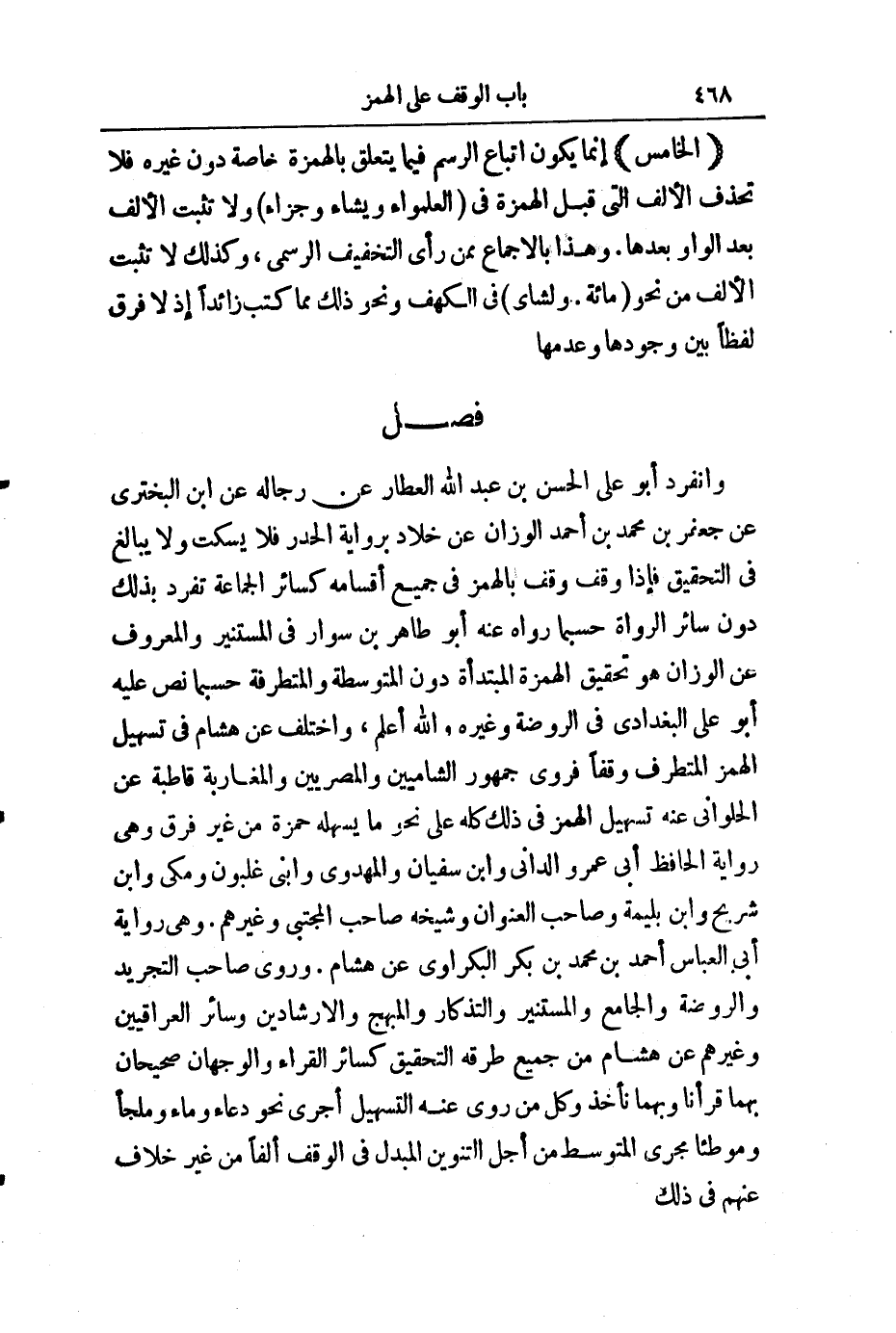 (الْخَامِسُ) إِنَّمَا يَكُونُ اتِّبَاعُ الرَّسْمِ فِيمَا يَتَعَلَّقُ بِالْهَمْزَةِ خَاصَّةً دُونَ غَيْرِهِ، فَلَا تُحْذَفُ الْأَلِفُ الَّتِي قَبْلَ الْهَمْزَةِ فِي (الْعُلَمَواءُ وَيَشَاءُ وَجَزَاءُ) ، وَلَا تَثْبُتُ الْأَلِفُ بَعْدِ الْوَاوِ بَعْدَهَا. وَهَذَا بِالْإِجْمَاعِ مِمَّنْ رَأَى التَّخْفِيفَ الرَّسْمِيَّ، وَكَذَلِكَ لَا تَثْبُتُ الْأَلِفُ مِنْ نَحْوِ (مِائَةٌ، وَلِشَايٍ فِي الْكَهْفِ) وَنَحْوِ ذَلِكَ مِمَّا كُتِبَ زَائِدًا، إِذْ لَا فَرْقَ لَفْظًا بَيْنَ وُجُودِهَا وَعَدَمِهَا.
